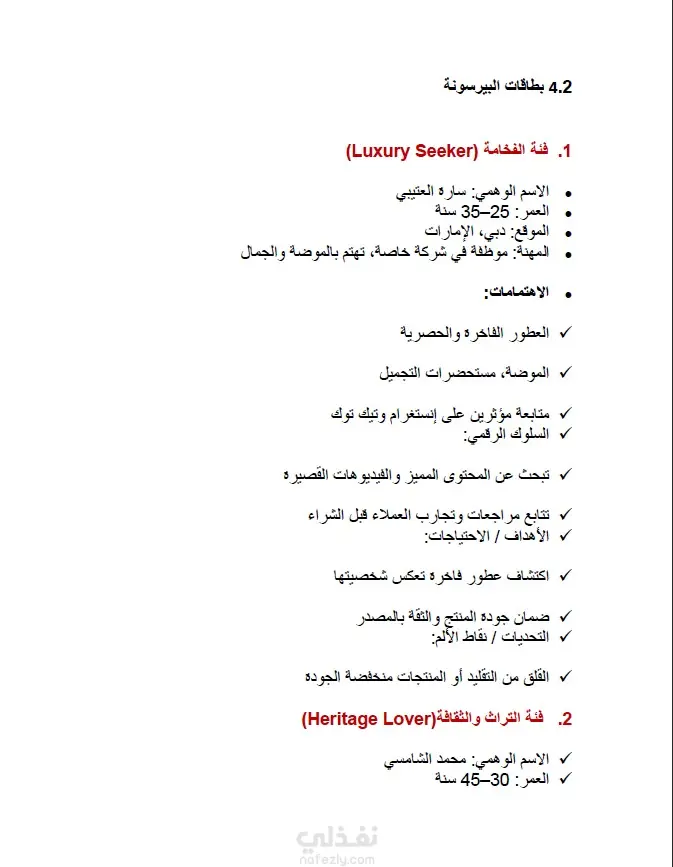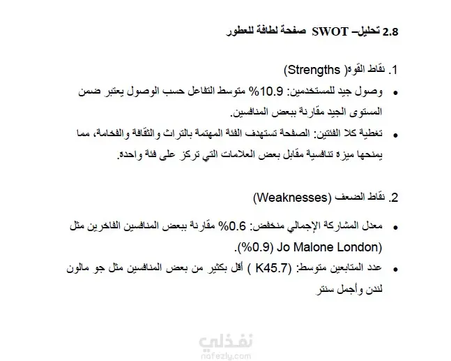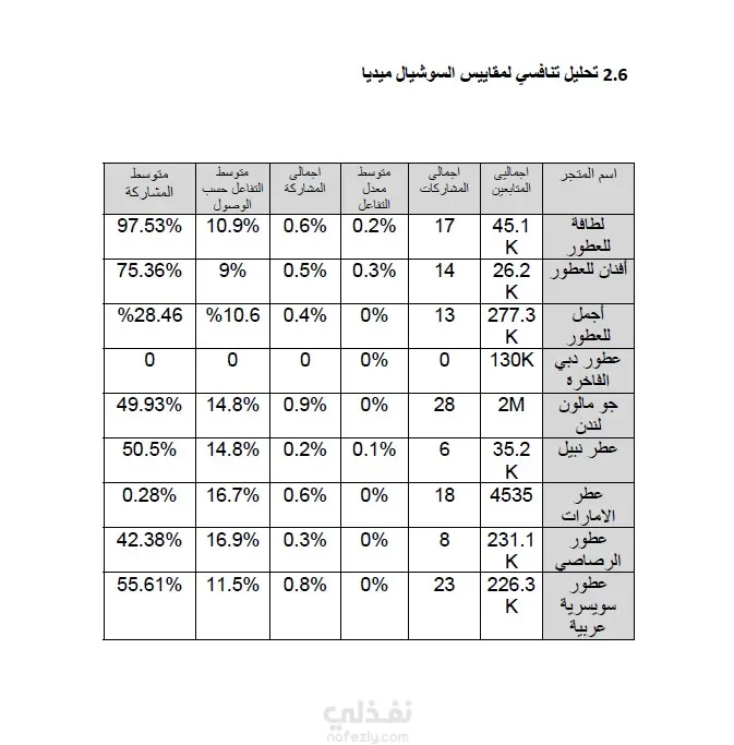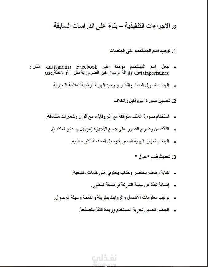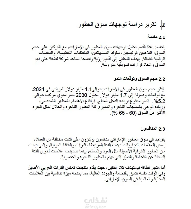 تقييم الأداء الحالي لصفحة شركة لطافة وتقديم خطة تطوير رقمية شاملة. لرفع كفاءة التواجد الرقمي، زيادة معدلات التفاعل، وتعزيز ثقة العملاء ضد المنتجات المقلدة. العمل موجه لشركة "لطافة للعطور" (Lattafa Perfumes) والمتخصصين في تسويق العطور. التركيز الأساسي على منصة فيسبوك مع خطة للتوسع في إنستغرام وتيك توك وسناب شات في سوق الإمارات. تم إعداد التقرير للفترة الزمنية 2025/2026. تتبع هذه الدراسة منهجية تحليلية دقيقة لضمان تحقيق نمو مستدام، وتتمثل في الخطوات التالية: تحليل SWOT: تحديد نقاط القوة مثل متوسط التفاعل حسب الوصول (10.9%)، ونقاط الضعف مثل انخفاض عدد المتابعين مقارنة بالمنافسين الكبار. بناء الشخصيات (Buyer Personas): تحديد 4 فئات مستهدفة بدقة (الباحثين عن الفخامة، محبي التراث، الشباب، والمهتمين بالعطور الحلال). خطة المحتوى والتطوير: وضع جدول زمني للنشر (3-5 منشورات أسبوعياً) وتحديد الأوقات المثالية للتفاعل (أيام الخميس والجمعة والسبت). التوصيات الفنية: توحيد اسم المستخدم، تحسين وصف "حول" الكلمات المفتاحية، واستخدام تقنيات مثل الواقع المعزز (AR) لزيادة التفاعل. المرحلة الأولى: التحليل المبدئي والتعريف تحديد أهداف التقرير: وضع خارطة طريق لتقييم الأداء الحالي لصفحة فيسبوك وتحديد فرص التحسين لدعم أهداف الشركة التسويقية. التعريف بالعلامة التجارية: صياغة نبذة عن شركة لطافة وتحديد رؤيتها في بناء علاقة مستدامة مع جمهورها وتحسين استراتيجيات المحتوى .المرحلة الثانية: دراسة وتحليل السوق (Market Research)تحليل حجم السوق والنمو: رصد حجم سوق العطور في الإمارات وتقدير معدل النمو السنوي المركب بنسبة 5.2% حتى عام 2030.تحديد فئات المنتجات الرائجة: التركيز على حصة العطور الفاخرة والحلال التي تمثل 60-65% من السوق.دراسة اتجاهات المستهلكين: تحليل سلوك الشباب الإماراتي وبحثهم عن روائح تعكس شخصيتهم، وتأثرهم بمنصات سناب شات وإنستغرام .المرحلة الثالثة: التحليل التنافسي (Competitive Analysis)تصنيف المنافسين: حصر المنافسين الإقليميين والدوليين (مثل أجمل، الرصاصي، وجو مالون) وتصنيفهم حسب الفئة المستهدفة. تحليل مقاييس السوشيال ميديا: إجراء مقارنة رقمية تشمل إجمالي المتابعين، معدل التفاعل، وعدد المشاركات لكل منافس.التمثيل البياني: تحويل البيانات الرقمية إلى رسوم بيانية لتسهيل مقارنة حجم المتابعين والتفاعل بين لطافة والمنافسين. المرحلة الرابعة: التقييم الاستراتيجي (SWOT & Analysis)تحليل نقاط القوة والضعف: رصد التفوق في "متوسط التفاعل حسب الوصول" مقابل ضعف "إجمالي المتابعين".تحديد الفرص والتهديدات: استكشاف فرص التوسع في تيك توك ومواجهة تهديد المنتجات المقلدة.بناء شخصيات المشتري (Buyer Personas): تصميم 4 بطاقات تفصيلية للجمهور المستهدف تشمل (الباحث عن الفخامة، محب التراث، الشباب، والمهتم بالمنتجات الطبيعية).المرحلة الخامسة: وضع خطة العمل والتطوير تحسين الهوية الرقمية: وضع شروط لتوحيد اسم المستخدم وتحسين صور البروفايل والغلاف لتناسب الأجهزة المختلفة. استراتيجية المحتوى: تحديد نسب توزيع المنشورات (منتجات، عروض، تفاعل، قصص) وجدولة أوقات النشر المثالية.تطوير التفاعل والوصول: وضع إجراءات لتعزيز التعاون مع المؤثرين المحليين واستخدام تقنيات مثل AR لتعزيز تجربة المستخدم .