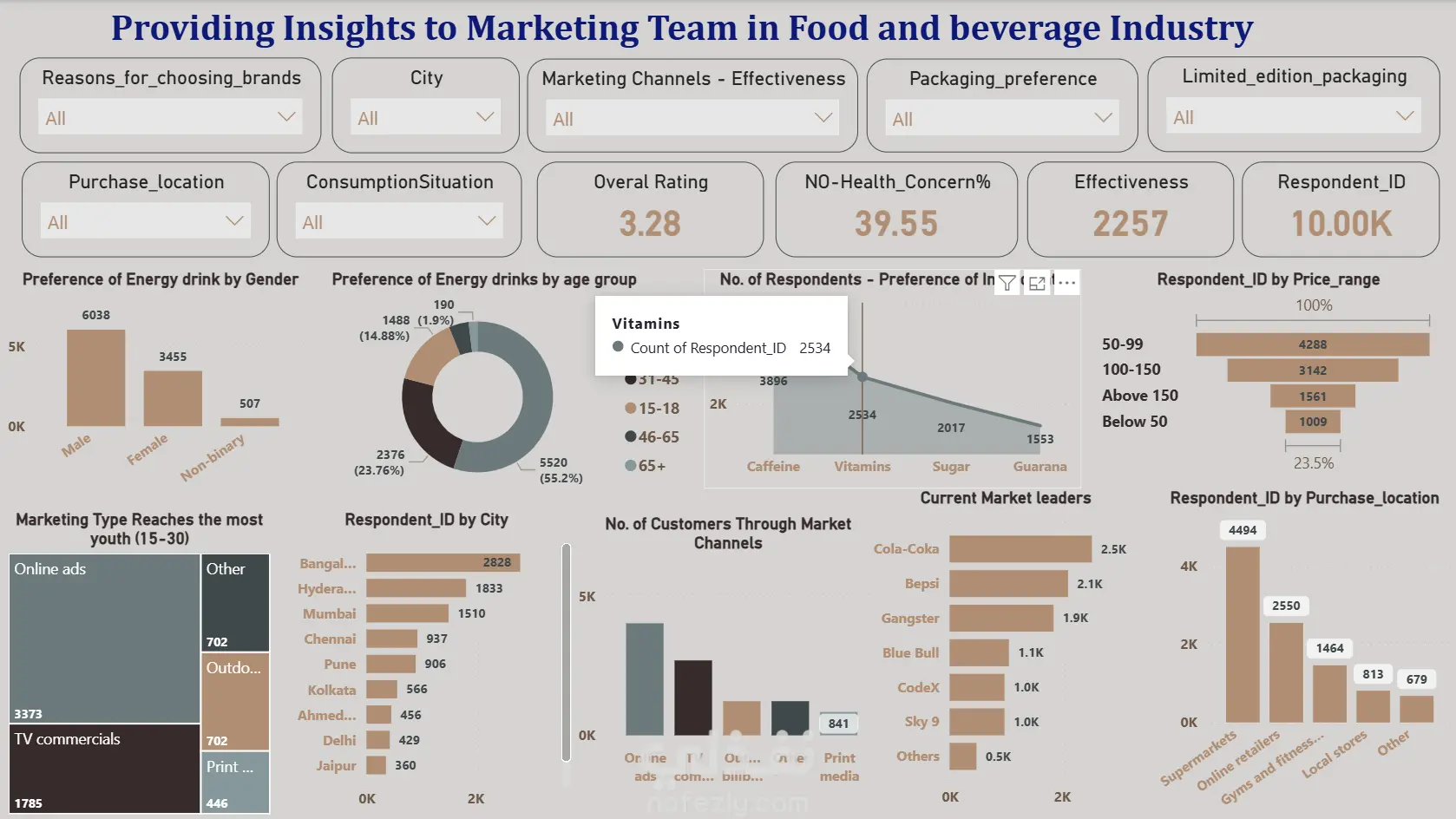 تم تصميم هذه اللوحة (Dashboard) لتحويل البيانات الخام لقطاع الأغذية والمشروبات إلى رؤى استراتيجية تدعم فرق التسويق واتخاذ القرار. اعتمدت في هذا العمل على مبدأ "وضوح المعلومة وسرعة الوصول إليها". أبرز نقاط التحليل في المشروع: تحليل الشريحة المستهدفة: دراسة التفضيلات حسب الفئة العمرية (تركز على فئة 15-30 عامًا) والنوع الاجتماعي. فعالية القنوات التسويقية: تحديد المنصات الأكثر تأثيرًا (الإعلانات عبر الإنترنت مقابل التلفاز). تفضيلات المنتجات: تحليل المكونات المطلوبة (Vitamins, Caffeine, Sugar) وتأثير نوع التغليف على قرار الشراء. الموقع الجغرافي ونقاط البيع: تحديد المدن الأعلى استهلاكًا وأماكن الشراء المفضلة (Supermarkets vs Online). تحليل المنافسين: مراقبة الحصة السوقية لرواد السوق (Current Market Leaders). الأدوات المستخدمة: Power BI DAX / Data Modeling لضمان دقة الأرقام والترابط بين الفلاتر. تنسيق بصري (UI/UX) مريح للعين يعتمد على الألوان الاحترافية المتناسقة. لماذا تختار هذا العمل؟ تفاعلية كاملة: إمكانية الفلترة حسب المدينة، القناة التسويقية، أو نوع التغليف. رؤى عملية (Actionable Insights): لا تعرض أرقامًا فحسب، بل توضح للشركة أين يجب أن تستثمر ميزانيتها التسويقية. دقة البيانات: معالجة كاملة للبيانات لضمان عدم وجود تكرار أو أخطاء إحصائية.
