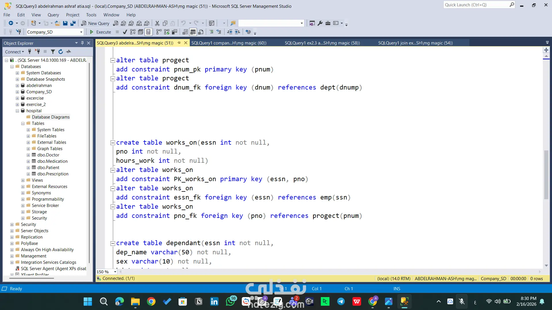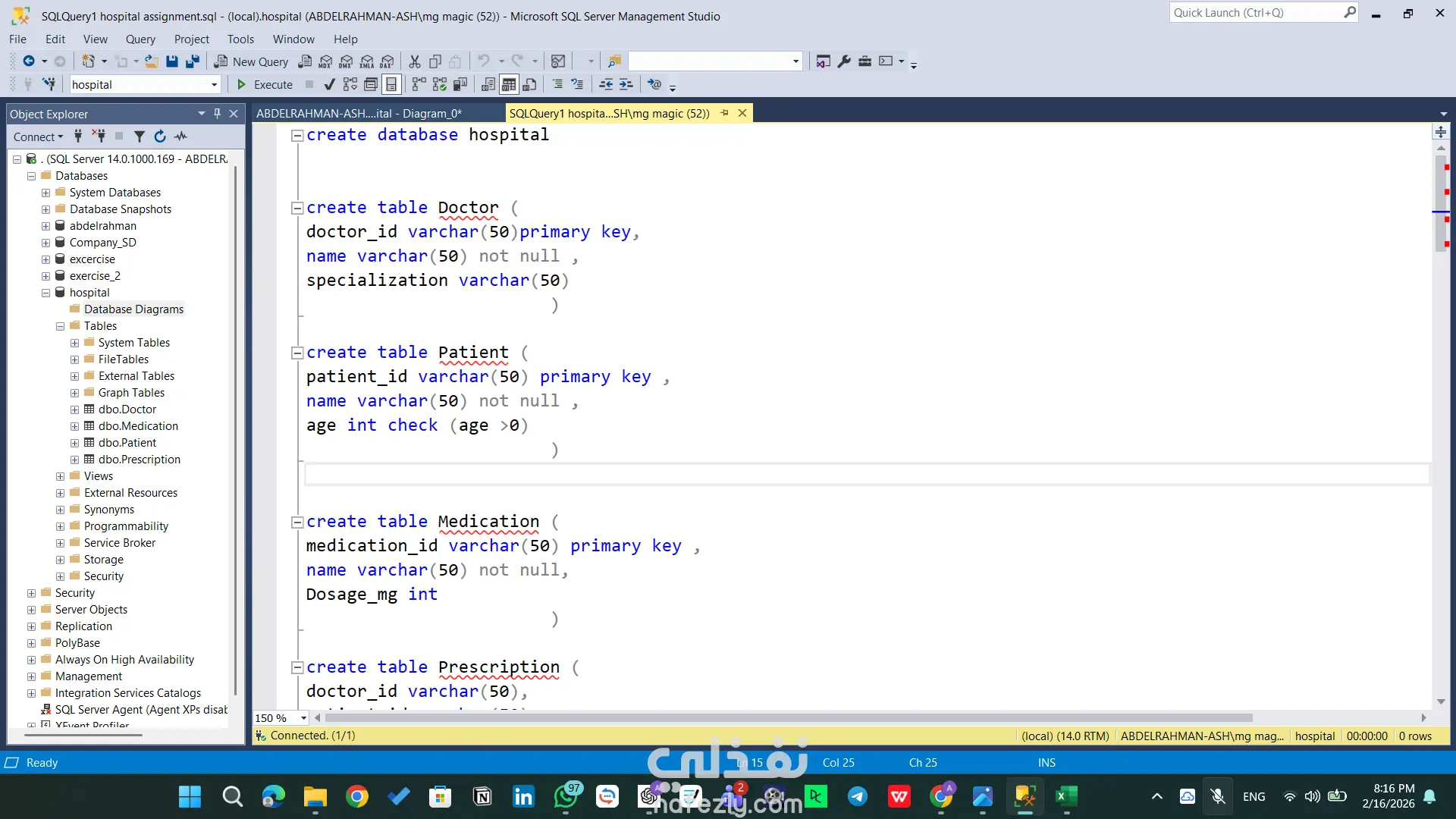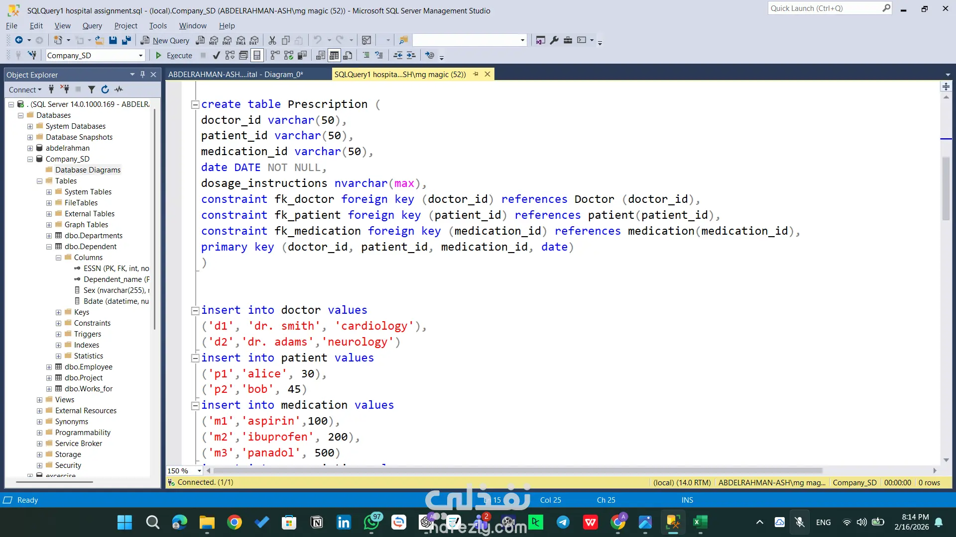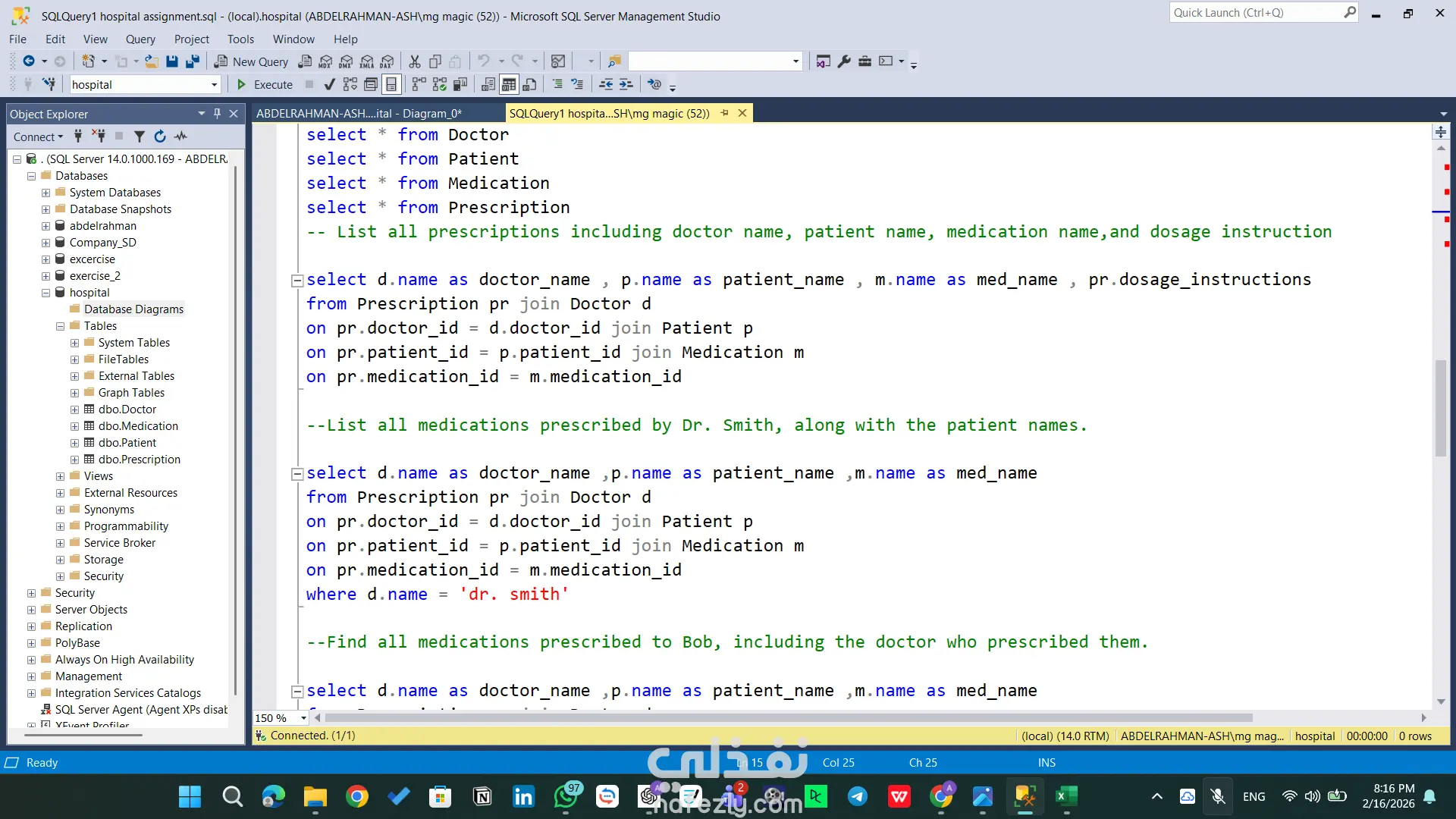 مشروع تقني متقدم يركز على بناء بنية تحتية برمجية قوية لقواعد البيانات باستخدام SQL Server. يتضمن المشروع تصميم مخططات الجداول (Schemas)، بناء العلاقات المعقدة، وكتابة استعلامات ذكية لاستخراج التقارير وتحليل البيانات بكفاءة عالية. المهام والقدرات التقنية الظاهرة في المشروع: هيكلة البيانات (Database Architecture): تصميم جداول محورية مثل (Doctor, Patient, Medication, Prescription) مع تحديد دقيق لأنواع البيانات. بناء علاقات منطقية متينة باستخدام Primary Keys و Foreign Keys لضمان تكامل البيانات (Referential Integrity). إدارة الموارد البشرية والعمليات: تصميم نظام متكامل للموظفين والأقسام (emp, dept, dept_loc, project) يربط الموظفين بالمشاريع وساعات العمل. الاستعلامات المتقدمة (Advanced SQL Queries): استخدام Joins لربط 4 جداول معاً واستخراج تقارير شاملة (اسم الطبيب، المريض، الدواء، وطريقة الاستخدام) في استعلام واحد. توظيف العمليات الحسابية والتجميعية (Aggregation) مثل COUNT و GROUP BY و HAVING لاستخراج إحصائيات دقيقة (مثل عدد الأدوية التي وصفها كل طبيب). كتابة استعلامات فرعية (Subqueries) معقدة للوصول إلى بيانات محددة جداً (مثل استخراج أسماء الأطباء الذين وصفوا دواءً معيناً). مخططات العلاقات (ERD): تصميم ورسم الـ Database Diagram لتوضيح مسار البيانات والعلاقات بين الكيانات بشكل مرئي احترافي يسهل على المطورين فهمه. الأدوات المستخدمة: Microsoft SQL Server Management Studio (SSMS). لغة SQL (DDL for creation, DML for manipulation).