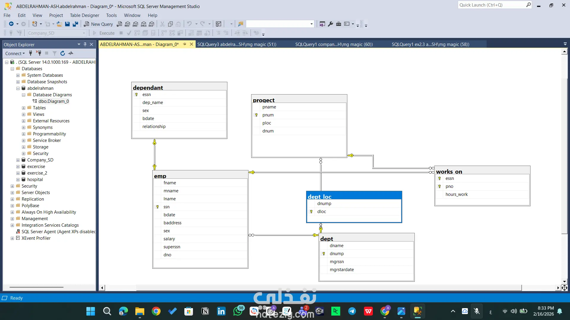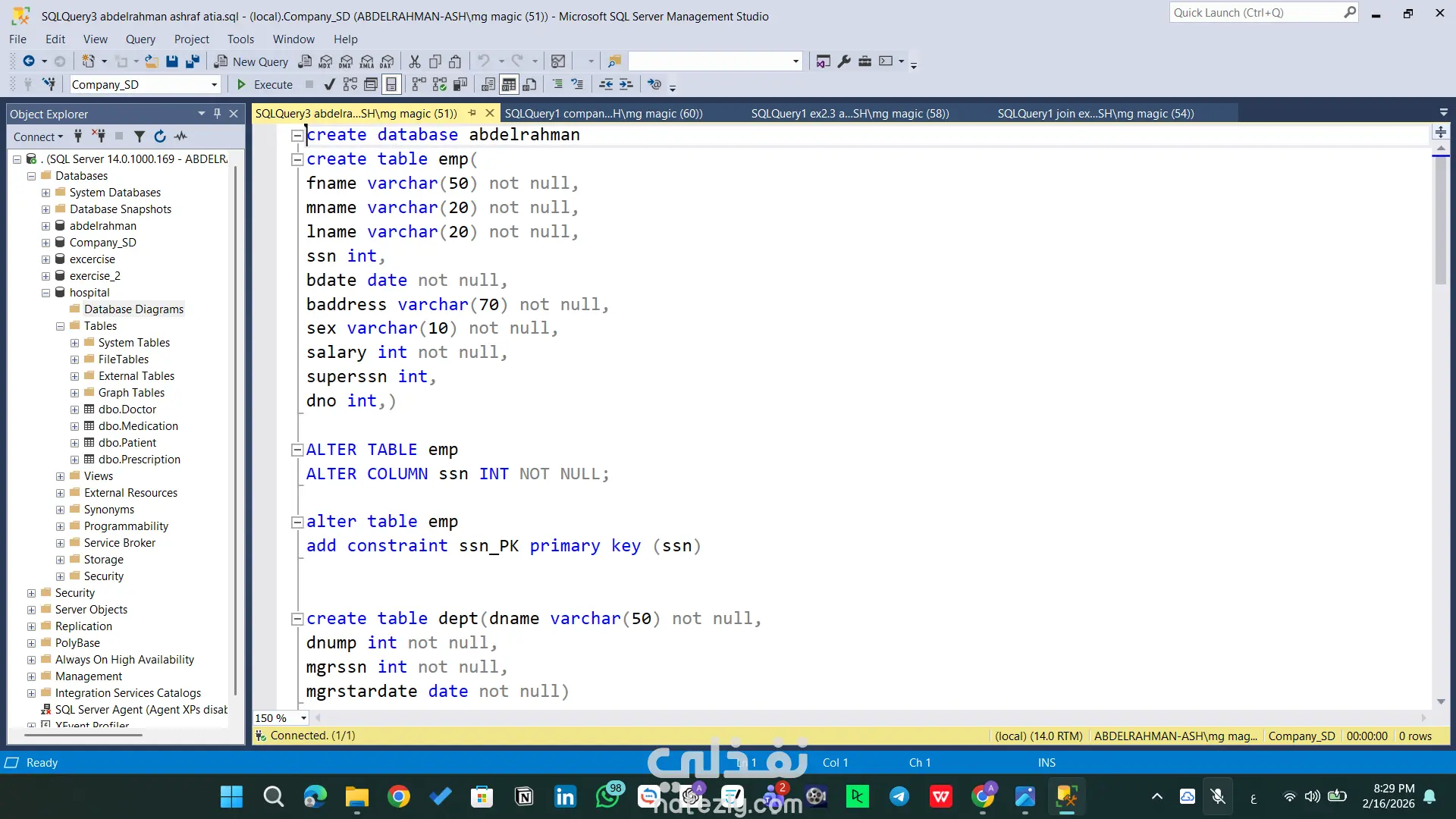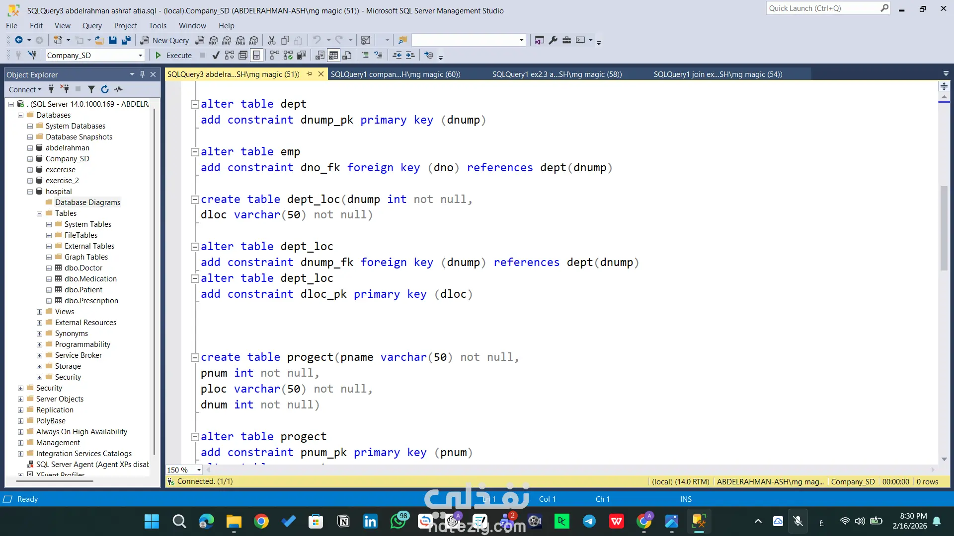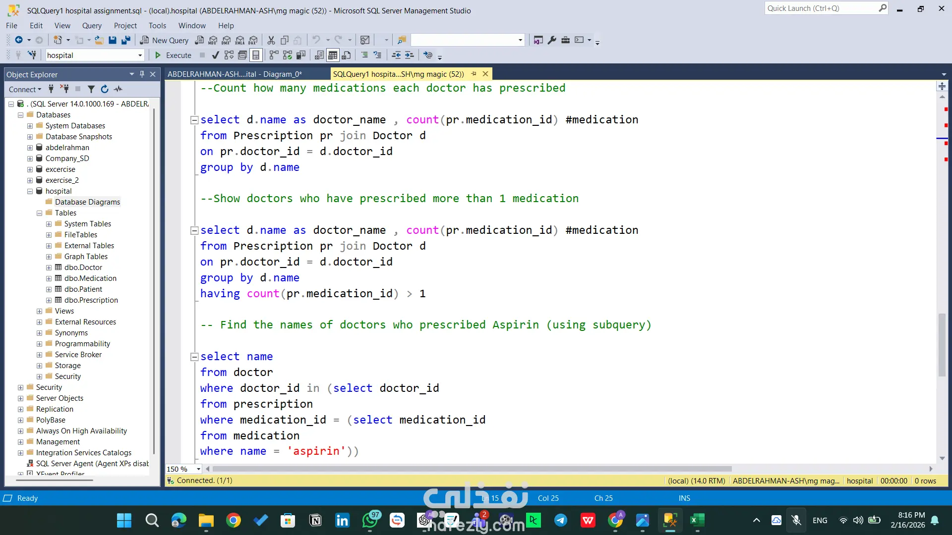 مشروع تقني متقدم يركز على بناء بنية تحتية برمجية قوية لقواعد البيانات باستخدام SQL Server. يتضمن المشروع تصميم مخططات الجداول (Schemas)، بناء العلاقات المعقدة، وكتابة استعلامات ذكية لاستخراج التقارير وتحليل البيانات بكفاءة عالية. المهام والقدرات التقنية الظاهرة في المشروع: هيكلة البيانات (Database Architecture): تصميم جداول محورية مثل (Doctor, Patient, Medication, Prescription) مع تحديد دقيق لأنواع البيانات. بناء علاقات منطقية متينة باستخدام Primary Keys و Foreign Keys لضمان تكامل البيانات (Referential Integrity). إدارة الموارد البشرية والعمليات: تصميم نظام متكامل للموظفين والأقسام (emp, dept, dept_loc, project) يربط الموظفين بالمشاريع وساعات العمل. الاستعلامات المتقدمة (Advanced SQL Queries): استخدام Joins لربط 4 جداول معاً واستخراج تقارير شاملة (اسم الطبيب، المريض، الدواء، وطريقة الاستخدام) في استعلام واحد. توظيف العمليات الحسابية والتجميعية (Aggregation) مثل COUNT و GROUP BY و HAVING لاستخراج إحصائيات دقيقة (مثل عدد الأدوية التي وصفها كل طبيب). كتابة استعلامات فرعية (Subqueries) معقدة للوصول إلى بيانات محددة جداً (مثل استخراج أسماء الأطباء الذين وصفوا دواءً معيناً). مخططات العلاقات (ERD): تصميم ورسم الـ Database Diagram لتوضيح مسار البيانات والعلاقات بين الكيانات بشكل مرئي احترافي يسهل على المطورين فهمه. الأدوات المستخدمة: Microsoft SQL Server Management Studio (SSMS). لغة SQL (DDL for creation, DML for manipulation).