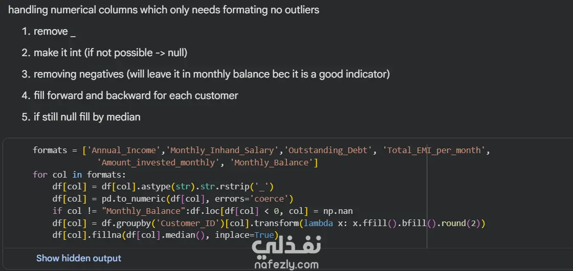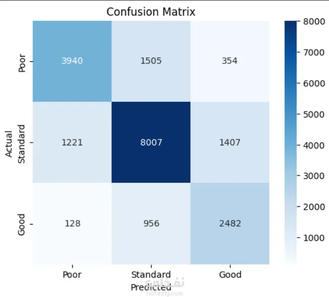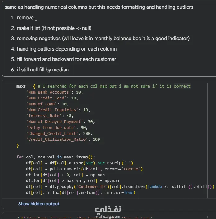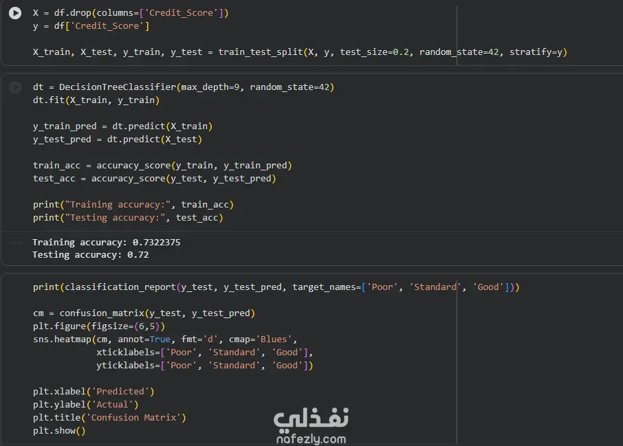 نظرة عامة في هذا المشروع، قمت ببناء نموذج شجرة قرار (Decision Tree) لتصنيف العملاء إلى ثلاث فئات ائتمانية: Poor, Standard, Good. التحدي الأكبر كان في معالجة البيانات المتسخة التي تحتوي على قيم مفقودة، قيم شاذة، وتنسيقات غير متسقة. 1.البيانات مجموعة بيانات تحتوي على 100,000 عميل و28 عمودًا، تشمل: معلومات شخصية: العمر، المهنة، الدخل السنوي. معلومات مصرفية: عدد الحسابات، عدد بطاقات الائتمان، الديون المستحقة. تاريخ ائتماني: مدة التاريخ الائتماني، التأخير في السداد، سلوك الدفع. 2.خطوات المعالجة (Data Cleaning) إزالة الأعمدة غير المفيدة (ID, Name, SSN). تشفير الشهور يدويًا. معالجة العمر: إزالة القيم السالبة وملء المفقود بالوسيط لكل عميل. تجميع المهن إلى فئات (Professional, Education, Media, Business) وتطبيق one-hot encoding. تنظيف الأعمدة الرقمية: إزالة الشرطة السفلية "_"، تحويل إلى numeric، إزالة القيم السالبة، ملء المفقود باستخدام forward/backward fill لكل عميل ثم الوسيط. تحديد القيم القصوى المعقولة لكل عمود وإزالة القيم الشاذة. معالجة Credit_Mix: استبدال "_" بـ NaN، ملء بالـ mode. تحويل Credit_History_Age من نص إلى عدد أشهر. معالجة Payment_Behaviour: استبدال القيم غير الصالحة، ملء المفقود، ثم ترميزها. تشفير الهدف (Credit_Score) إلى أرقام. 3.النموذج والنتائج النموذج: DecisionTreeClassifier (max_depth=9) دقة التدريب: 73.2% دقة الاختبار: 72.0%