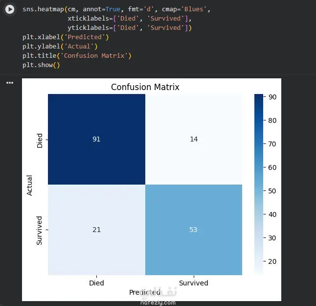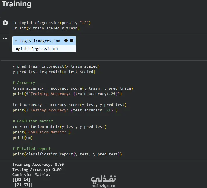 في هذا المشروع، قمت بتحليل بيانات ركاب سفينة Titanic وبناء نموذج Logistic Regression للتنبؤ بما إذا كان الراكب سينجو أم لا. الهدف هو فهم العوامل المؤثرة على النجاة وتطبيق تقنيات معالجة البيانات. 1.البيانات مجموعة بيانات Titanic الشهيرة من Kaggle، تحتوي على 891 راكبًا وخصائص مثل: الدرجة، الجنس، العمر، عدد أفراد العائلة، سعر التذكرة، وميناء الإقلاع. 2.تحليل البيانات الاستكشافي (EDA) الدرجة: 63% نجاة في الدرجة الأولى مقابل 24% في الدرجة الثالثة. الجنس: 74% من النساء نجون مقابل 19% من الرجال. العمر: الأطفال (أقل من 12 سنة) كانت نسبتهم أعلى في النجاة. سعر التذكرة: الناجون دفعوا أسعار تذاكر أعلى بغض النظر عن الدرجة. حجم العائلة: الركاب مع عائلات كانت نسبتهم أعلى في النجاة من العزاب. 3.خطوات المعالجة إزالة الأعمدة غير المفيدة (PassengerId, Name, Ticket, Embarked). ملء القيم المفقودة في Age بالمتوسط. إزالة عمود Cabin لكثرة القيم المفقودة. تشفير الجنس باستخدام LabelEncoder. تقسيم البيانات إلى تدريب واختبار بنسبة 80/20. تطبيع البيانات باستخدام StandardScaler. 4.النموذج والنتائج النموذج: Logistic Regression دقة التدريب: 80% دقة الاختبار: 80% مصفوفة الارتباك: [[91 14] [21 53]] تقرير التصنيف: precision و recall متوازنان للفئتين.