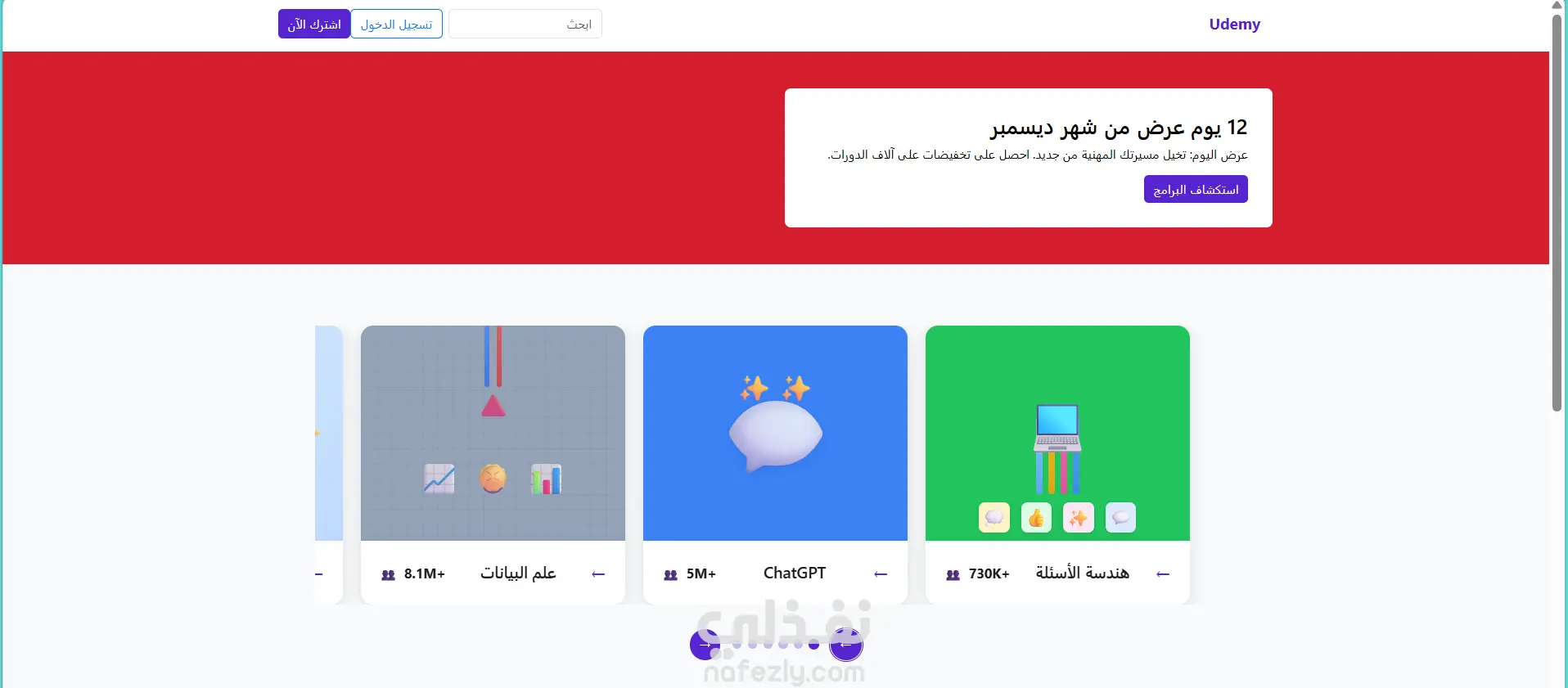 Developed a responsive frontend website for an online courses platform similar to Udemy. The project includes modern UI components such as course cards, sliders for featured courses, category navigation, and promotional banners. The website was built using **HTML, CSS, JavaScript, and Bootstrap**, focusing on clean design, responsiveness, and user-friendly layout. The interface is suitable for showcasing online courses with smooth product/course navigation and modern e-learning styling. This project demonstrates frontend development skills in building educational platform interfaces.