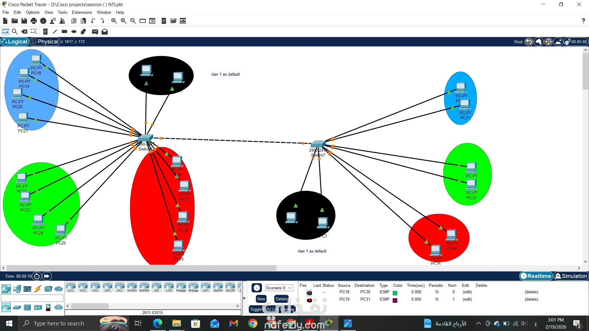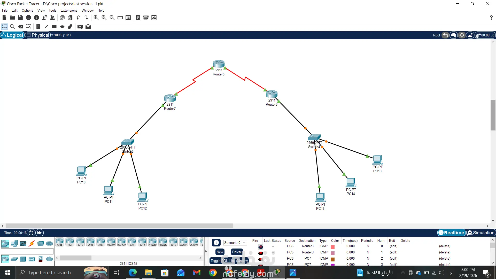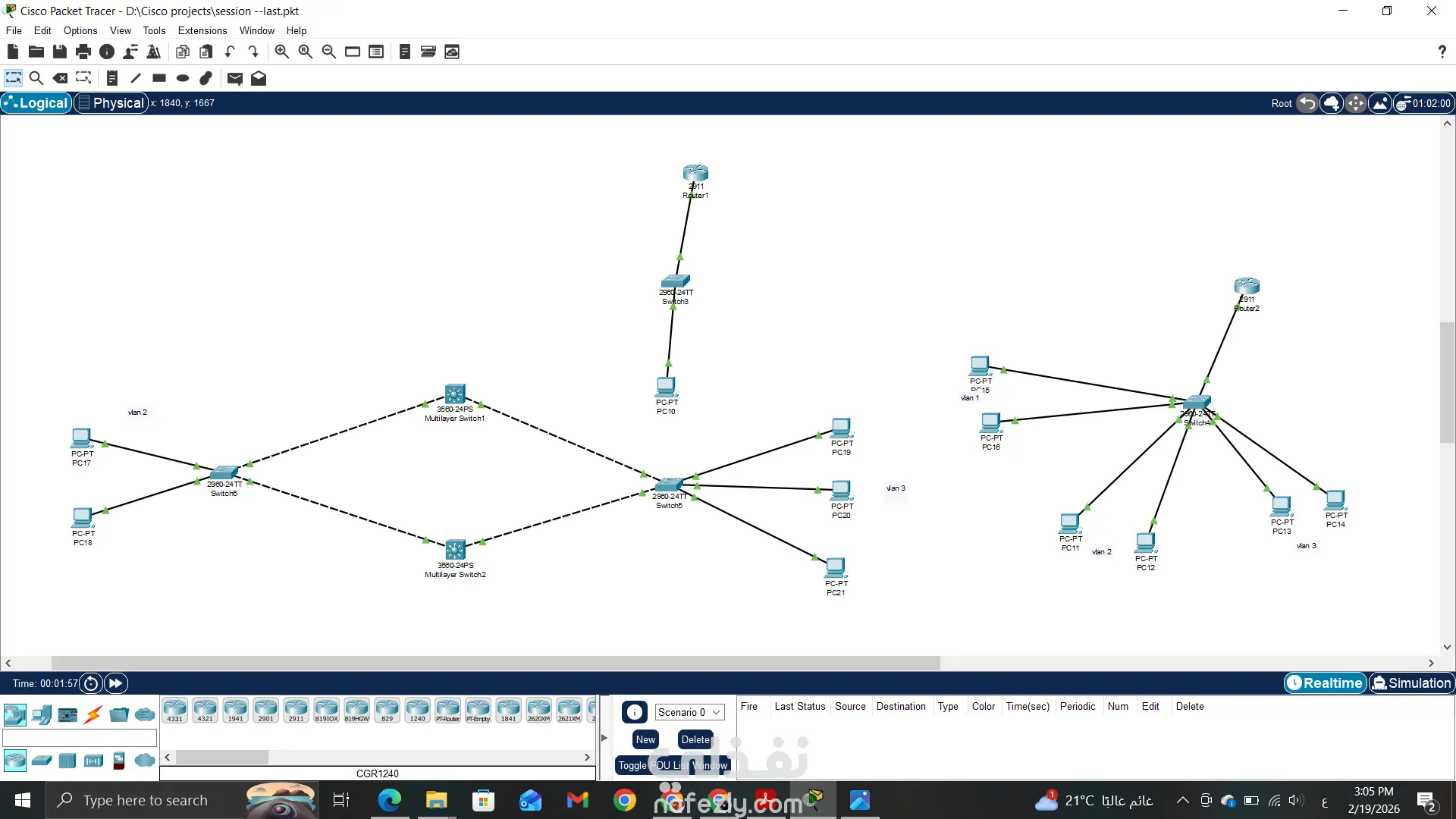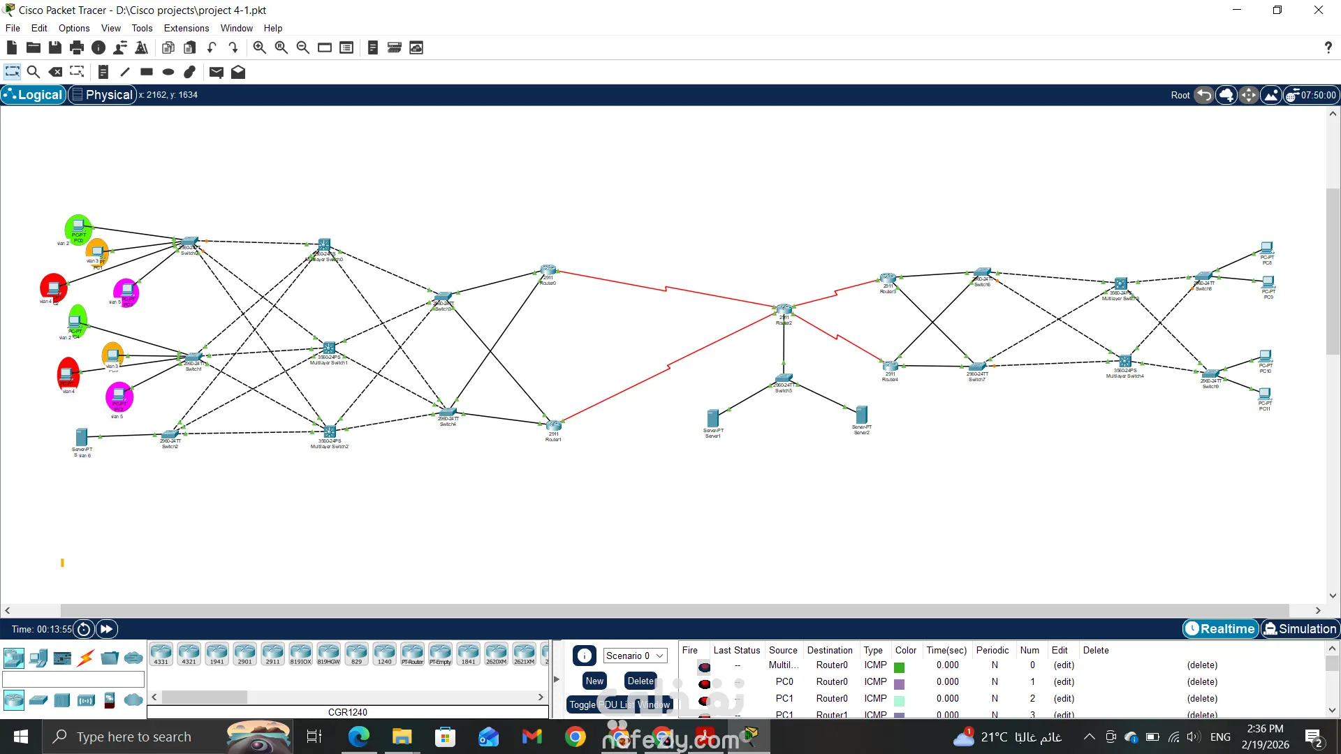 قمت بتصميم ومحاكاة شبكة مؤسسة متكاملة باستخدام برنامج Cisco Packet Tracer، شملت أجهزة التوجيه (Routers)، ومبدلات الطبقة الثانية والثالثة (L2/L3 Switches)، وأجهزة المستخدمين، مع تطبيق هيكلة عناوين IP وتقسيم الشبكات (Subnetting). أبرز المهام التي قمت بها: - تنفيذ شبكات VLANs وإعداد التوجيه بينها (Inter-VLAN routing). - توصيف بروتوكولات التوجيه الديناميكي (RIP, OSPF, EIGRP, BGP). - ربط المواقع البعيدة باستخدام تقنيات الشبكة الواسعة (WAN). - تأمين الاتصالات عبر إعداد شبكات افتراضية خاصة (Site-to-Site VPN). - تفعيل خدمات DHCP و NAT وقوائم التحكم في الوصول (ACLs). - تطبيق الممارسات الأساسية لأمن الشبكات. - إجراء اختبارات الشبكة واستكشاف الأخطاء وإصلاحها (Troubleshooting) للتأكد من كفاءة الاتصال، وسرعة التقارب (Convergence)، وتوفر البدائل (Redundancy)، والأداء العام للشبكة.