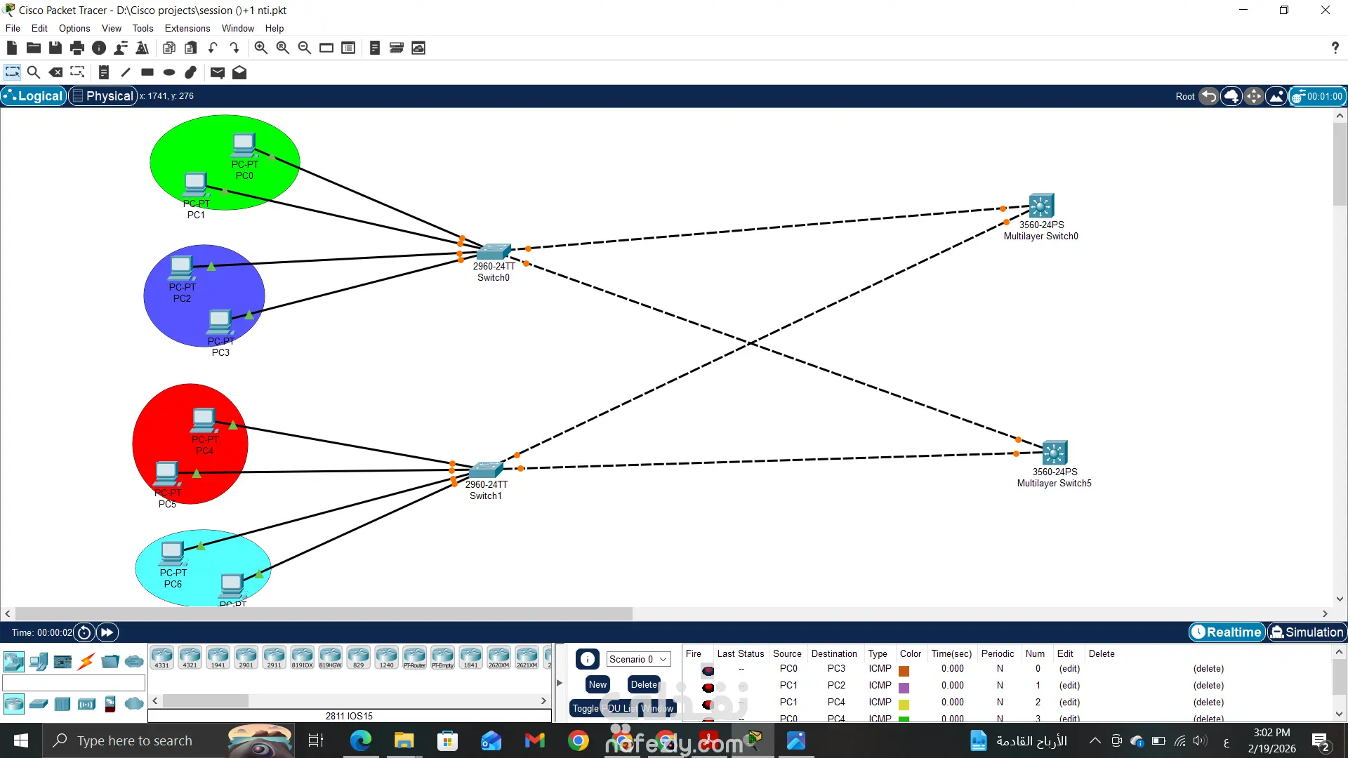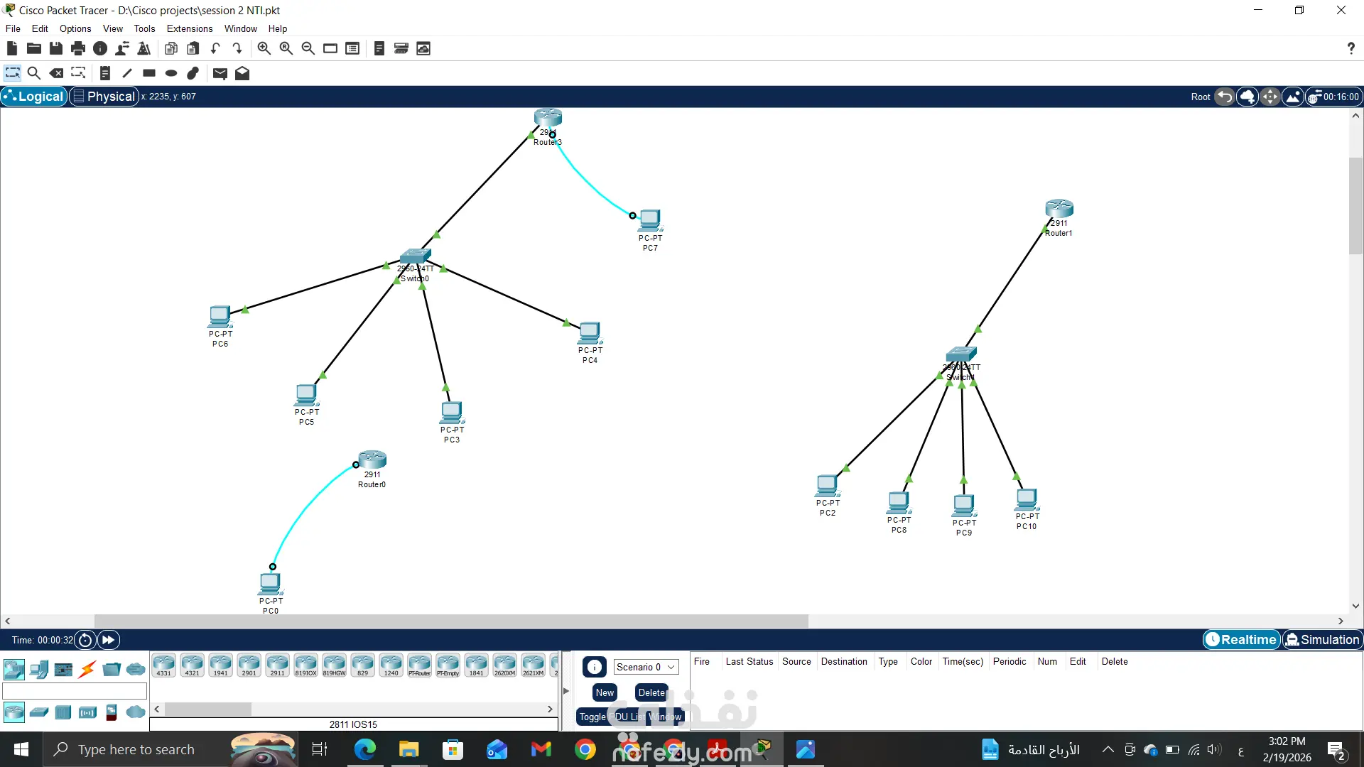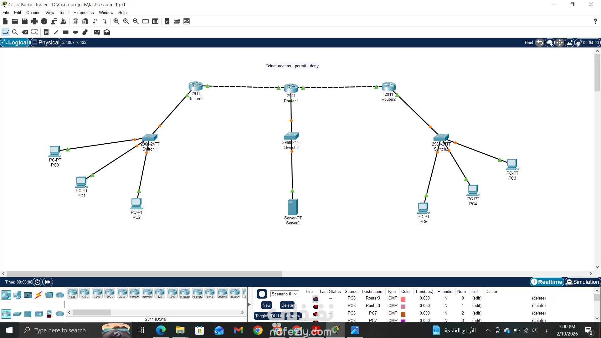 قمت بتصميم ومحاكاة شبكة مؤسسة متكاملة باستخدام برنامج Cisco Packet Tracer، شملت أجهزة التوجيه (Routers)، ومبدلات الطبقة الثانية والثالثة (L2/L3 Switches)، وأجهزة المستخدمين، مع تطبيق هيكلة عناوين IP وتقسيم الشبكات (Subnetting). أبرز المهام التي قمت بها: - تنفيذ شبكات VLANs وإعداد التوجيه بينها (Inter-VLAN routing). - توصيف بروتوكولات التوجيه الديناميكي (RIP, OSPF, EIGRP, BGP). - ربط المواقع البعيدة باستخدام تقنيات الشبكة الواسعة (WAN). - تأمين الاتصالات عبر إعداد شبكات افتراضية خاصة (Site-to-Site VPN). - تفعيل خدمات DHCP و NAT وقوائم التحكم في الوصول (ACLs). - تطبيق الممارسات الأساسية لأمن الشبكات. - إجراء اختبارات الشبكة واستكشاف الأخطاء وإصلاحها (Troubleshooting) للتأكد من كفاءة الاتصال، وسرعة التقارب (Convergence)، وتوفر البدائل (Redundancy)، والأداء العام للشبكة.