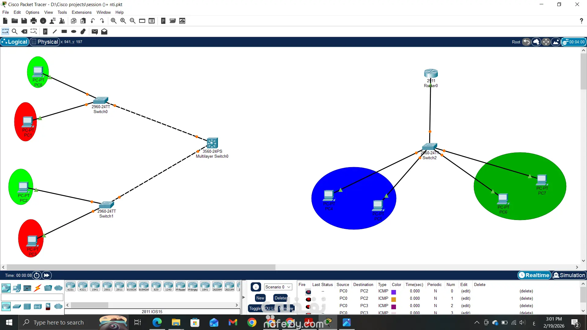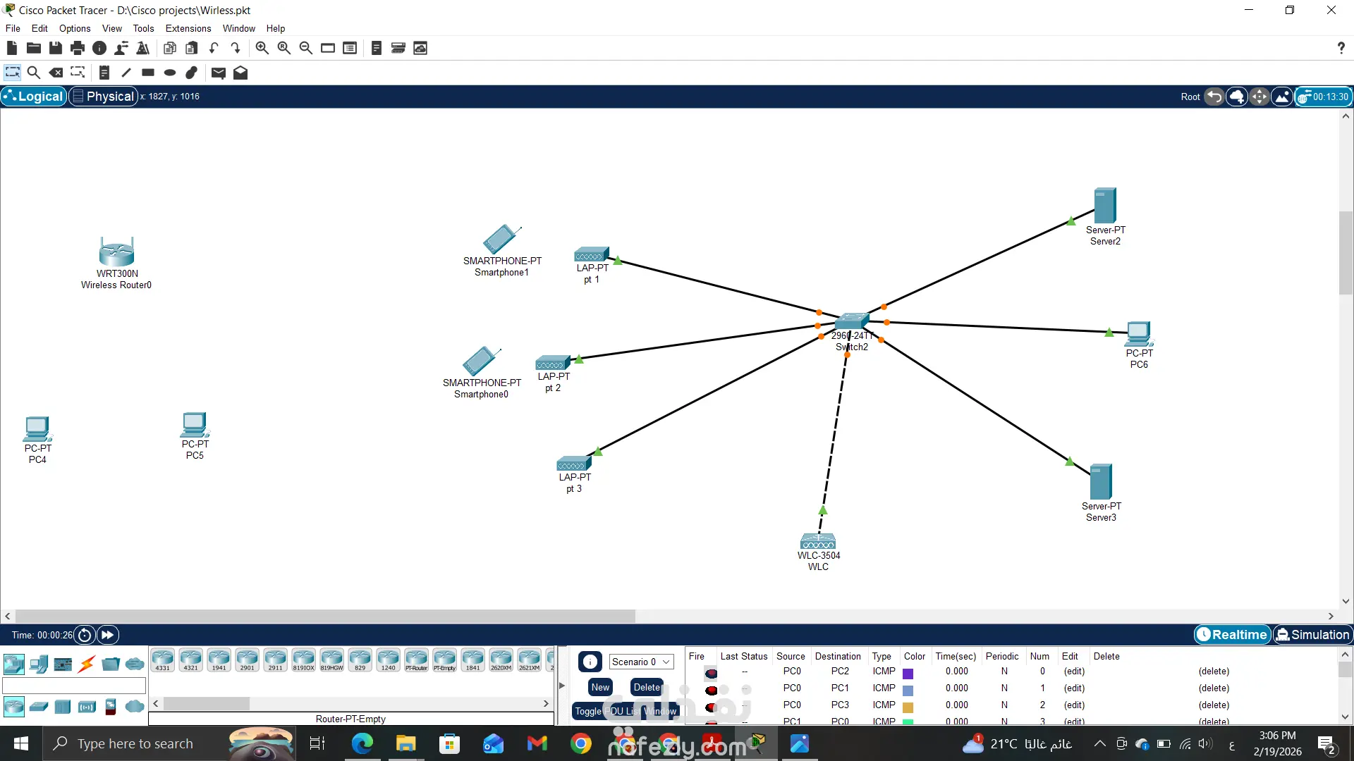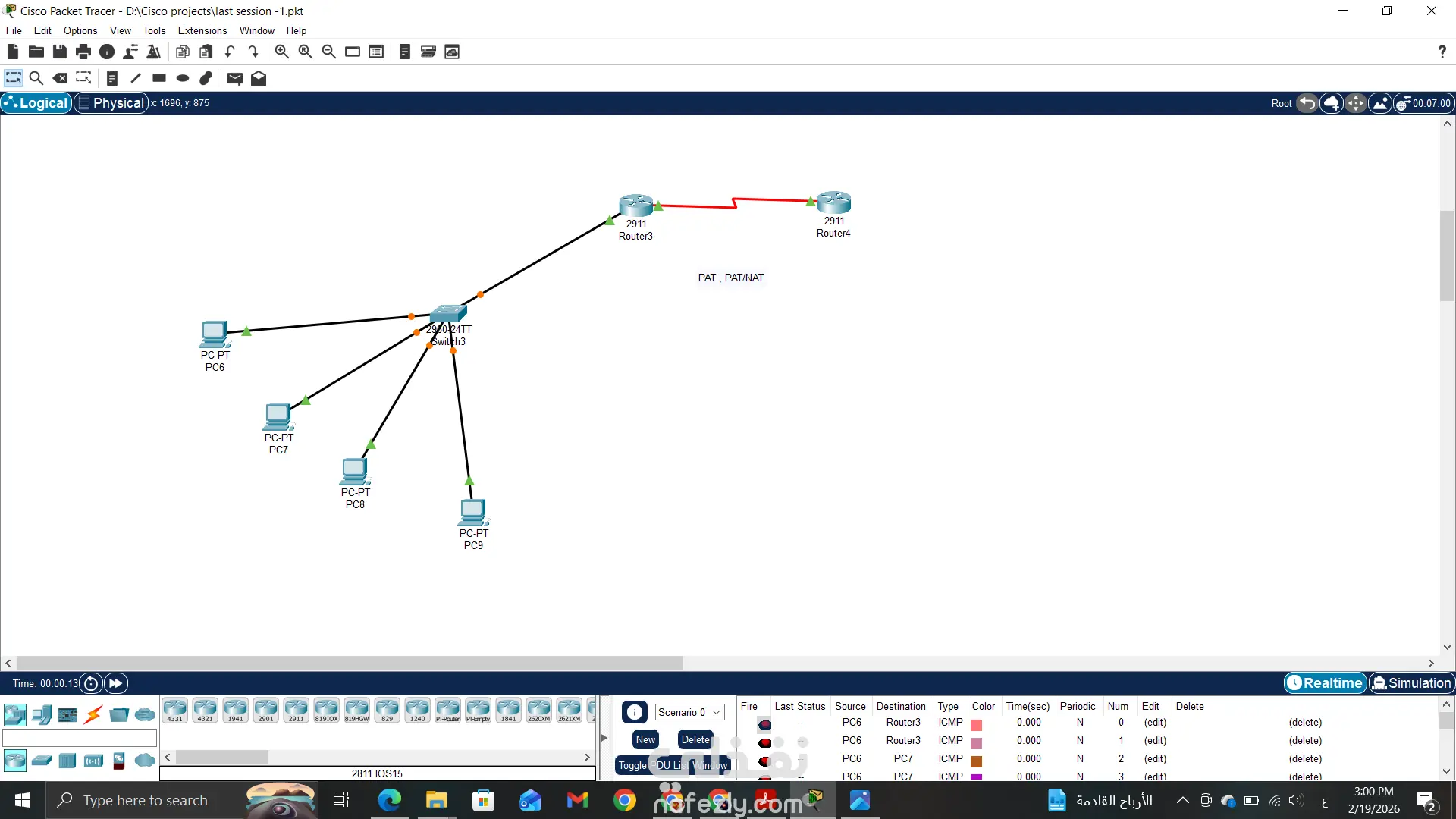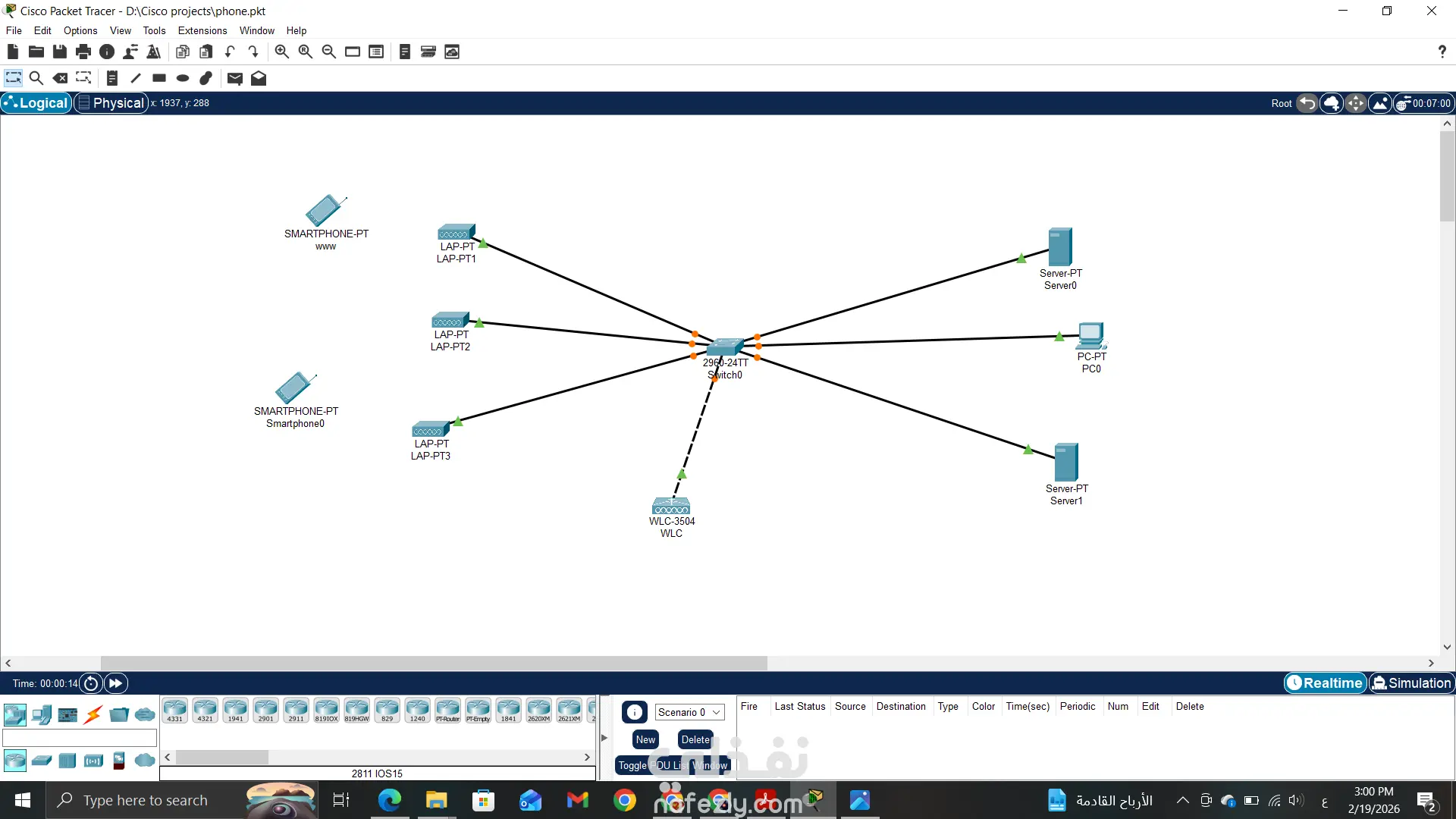 قمت بتصميم ومحاكاة شبكة مؤسسة متكاملة باستخدام برنامج Cisco Packet Tracer، شملت أجهزة التوجيه (Routers)، ومبدلات الطبقة الثانية والثالثة (L2/L3 Switches)، وأجهزة المستخدمين، مع تطبيق هيكلة عناوين IP وتقسيم الشبكات (Subnetting). أبرز المهام التي قمت بها: - تنفيذ شبكات VLANs وإعداد التوجيه بينها (Inter-VLAN routing). - توصيف بروتوكولات التوجيه الديناميكي (RIP, OSPF, EIGRP, BGP). - ربط المواقع البعيدة باستخدام تقنيات الشبكة الواسعة (WAN). - تأمين الاتصالات عبر إعداد شبكات افتراضية خاصة (Site-to-Site VPN). - تفعيل خدمات DHCP و NAT وقوائم التحكم في الوصول (ACLs). - تطبيق الممارسات الأساسية لأمن الشبكات. - إجراء اختبارات الشبكة واستكشاف الأخطاء وإصلاحها (Troubleshooting) للتأكد من كفاءة الاتصال، وسرعة التقارب (Convergence)، وتوفر البدائل (Redundancy)، والأداء العام للشبكة.