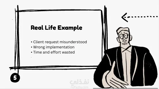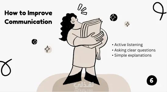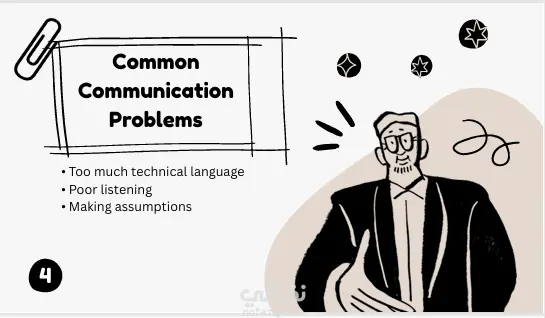 كما يوضح العرض بعض المشكلات الشائعة في التواصل بين المطورين مثل استخدام مصطلحات تقنية معقدة أو ضعف الاستماع، مع تقديم حلول عملية لتحسين التواصل مثل الاستماع الفعّال وطرح الأسئلة الواضحة وتبسيط الشرح.
