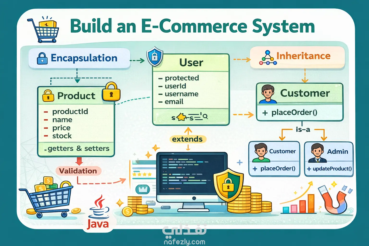 مشروع برمجي يهدف إلى بناء نظام تجارة إلكترونية بسيط باستخدام مفاهيم البرمجة كائنية التوجه (OOP)، مع التركيز على تطبيق عملي لمبادئ Encapsulation و Inheritance داخل سيناريو واقعي يشبه أنظمة المتاجر الإلكترونية.