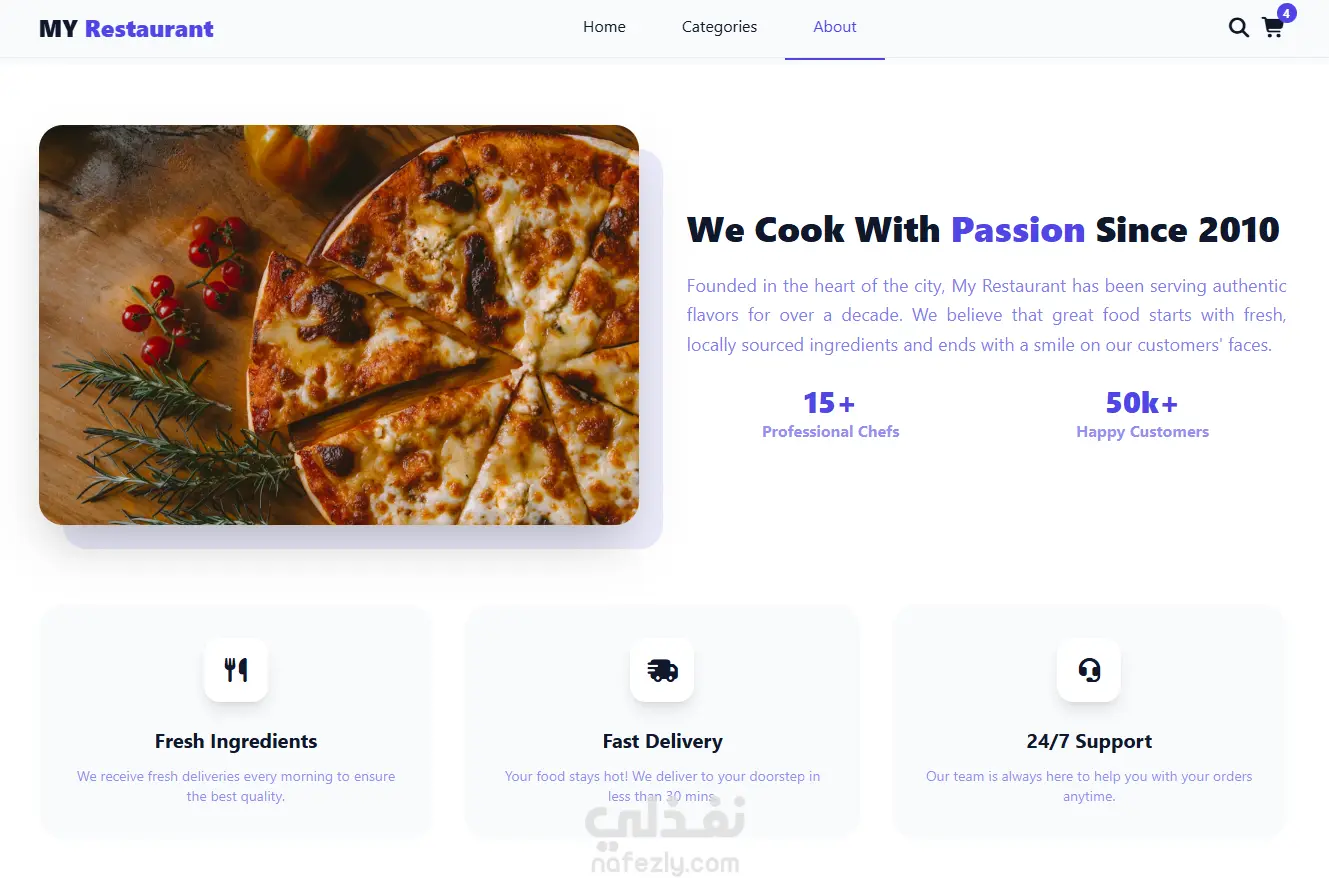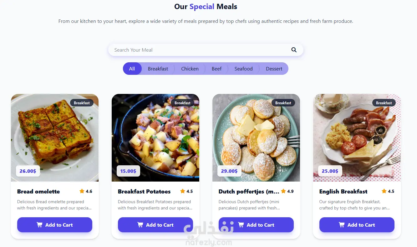 - نظام بحث وفلترة متطور حيث يمكن للمستخدم البحث عن الوجبات أو تصفحها حسب التصنيف بسهولة.
