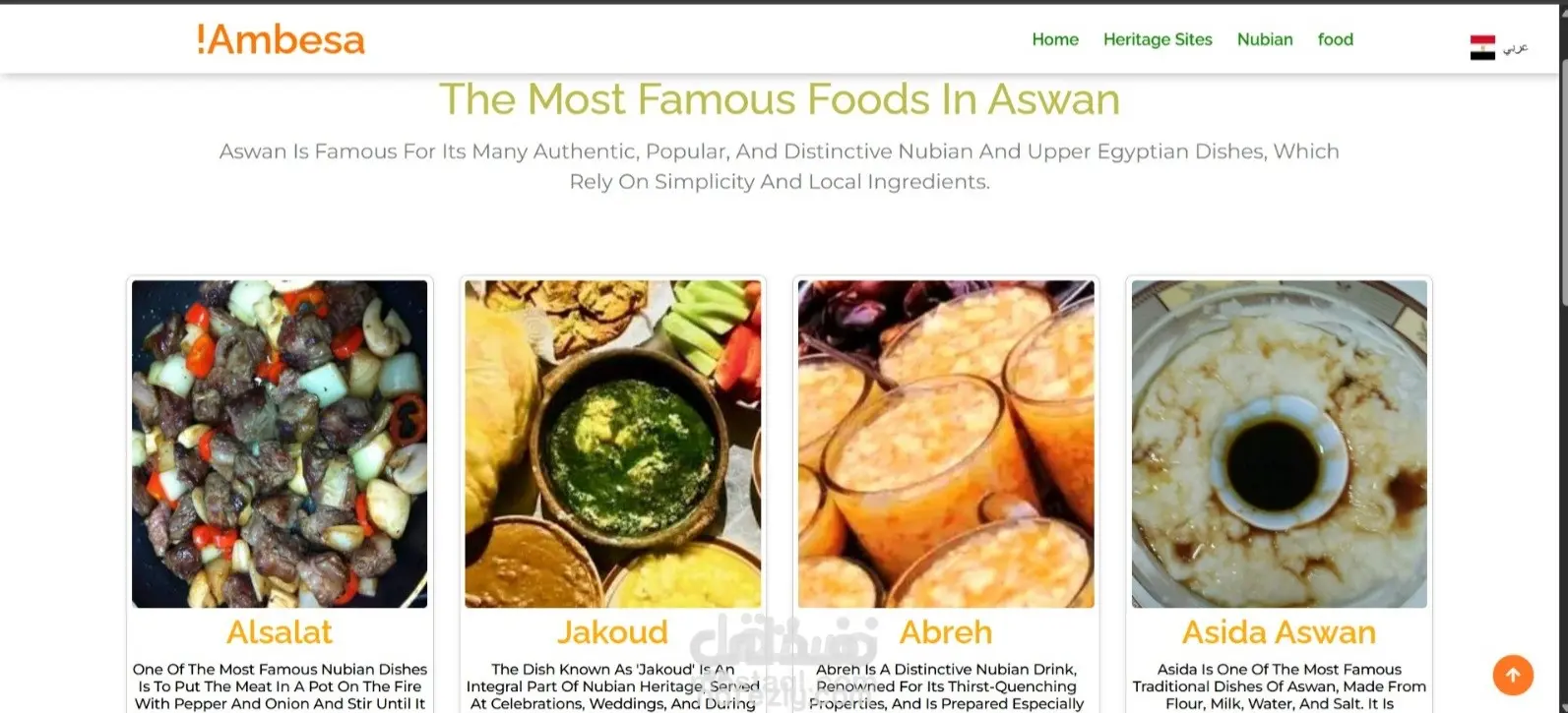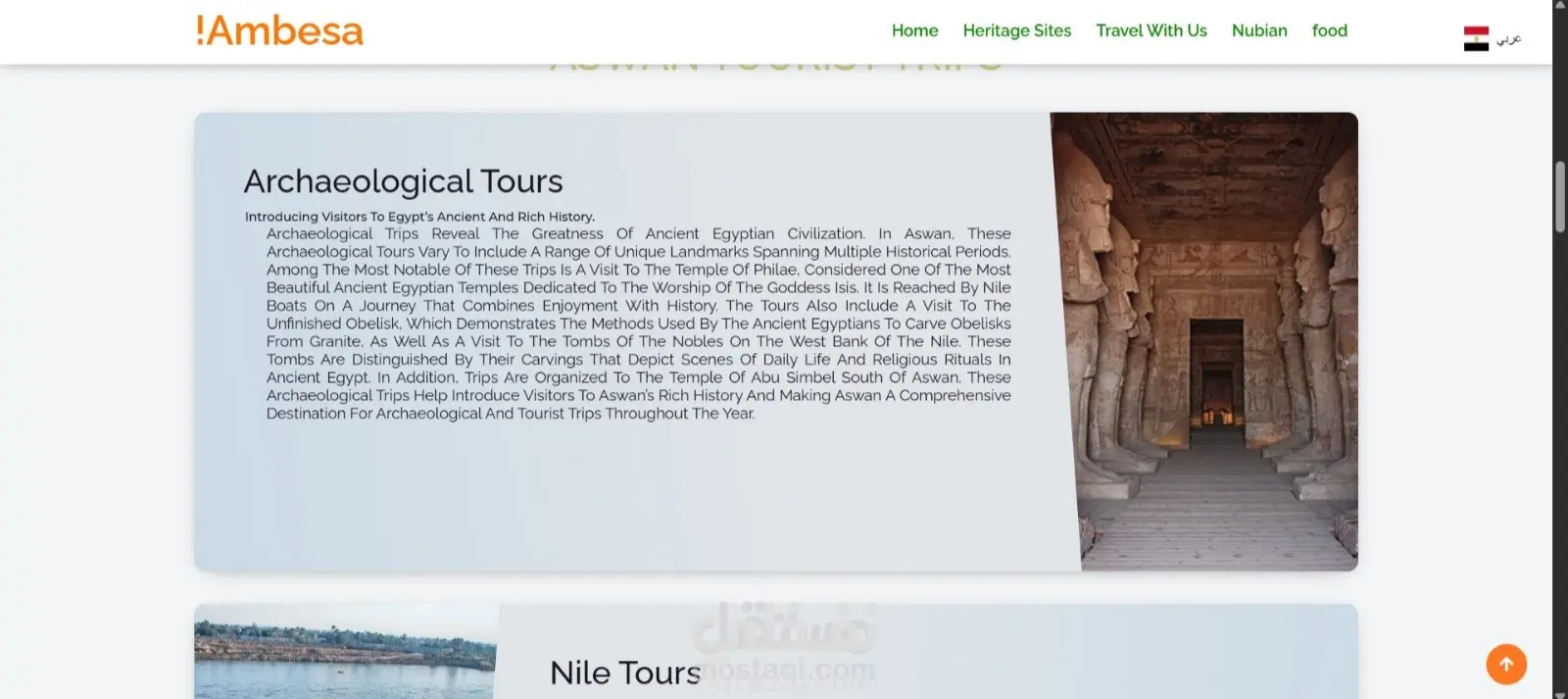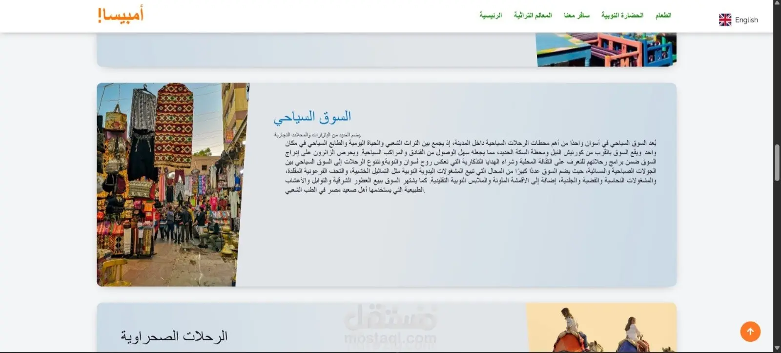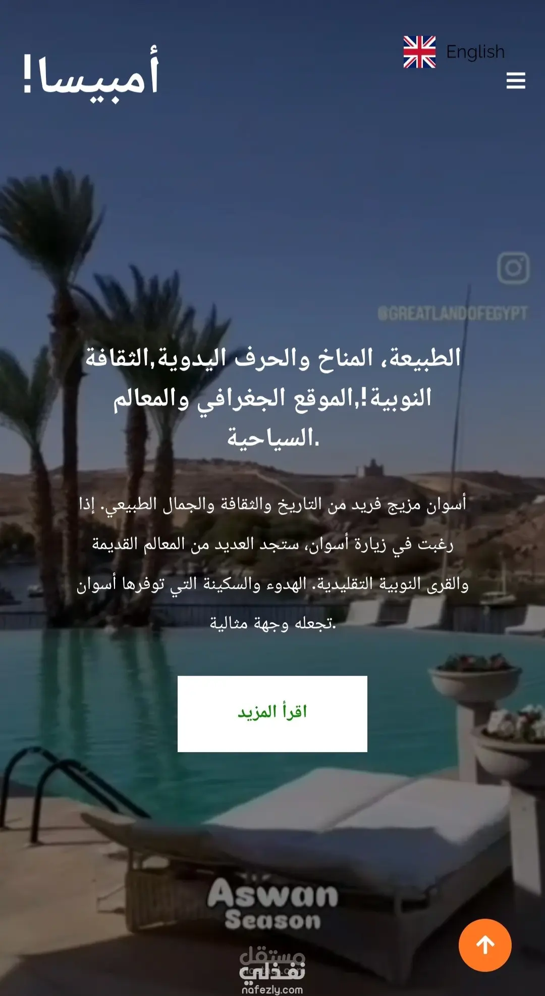 قبل شهر واحد • تم التحرير • مرئية لأي شخص على أو خارج LinkedIn Ambasa 🇻🇨 : 🚀 كيف يتحوّل تاريخ مدينة كاملة إلى تجربة رقمية ذكية؟ 🌍 هذا المشروع هو موقع ويب تعريفي عن مدينة أسوان يعيد تقديم تاريخها العريق والحضارة النوبية 🏺، أهم المعالم السياحية 🏛️، الأكلات التقليدية 🍽️، والأنشطة السياحية 🌞، بأسلوب رقمي حديث يليق بعراقة المكان. 🌐 دعم كامل للغتين العربية والإنجليزية 🤖 بوت ذكاء اصطناعي يوجّه الزوار ويجيب عن استفساراتهم ✨ تجربة مستخدم سلسة تجمع بين الجمال والوظيفة 🔧 ما الذي ميّز التنفيذ؟ 🎨 تصميم عصري يعكس روح أسوان 📱 أداء قوي وموقع متجاوب على جميع الأجهزة ✨ أنيميشن خفيفة تضيف حياة للمحتوى 🎨 ألوان مستوحاة من الطبيعة (الأزرق – الذهبي – الأخضر) 🧩 كود نظيف وقابل للتطوير 🔥 هذا المشروع ليس مجرد موقع… بل تجربة رقمية تروّج للتراث بأسلوب المستقبل.