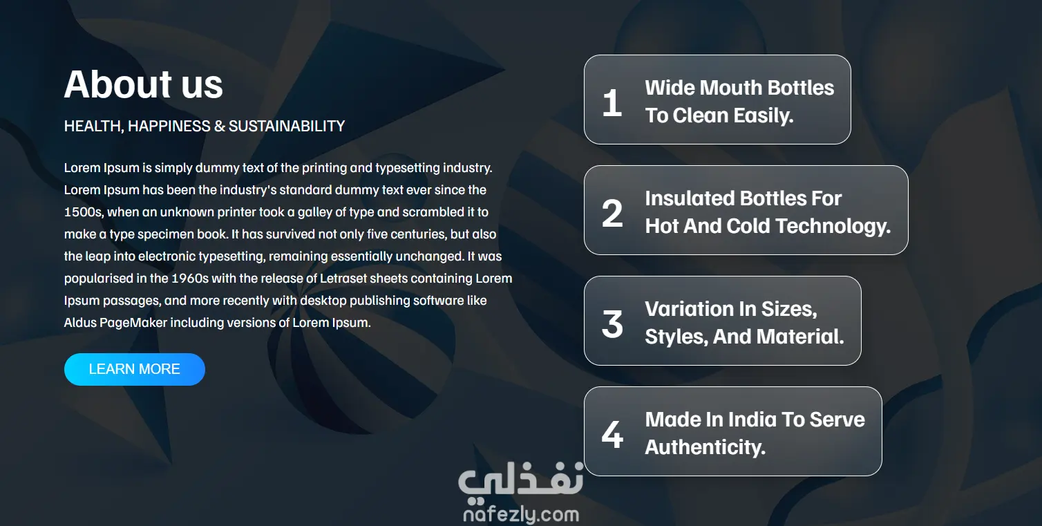 قمت بتصميم وبرمجة صفحة هبوط متكاملة لعلامة تجارية متخصصة في المنتجات المستدامة. يركز المشروع على إبراز جودة المنتجات وتسهيل رحلة العميل من التصفح وحتى الطلب. أهم المميزات التقنية التي نفذتها: تنظيم أقسام الموقع لعرض فئات مختلفة من المنتجات (Vacuum Bottles, Borosilicate, Kettles) بأسلوب بصري جذاب. استخدام نظام ألوان متناسق وتنسيقات CSS دقيقة (Pixel-Perfect) لتعزيز هوية العلامة التجارية. برمجة الموقع ليعمل بسلاسة تامة على الهواتف الذكية، الأجهزة اللوحية، والحواسيب لضمان عدم فقدان أي عميل. تنفيذ قائمة تنقل سلسة (Shop, Journal, Custom) ونموذج تواصل (Contact Form) لزيادة تفاعل المستخدمين. اللغات المستخدمة: HTML5, CSS3
