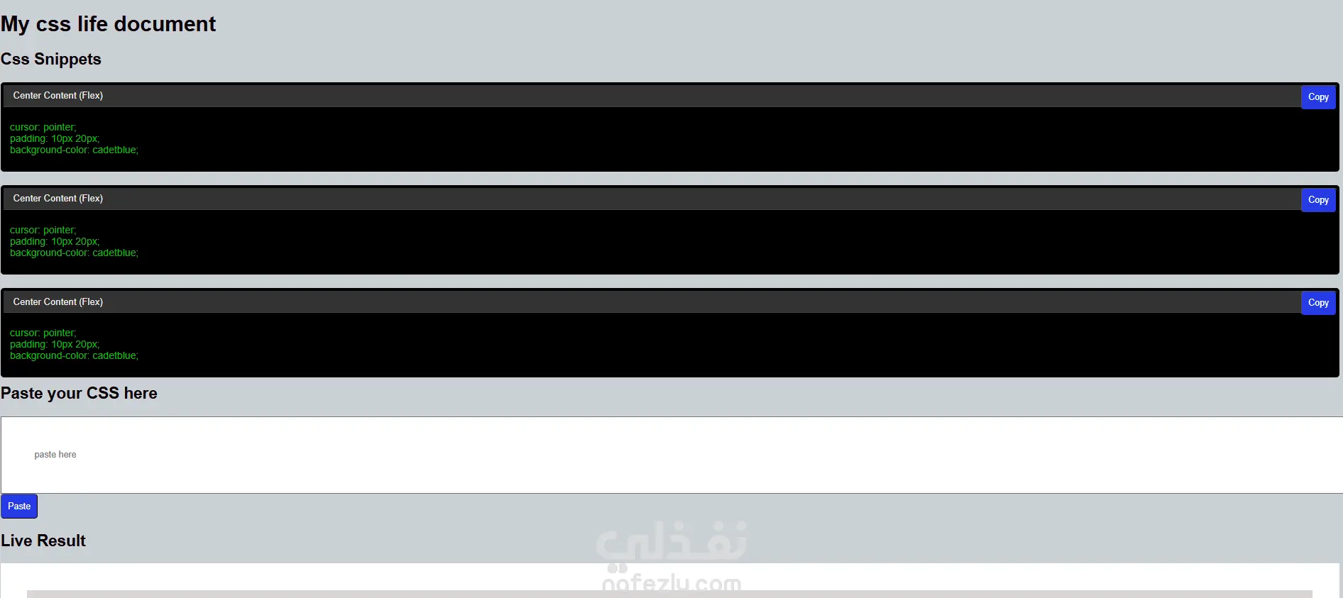 قمت بتصميم وتطوير صفحة ويب تفاعلية احترافية لعرض أكواد CSS الجاهزة مع إمكانية نسخها ولصقها وتنفيذها بشكل فوري داخل الصفحة (Live Preview)، مما يوفر تجربة استخدام عملية وسلسة تحاكي أدوات المطورين الحديثة.