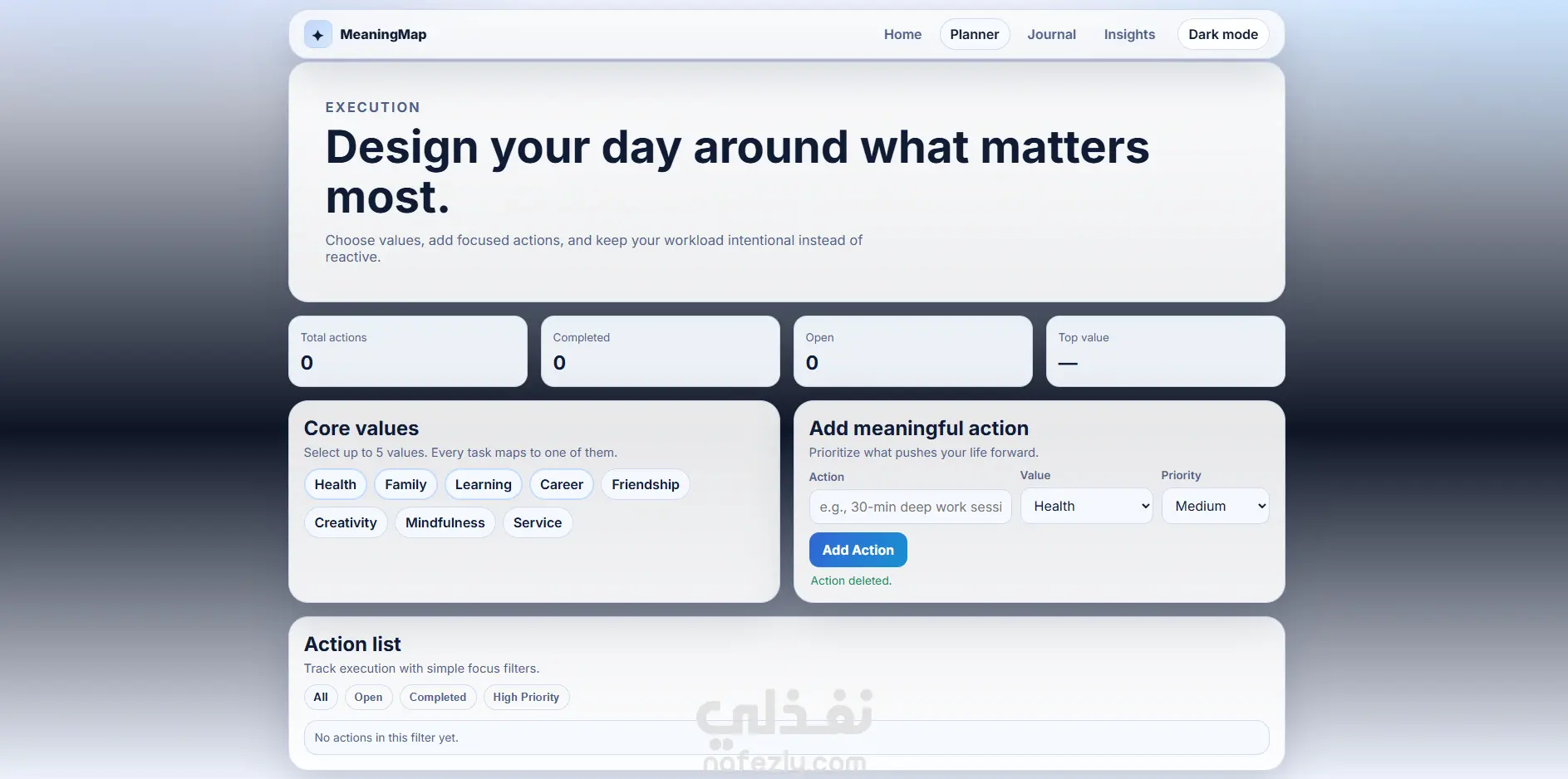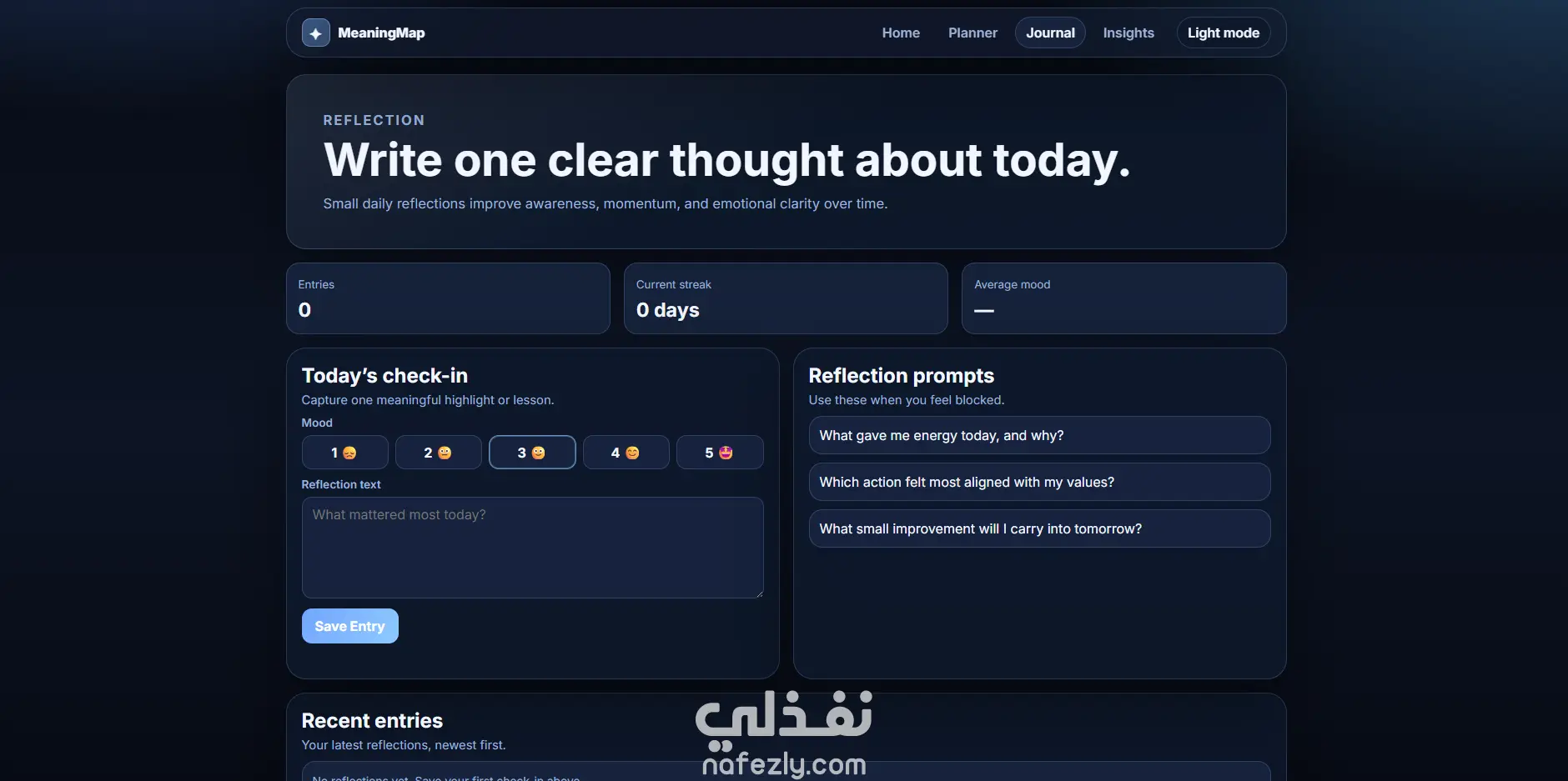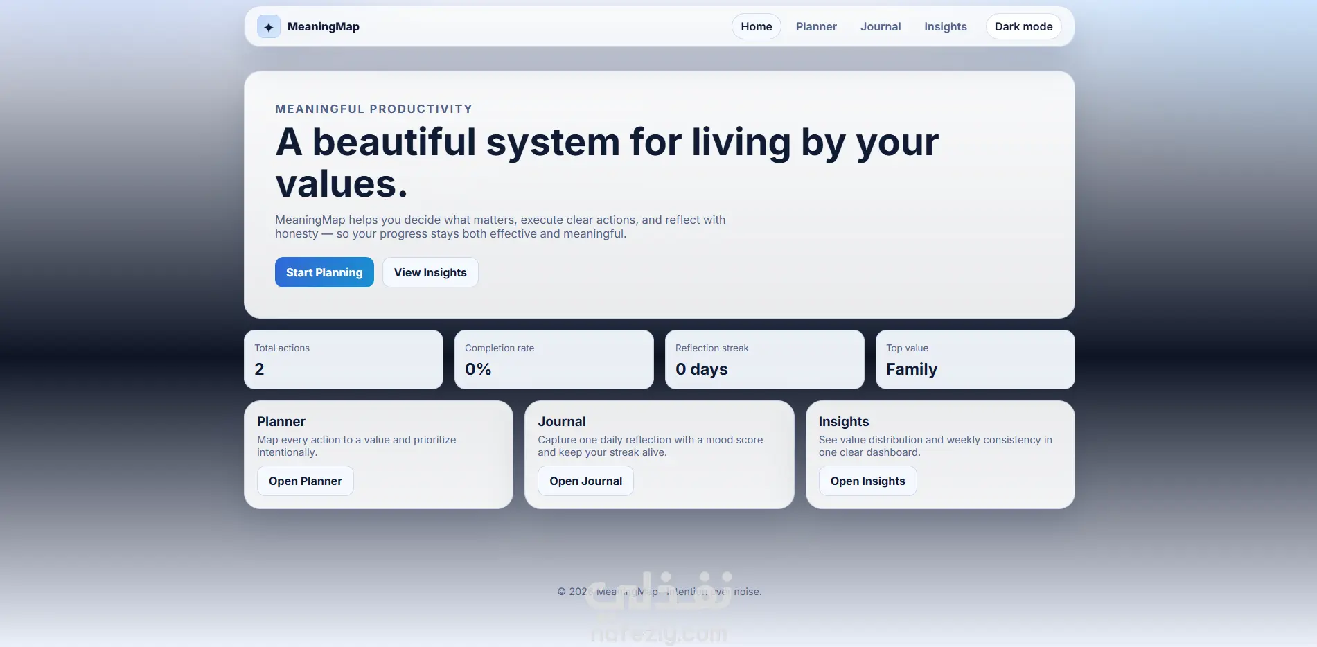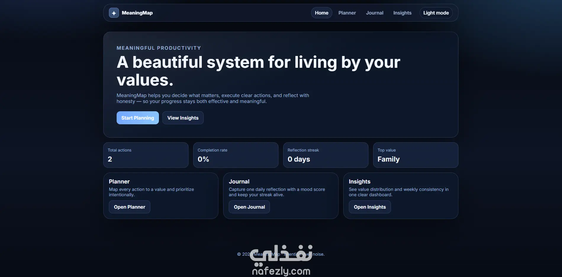 مشروع MeaningMap هو تطبيق ويب متكامل ومتعدد الصفحات يساعد المستخدم على تنظيم حياته اليومية بطريقة ذات معنى، وليس فقط إنجاز المهام. يوفّر المشروع تجربة أنيقة وعصرية تركّز على: التخطيط بالقيم: ربط كل مهمة بقيمة شخصية مثل الصحة أو العائلة أو التعلّم. التنفيذ الذكي: إدارة المهام حسب الأولوية والحالة (مكتملة/قيد التنفيذ). التأمل اليومي: كتابة انعكاس يومي مع تتبّع المزاج وبناء سلسلة استمرارية. التحليلات: عرض مؤشرات واضحة مثل معدل الإنجاز، القيمة الأكثر حضورًا، وتقدّم الأسبوع. تجربة استخدام فاخرة: تصميم بصري احترافي، متجاوب مع الجوال، مع وضع ليلي/نهاري. باختصار، MeaningMap هو “نظام حياة إنتاجي” يجمع بين الإنتاجية والوعي الذاتي لمساعدة المستخدم على عيش أيام أكثر اتساقًا مع أهدافه وقيمه