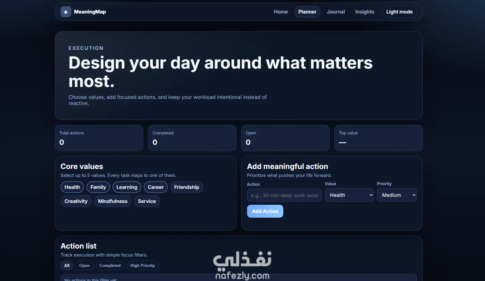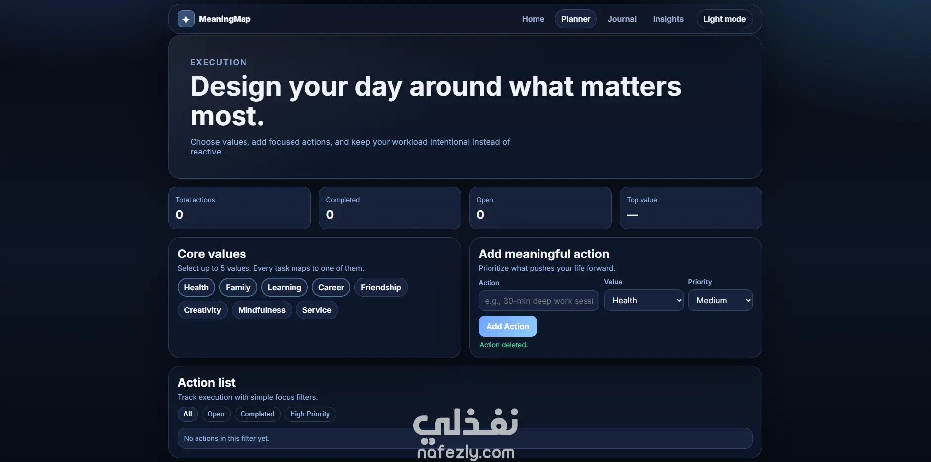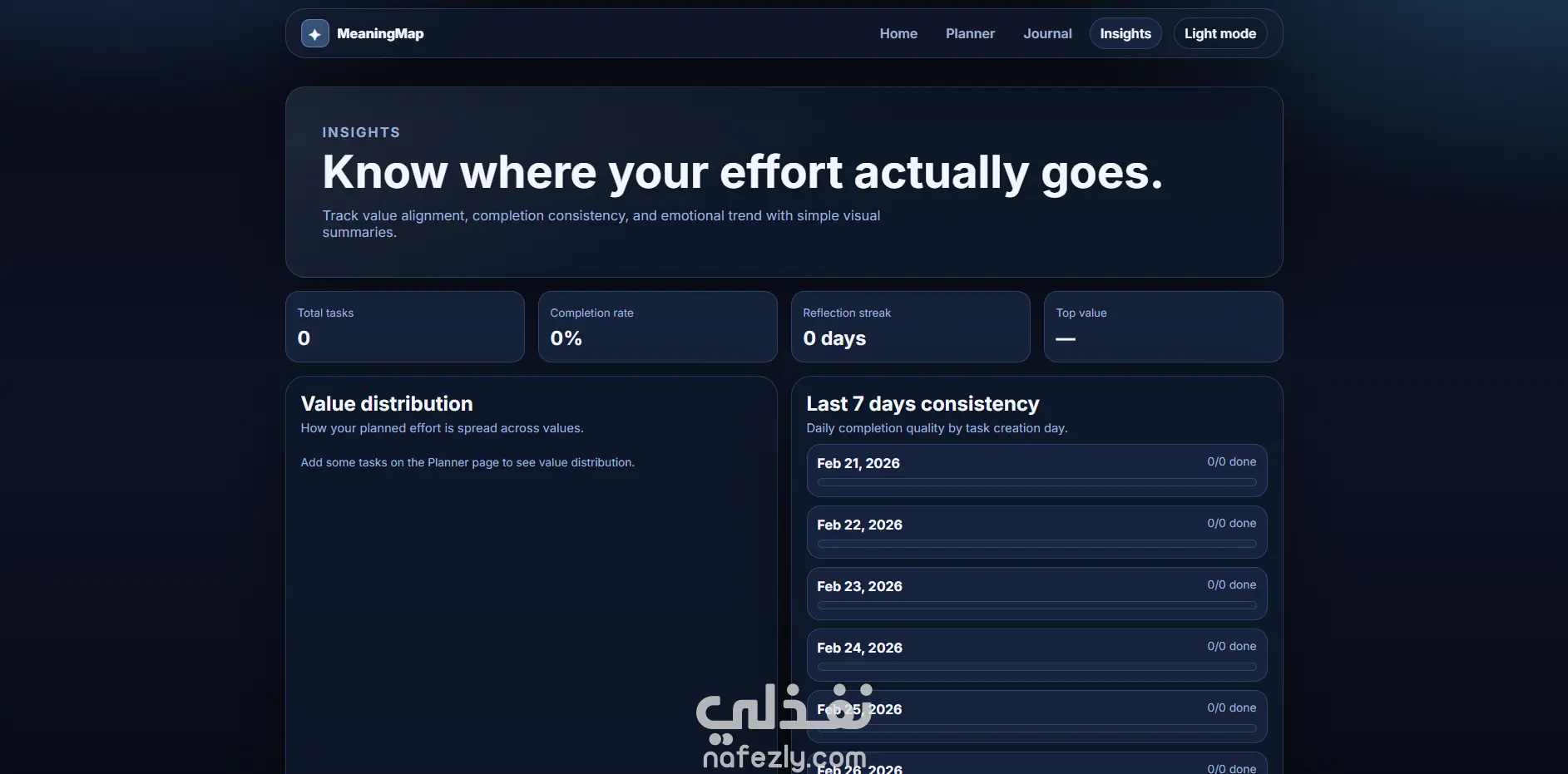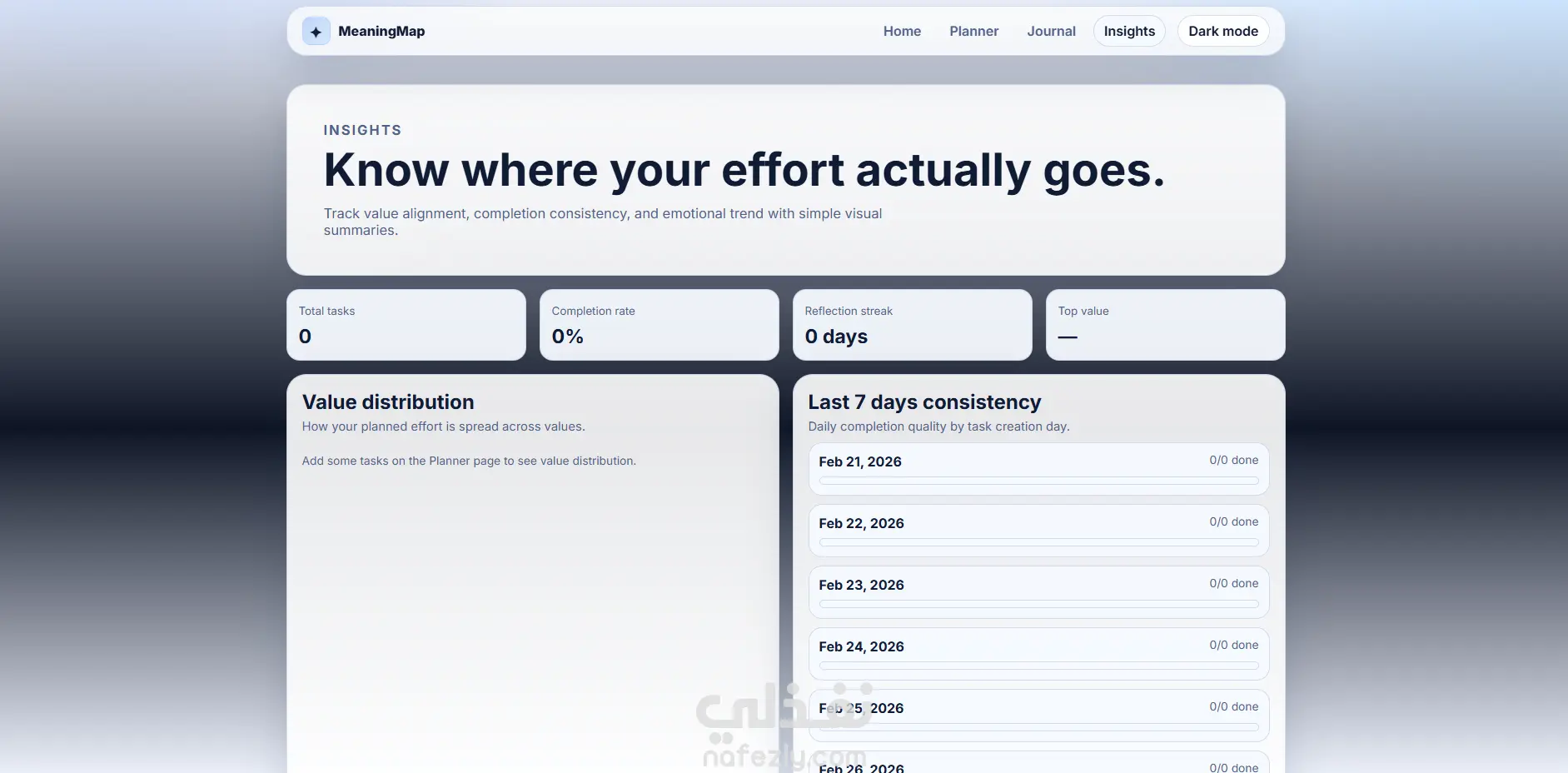 مشروع MeaningMap هو تطبيق ويب متكامل ومتعدد الصفحات يساعد المستخدم على تنظيم حياته اليومية بطريقة ذات معنى، وليس فقط إنجاز المهام. يوفّر المشروع تجربة أنيقة وعصرية تركّز على: التخطيط بالقيم: ربط كل مهمة بقيمة شخصية مثل الصحة أو العائلة أو التعلّم. التنفيذ الذكي: إدارة المهام حسب الأولوية والحالة (مكتملة/قيد التنفيذ). التأمل اليومي: كتابة انعكاس يومي مع تتبّع المزاج وبناء سلسلة استمرارية. التحليلات: عرض مؤشرات واضحة مثل معدل الإنجاز، القيمة الأكثر حضورًا، وتقدّم الأسبوع. تجربة استخدام فاخرة: تصميم بصري احترافي، متجاوب مع الجوال، مع وضع ليلي/نهاري. باختصار، MeaningMap هو “نظام حياة إنتاجي” يجمع بين الإنتاجية والوعي الذاتي لمساعدة المستخدم على عيش أيام أكثر اتساقًا مع أهدافه وقيمه