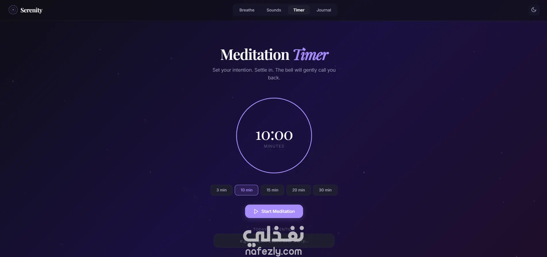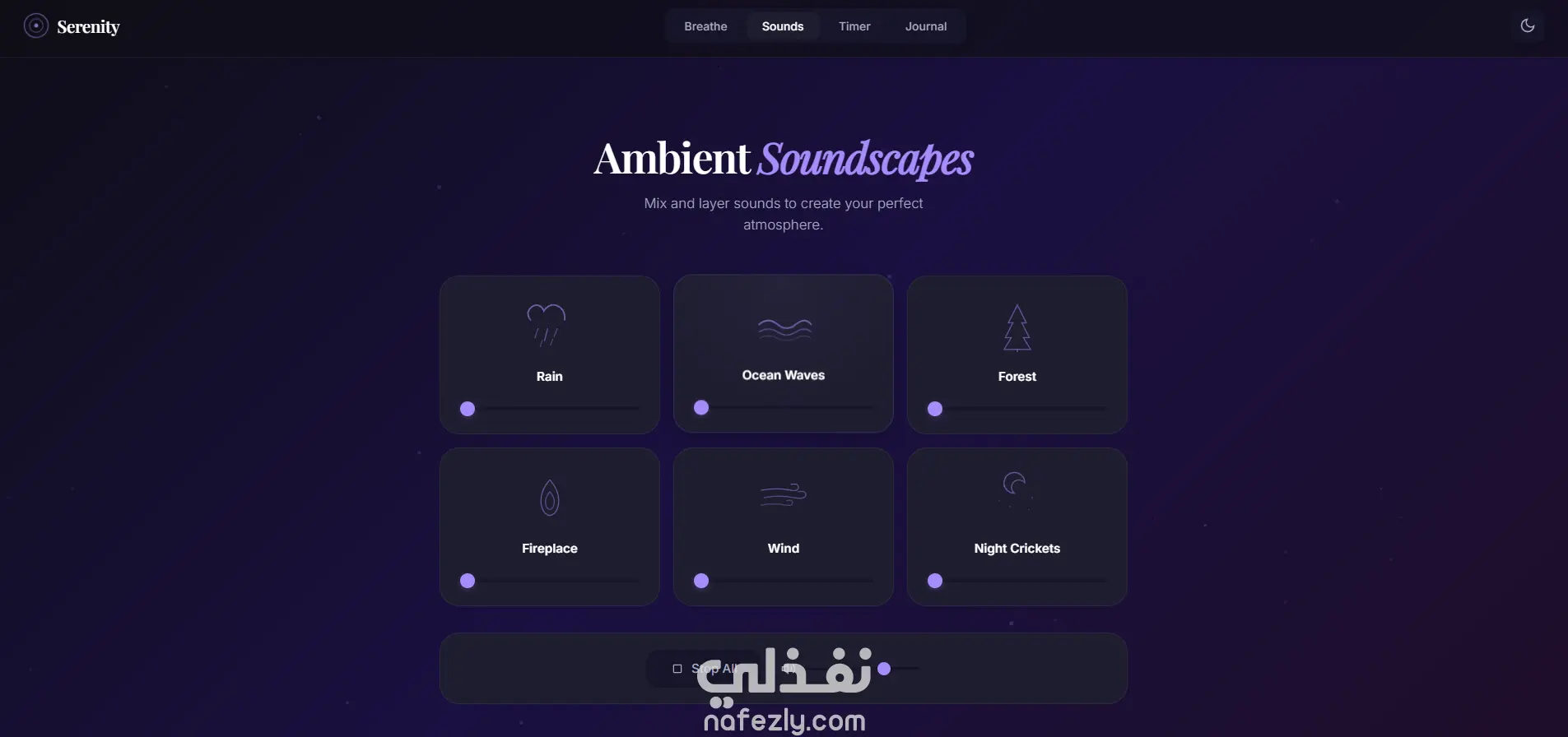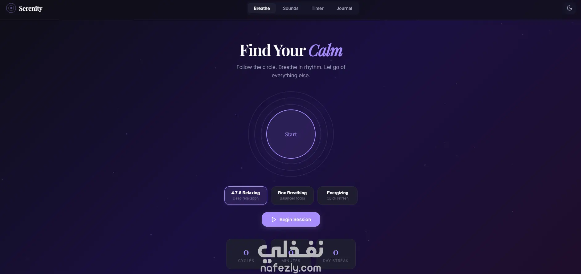 سيرينيتي — تطبيق التأمل والعافية سيرينيتي هو تطبيق ويب مصمم لمساعدتك على إيجاد الهدوء الداخلي والسكينة في حياتك اليومية. يتكون التطبيق من أربعة أقسام رئيسية تعمل معاً لتوفير تجربة استرخاء متكاملة. القسم الأول هو تمارين التنفس، حيث تتبع دائرة متحركة ترشدك خلال أنماط تنفس مختلفة مثل نمط الاسترخاء العميق الذي يتكون من أربع ثوانٍ للشهيق وسبع ثوانٍ لحبس النفس وثمان ثوانٍ للزفير، بالإضافة إلى التنفس المربع والتنفس المنشط. يتتبع التطبيق عدد الدورات والدقائق التي قضيتها في التنفس الواعي ويحفظ سلسلة أيامك المتتالية. القسم الثاني يقدم ستة مشاهد صوتية محيطية يمكنك مزجها وتركيبها حسب رغبتك، وتشمل صوت المطر وأمواج البحر والغابة والمدفأة والرياح وصراصير الليل. كل صوت يُولّد مباشرة في المتصفح باستخدام تقنية الصوت الرقمي دون الحاجة لتحميل أي ملفات، مع إمكانية التحكم بمستوى صوت كل عنصر على حدة وبالمستوى العام. القسم الثالث هو مؤقت التأمل الذي يتيح لك اختيار مدة جلستك من ثلاث دقائق حتى ثلاثين دقيقة، مع حلقة تقدم متحركة تُظهر الوقت المتبقي. يمكنك أيضاً كتابة نيّتك لجلسة اليوم، وعند انتهاء الوقت تظهر رسالة لطيفة تهنئك على إتمام جلستك. القسم الرابع هو دفتر المزاج الذي يسمح لك بتسجيل حالتك المزاجية يومياً عبر ست خيارات تتراوح بين المتألق والهادئ والراضي والمحايد والمنخفض والقلق، مع إمكانية كتابة ملاحظات حرة. يعرض التطبيق سجلاً بصرياً لمزاجك على شكل رسم بياني يساعدك على ملاحظة الأنماط والتغيرات مع مرور الوقت. جميع البيانات تُحفظ محلياً في المتصفح. التصميم يتميز بجماليات عالية تشمل وضعين للعرض فاتح وداكن مع خلفية متحركة من الجسيمات المتصلة وتأثيرات زجاجية شفافة وخطوط أنيقة وحركات سلسة واقتباسات ملهمة تتغير تلقائياً في أسفل الصفحة. التطبيق متجاوب ويعمل بشكل ممتاز على جميع أحجام الشاشات