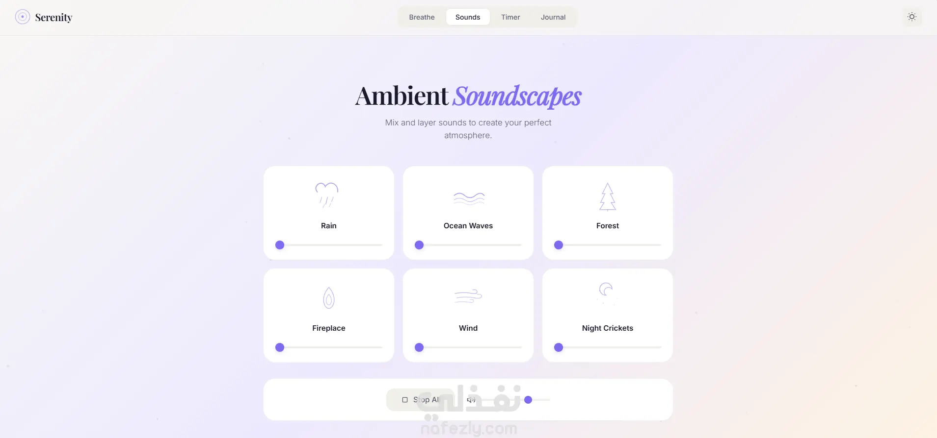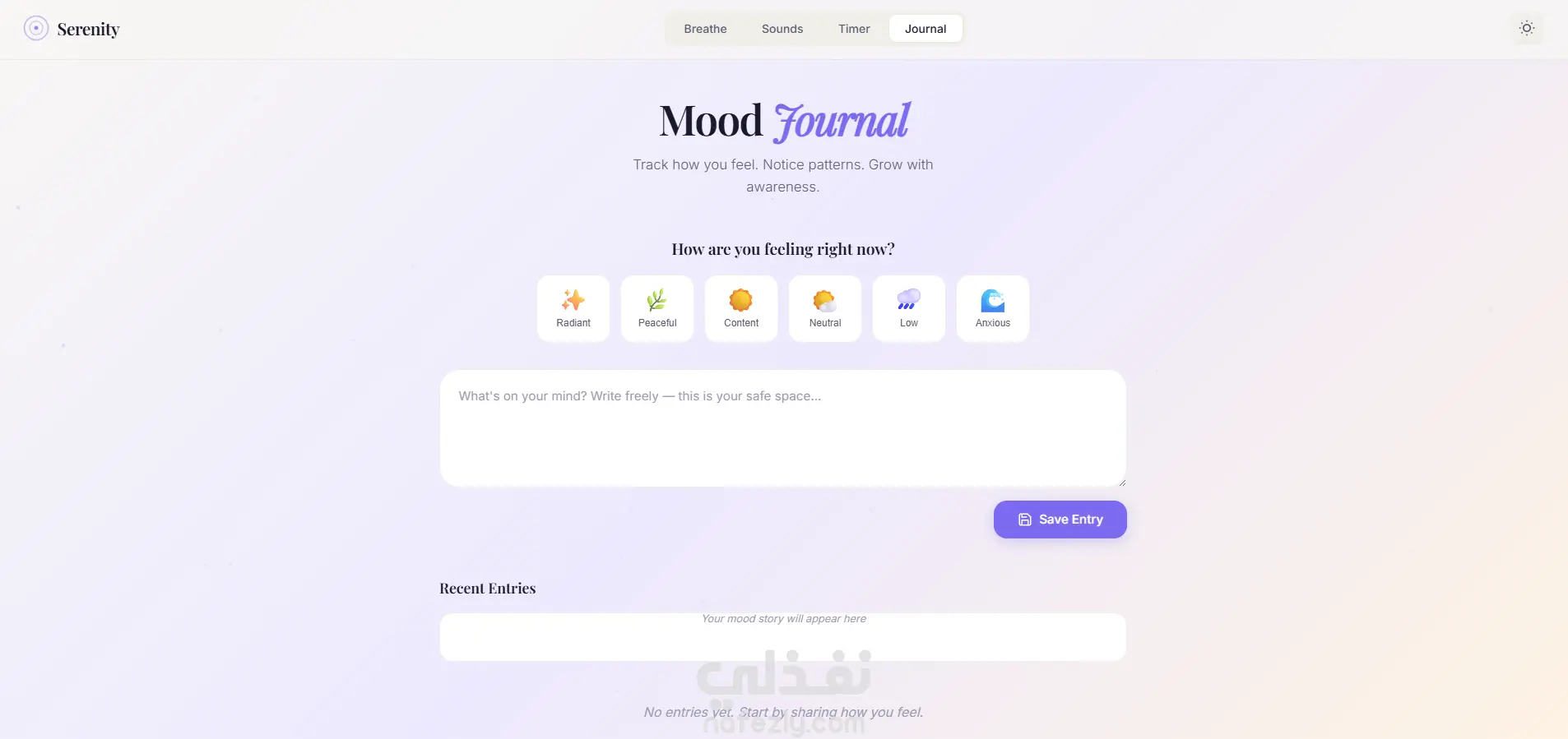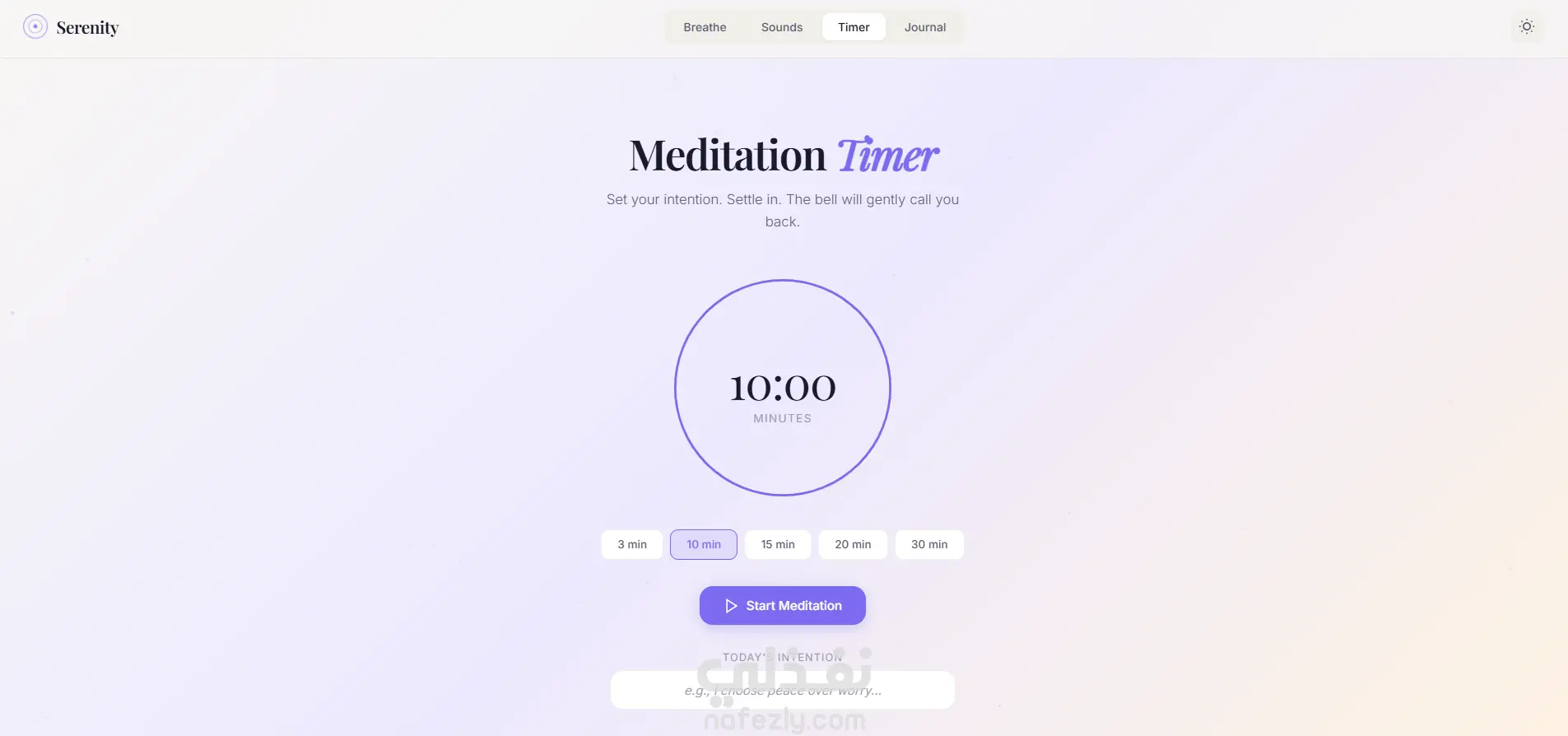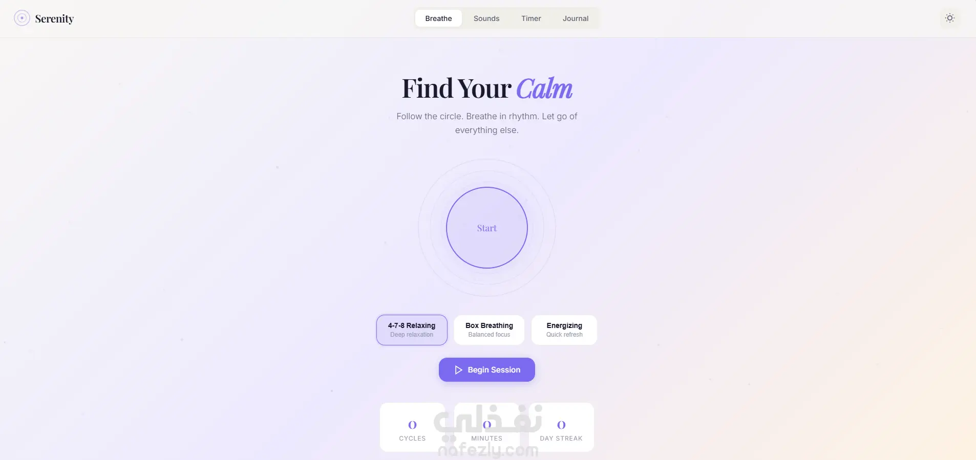 سيرينيتي — تطبيق التأمل والعافية سيرينيتي هو تطبيق ويب مصمم لمساعدتك على إيجاد الهدوء الداخلي والسكينة في حياتك اليومية. يتكون التطبيق من أربعة أقسام رئيسية تعمل معاً لتوفير تجربة استرخاء متكاملة. القسم الأول هو تمارين التنفس، حيث تتبع دائرة متحركة ترشدك خلال أنماط تنفس مختلفة مثل نمط الاسترخاء العميق الذي يتكون من أربع ثوانٍ للشهيق وسبع ثوانٍ لحبس النفس وثمان ثوانٍ للزفير، بالإضافة إلى التنفس المربع والتنفس المنشط. يتتبع التطبيق عدد الدورات والدقائق التي قضيتها في التنفس الواعي ويحفظ سلسلة أيامك المتتالية. القسم الثاني يقدم ستة مشاهد صوتية محيطية يمكنك مزجها وتركيبها حسب رغبتك، وتشمل صوت المطر وأمواج البحر والغابة والمدفأة والرياح وصراصير الليل. كل صوت يُولّد مباشرة في المتصفح باستخدام تقنية الصوت الرقمي دون الحاجة لتحميل أي ملفات، مع إمكانية التحكم بمستوى صوت كل عنصر على حدة وبالمستوى العام. القسم الثالث هو مؤقت التأمل الذي يتيح لك اختيار مدة جلستك من ثلاث دقائق حتى ثلاثين دقيقة، مع حلقة تقدم متحركة تُظهر الوقت المتبقي. يمكنك أيضاً كتابة نيّتك لجلسة اليوم، وعند انتهاء الوقت تظهر رسالة لطيفة تهنئك على إتمام جلستك. القسم الرابع هو دفتر المزاج الذي يسمح لك بتسجيل حالتك المزاجية يومياً عبر ست خيارات تتراوح بين المتألق والهادئ والراضي والمحايد والمنخفض والقلق، مع إمكانية كتابة ملاحظات حرة. يعرض التطبيق سجلاً بصرياً لمزاجك على شكل رسم بياني يساعدك على ملاحظة الأنماط والتغيرات مع مرور الوقت. جميع البيانات تُحفظ محلياً في المتصفح. التصميم يتميز بجماليات عالية تشمل وضعين للعرض فاتح وداكن مع خلفية متحركة من الجسيمات المتصلة وتأثيرات زجاجية شفافة وخطوط أنيقة وحركات سلسة واقتباسات ملهمة تتغير تلقائياً في أسفل الصفحة. التطبيق متجاوب ويعمل بشكل ممتاز على جميع أحجام الشاشات