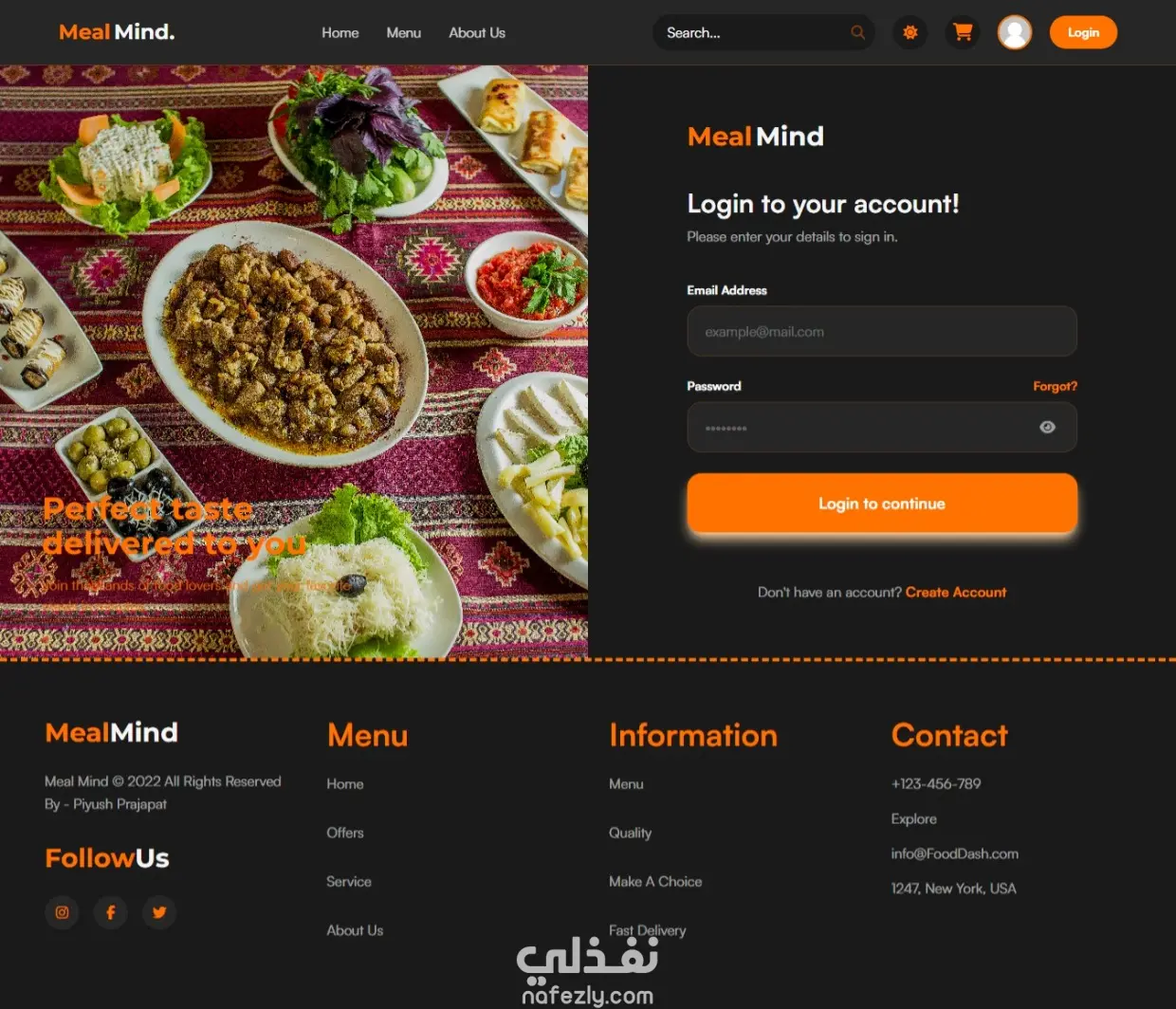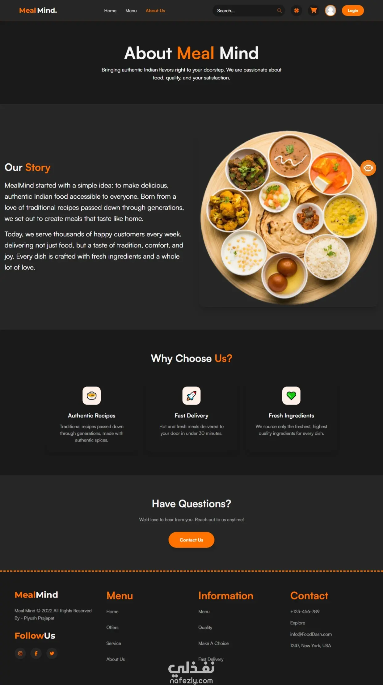 MealMind هو تطبيق ويب حديث (SPA) لتوصيل الطعام الهندي، يوفر تجربة تصفح وطلب سريعة بدون إعادة تحميل الصفحات مع أنيميشن احترافي وتنقل سلس. يتميز بتصميم متجاوب بالكامل، دعم الوضع الليلي والنهاري، ونظام سلة وتسوق يعمل في الوقت الحقيقي بدون الحاجة إلى Backend. يتضمن نظام تسجيل دخول، إدارة مستخدم، وشات بوت ذكي لمساعدة العملاء وتتبع الطلبات بسهولة. كما يقوم بإنشاء فواتير PDF تلقائيًا بعد إتمام الطلب باستخدام تقنيات ويب حديثة تضمن أداء عالي وتجربة استخدام مميزة.