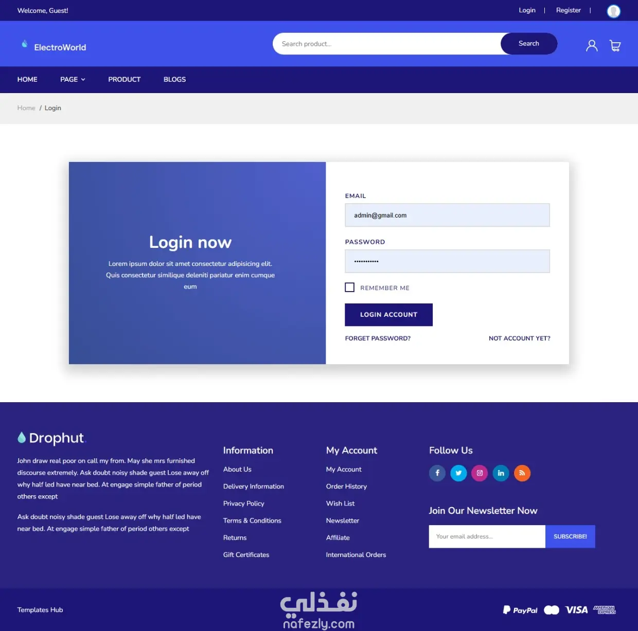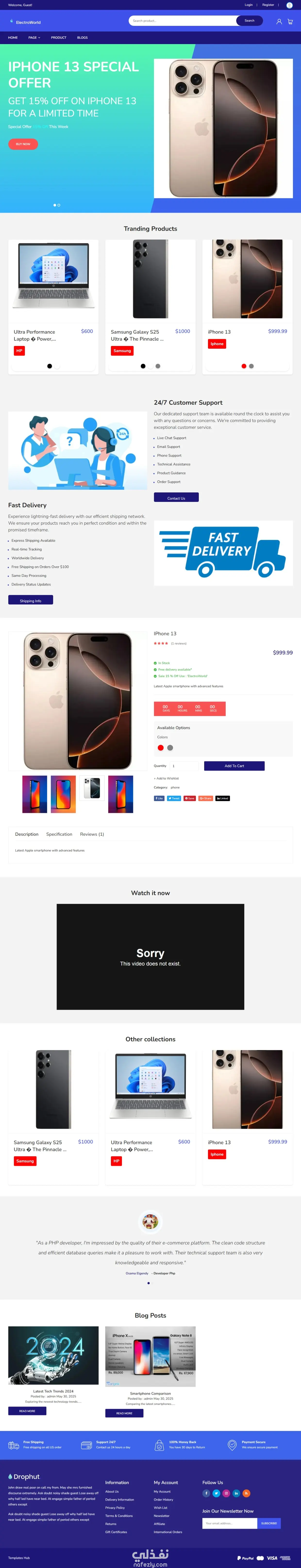 تدعم نظام مستخدمين آمن، إدارة منتجات كاملة (أقسام، علامات تجارية، مخزون)، وسلة تسوق ديناميكية مع إنشاء طلب وفاتورة تلقائيًا.