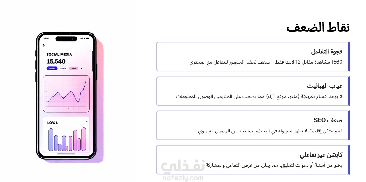 هل لديك موقع أو حساب على صفحات التواصل الاجتماعي وتعاني من عدم التفاعل ؟ هل ترغب في معرفة أهم الفرص المتاحة لتطوير مشروعك ؟ هل ترغب في معرفة أبرز التهديدات التي تود تجنبها ؟ هل تود أن تعرف نقاط القوة والعمل على تعزيزها وتحسينها ومعرفة نقاط الضعف والعمل على تجنبها ؟