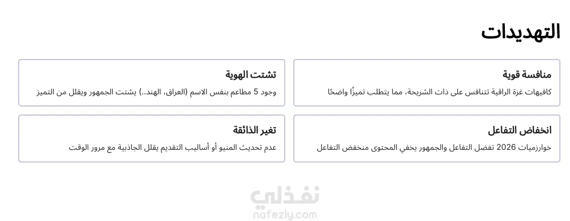 -التهديدات والمخاطر (Threats): والتى ينبغي الحذر منها والتحديات المحتملة وكيفية الاستعداد لمواجهتها.