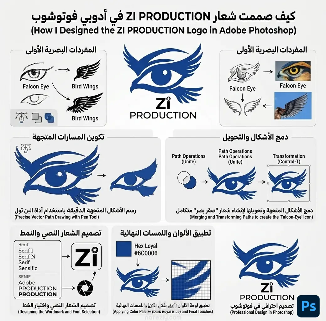 تقرير تصميم شعار ZI Production (بواسطة Adobe Photoshop) تم بناء هذا الشعار ليعكس مزيجاً بين "الرؤية الثاقبة" و**"الانطلاق الإبداعي"**، وقد تم تنفيذه بالكامل باستخدام أدوات برنامج الفوتوشوب باتباع الخطوات التالية: 1. مرحلة التخطيط والمفردات البصرية تحديد العناصر: بدأ التصميم بدمج رمزين قويين؛ عين الصقر كرمز للدقة والرؤية الإنتاجية، والأجنحة كرمز للحرية والإبداع في المحتوى. الرسم المبدئي: تم استخدام مراجع بصرية حقيقية لعين الصقر وأجنحة الطيور لضمان توازن الأبعاد وانسيابية الخطوط. 2. البناء الهندسي (Pen Tool & Vector Paths) رسم المسارات المتجهة: باستخدام أداة Pen Tool في فوتوشوب، تم رسم المنحنيات بدقة عالية لضمان حدة الأطراف (Sharp edges) واحترافية الشكل. الدمج والتحويل: تم استخدام عمليات المسارات (Path Operations) لدمج شكل العين مع الأجنحة لتشكيل وحدة بصرية واحدة متناغمة تعبر عن الكيان. التعديل الهيكلي: تم استخدام أداة التحويل (Control-T) لضبط زوايا الميل لتعطي إيحاءً بالحركة والديناميكية. 3. التصميم النصي (Typography) اختيار الخط: تم اختيار خط "Sans Serif" عصري وعريض لكلمة PRODUCTION ليعطي طابعاً بالثبات والموثوقية. تخصيص الحروف: في كلمة Zi، تم استبدال النقطة فوق حرف (i) بأيقونة فتحة عدسة الكاميرا (Aperture)، وهي لمسة فنية تؤكد على الهوية الإنتاجية والسينمائية للمنصة. 4. الهوية اللونية واللمسات النهائية لوحة الألوان: تم اعتماد اللون الأزرق الملكي الداكن (Dark Royal Blue)، وهو لون يرمز إلى الثقة، الاحترافية، والعمق التقني. الدقة النهائية: تمت مراجعة "البكسلة" والحدود لضمان ظهور الشعار بشكل مثالي في كافة المقاسات، سواء على شاشات الجوال أو المطبوعات الكبيرة. النتيجة النهائية: شعار يجمع بين القوة البصرية والدلالة الرمزية، يعبر عن مبرمج وصانع محتوى يرى التفاصيل بدقة الصقر وينفذها بجمالية الفن.