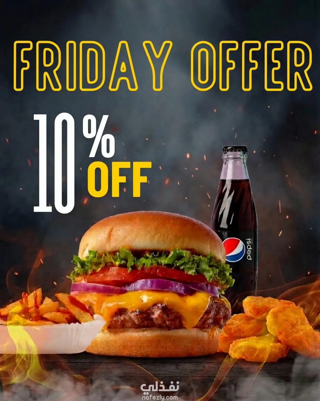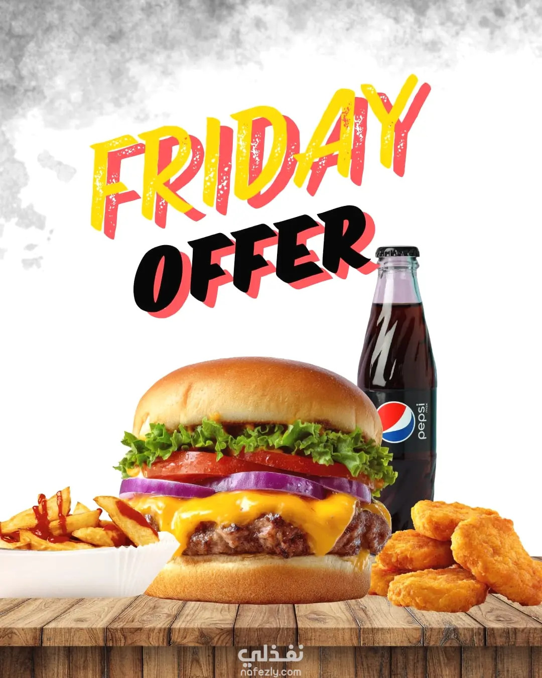 I designed a high-converting social media advertisement for a restaurant’s "Friday Offer." The goal was to create a visually appetizing and modern design that captures the audience's attention instantly. Key features of this project: Visual Enhancement: Improved the lighting and colors of the food items (Burger, Fries, Nuggets) to make them look more "juicy" and fresh. Background Composition: Used a dark, smoky, and fiery background to create a premium and "grilled" feel. Typography: Used bold, energetic fonts for "FRIDAY OFFER" to emphasize the urgency and excitement. Layout: Organized the elements to ensure a balanced flow between the visuals and the promotional details. Tools Used: Adobe Photoshop (Color Grading, Compositing, and Retouching).