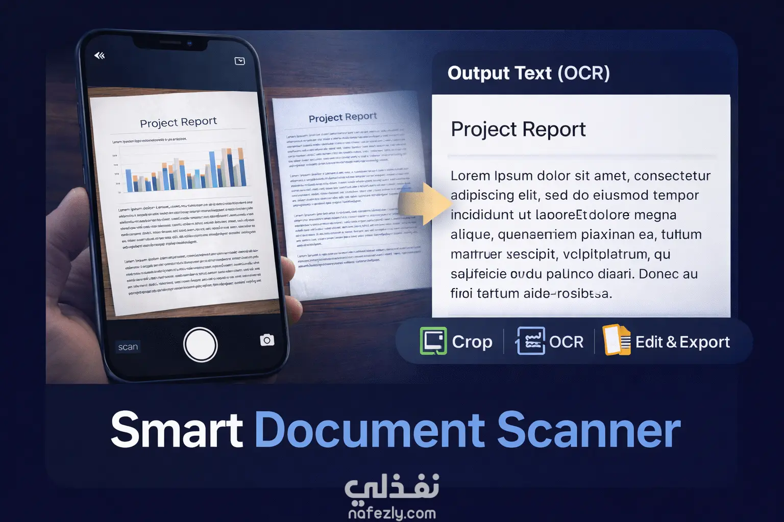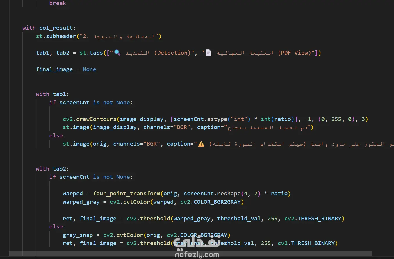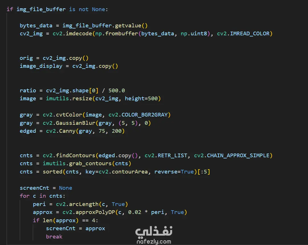الكشف التلقائي عن حدود المستند: استخدام خوارزمية Canny Edge Detection و Contour Detection لتحديد زوايا الورقة بدقة وفصلها عن الخلفية مهما كانت معقدة.