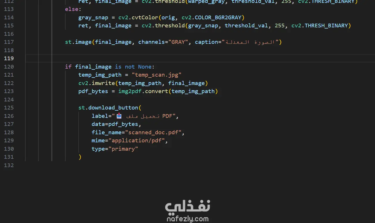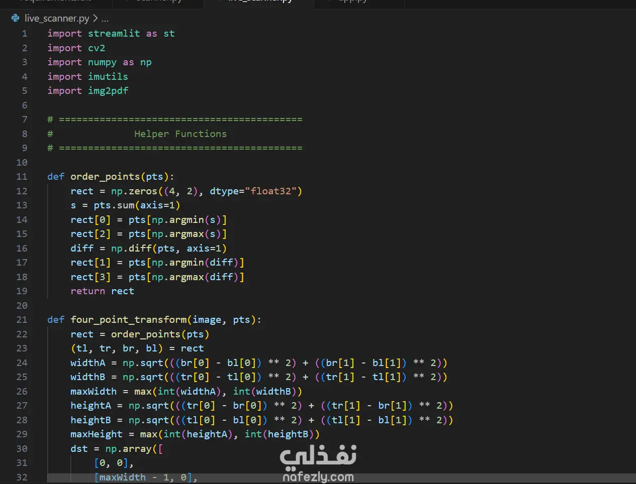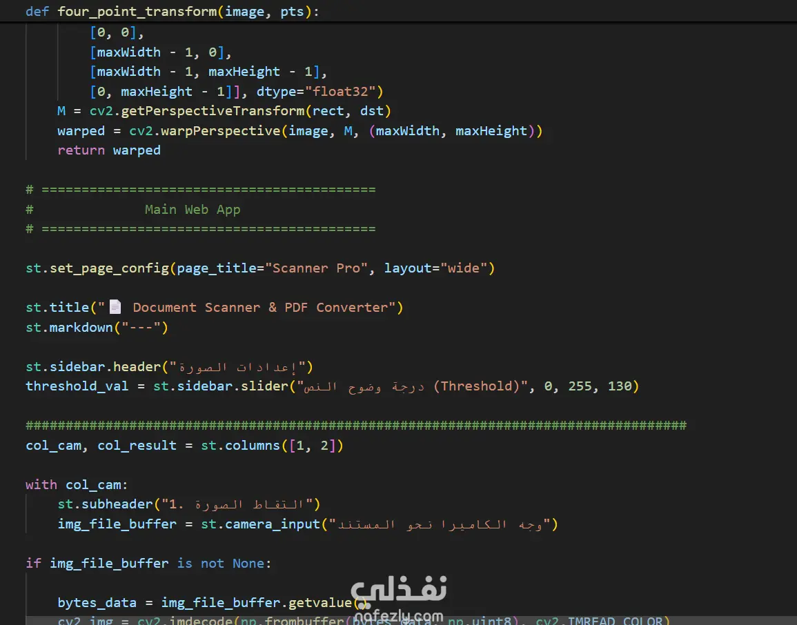 قمت بتطوير نظام متكامل يعتمد على تقنيات الرؤية الحاسوبية (Computer Vision) لتحويل الصور العادية للمستندات الملتقطة بواسطة الكاميرا إلى ملفات PDF احترافية وعالية الجودة. يهدف المشروع إلى محاكاة أجهزة الماسح الضوئي (Scanner) التقليدية من خلال معالجة الصور برمجياً لتصحيح العيوب الناتجة عن التصوير اليدوي.