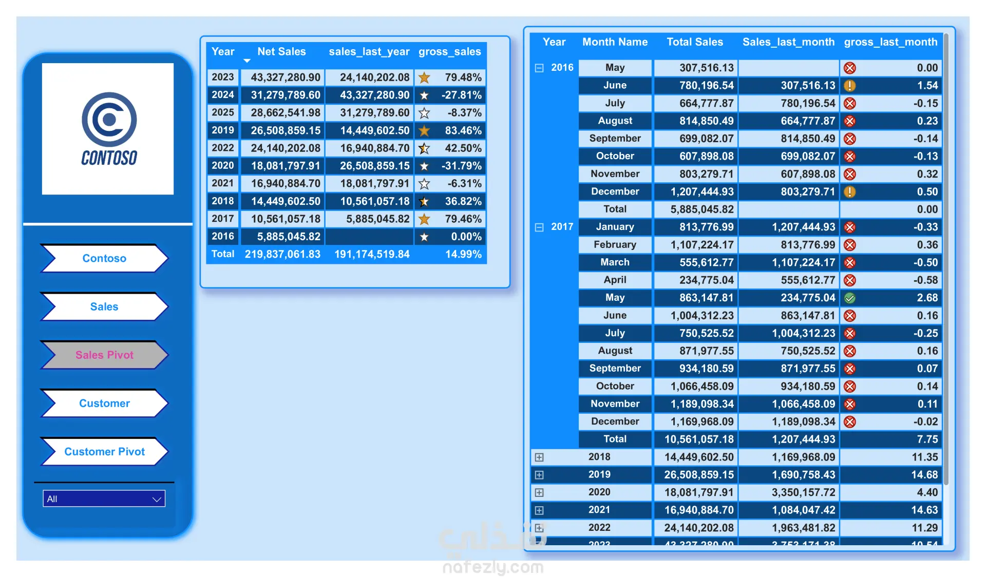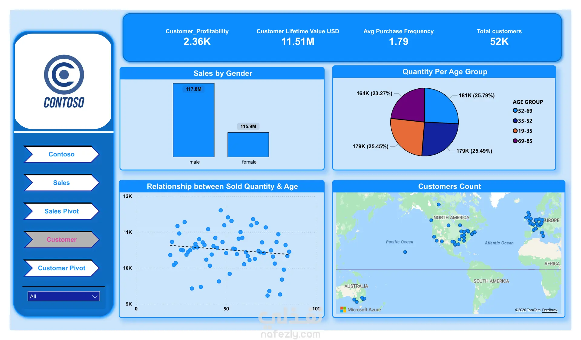 مشروع تحليل كونتوسو (Contoso Analysis) يقدم هذا المشروع تحليلاً بيانياً شاملاً باستخدام مزيج تقني متطور يشمل SQL لاستخراج وتجهيز البيانات، Python للتحليل الاستكشافي المتقدم، وPower Query لعمليات الـ ETL، وصولاً إلى عرض النتائج عبر لوحات تحكم تفاعلية في Power BI. أهم النتائج والمخرجات: الأداء المالي: تحليل مبيعات بقيمة 219.84 مليون دولار بهامش ربح 56.11%، مع رصد انخفاض في متوسط قيمة الطلب (AOV) ليصل إلى 1,825 دولار عام 2025. سلوك العملاء: تحليل بيانات 52 ألف عميل (بقيمة عمرية 11.51 مليون دولار)، حيث أظهرت النتائج تفوقاً في مشتريات الذكور وتوزيعاً عمرياً متزناً (19-85 عاماً). الكفاءة التشغيلية: تصدّر المتجر الإلكتروني المشهد ببيع 293 ألف وحدة، متفوقاً على الفروع الفيزيائية. إدارة التكاليف والنمو: تحديد الأجهزة الحاسوبية والمنزلية كأكبر مسببات التكلفة، مع بناء تقارير ديناميكية لمقارنة الأداء السنوي والشهري (YoY/MoM) بدقة عالية.