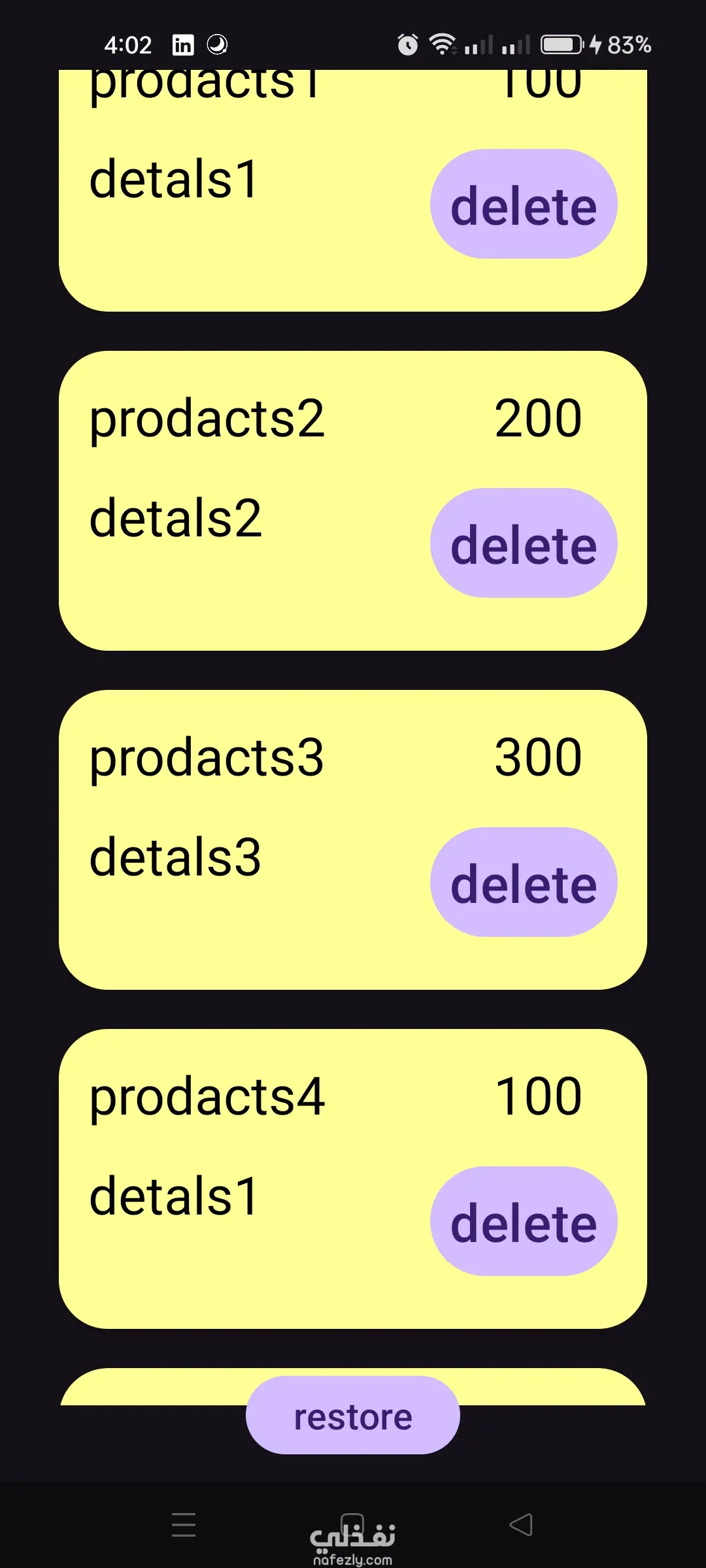 تطبيق أندرويد لإدارة قائمة المنتجات باستخدام RecyclerView، يتيح عرض المنتجات مع السعر والتفاصيل وإمكانية حذف العناصر واسترجاعها بسهولة. التقنيات المستخدمة: Kotlin RecyclerView ViewBinding LinearLayoutManager List Management المميزات: عرض قائمة المنتجات بشكل منظم داخل Cards. إمكانية حذف أي عنصر من القائمة. زر Restore لاسترجاع العناصر المحذوفة. تصميم بسيط وسهل الاستخدام. أداء سريع عند التعامل مع القوائم.