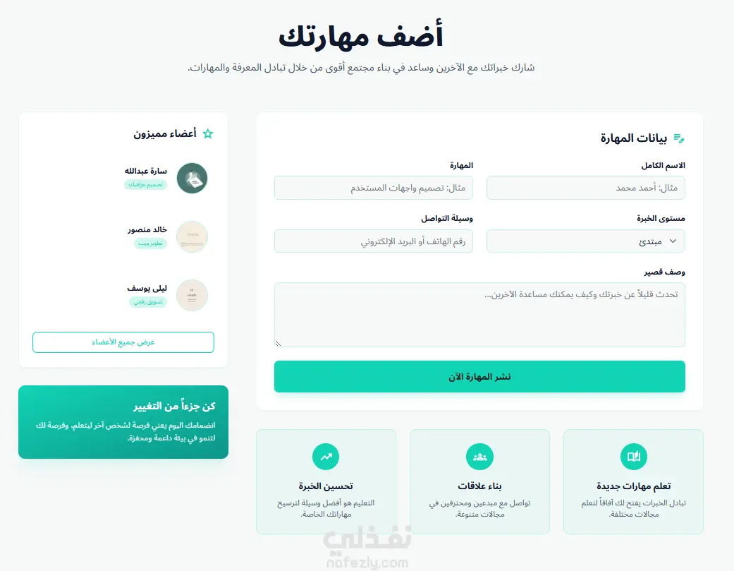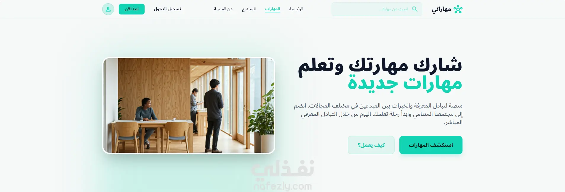 يهدف هذا الموقع إلى إنشاء مجتمع رقمي يتيح للأفراد تبادل المهارات والخبرات فيما بينهم بطريقة بسيطة ومجانية. يمكن للمستخدمين مشاركة المهارات التي يجيدونها مثل البرمجة أو التصميم أو اللغات، وفي المقابل تعلم مهارات جديدة من الآخرين. يساعد الموقع على تشجيع التعاون وتبادل المعرفة بين الشباب، كما يساهم في تطوير المهارات الشخصية والمهنية بطريقة تفاعلية وسهلة الوصول.