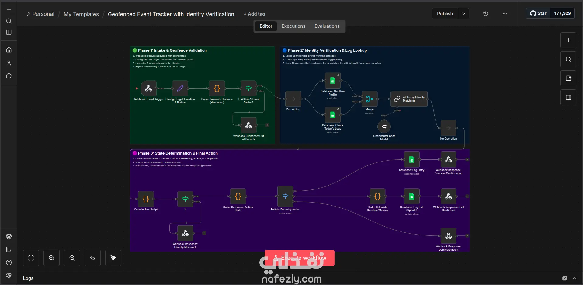 تصميم مسار عمل (Workflow) ذكي لاستقبال بيانات الدخول والخروج عبر Webhooks بناءً على الموقع الجغرافي (Geofencing). يقوم النظام بمقاطعة البيانات مع قاعدة بيانات المستخدمين لمنع التكرار، ويستخدم أكواد JavaScript مخصصة لحساب مدة البقاء والمقاييس الأخرى، ثم يرسل تأكيداً لحظياً بتحديث قاعدة البيانات.