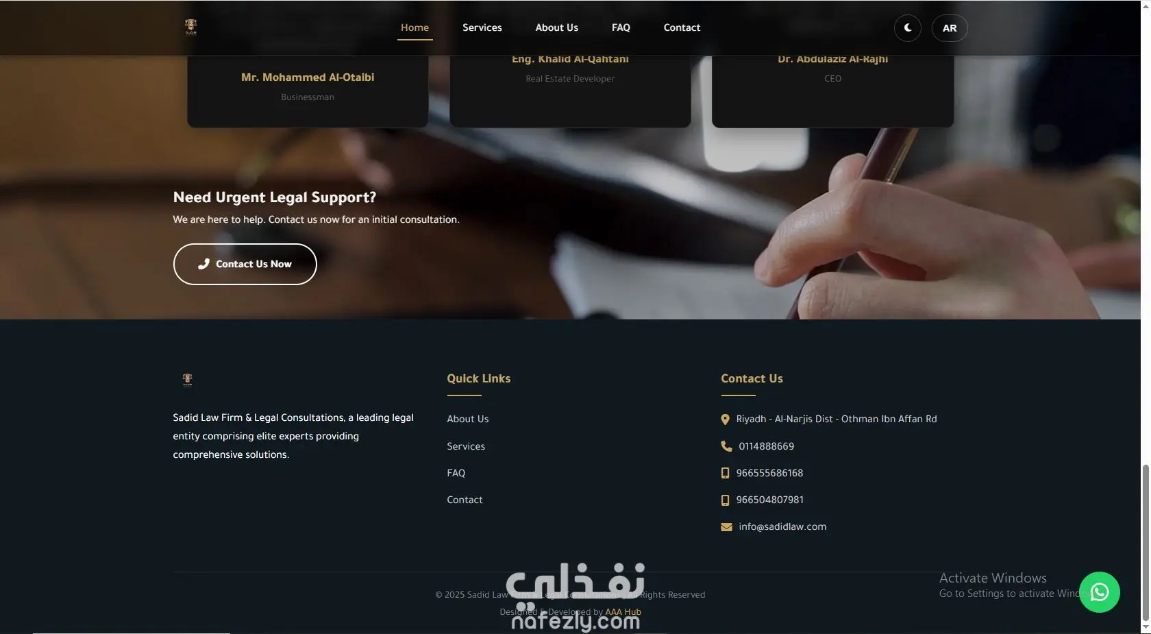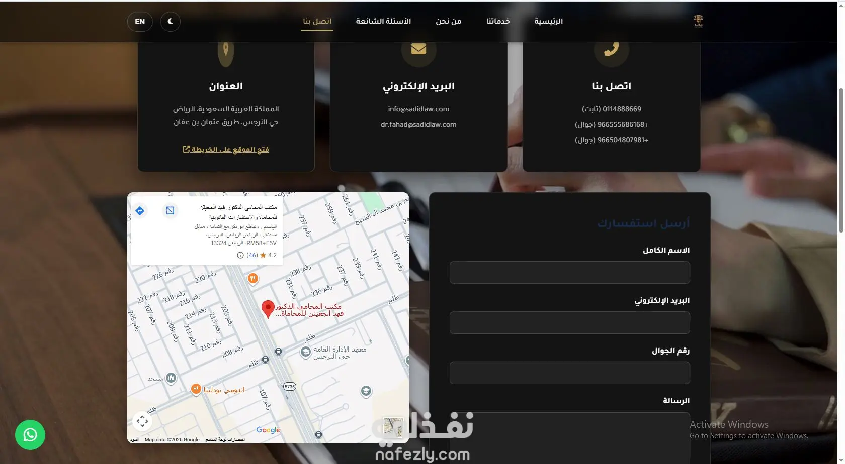 تم تصميم وتطوير موقع إلكتروني متكامل لشركة "سديد للمحاماة" في المملكة العربية السعودية، بهدف تعزيز التواجد الرقمي للشركة وعرض خدماتها القانونية باحترافية تعكس هويتها المؤسسية. الموقع تم بناؤه بالكامل باستخدام أكواد نظيفة (Clean Code) لضمان السرعة والأداء العالي، مع دعم كامل للغتين العربية والإنجليزية. أبرز المميزات التي تم تنفيذها: 1. دعم كامل لتعدد اللغات (Bilingual Support): نسخة عربية (RTL) ونسخة إنجليزية (LTR) متكاملة. زر تبديل لغة فوري يحافظ على تجربة المستخدم. ضبط اتجاهات النصوص والأيقونات والقوائم تلقائياً حسب اللغة المختارة. 2. تجربة مستخدم تفاعلية (Interactive UX): نظام النوافذ المنبثقة (Modals): عرض تفاصيل 25 خدمة قانونية مختلفة داخل نوافذ منبثقة دون الحاجة لإعادة تحميل الصفحة، مما يوفر سرعة تصفح فائقة. البحث المباشر (Live Search): محرك بحث ذكي في صفحة "الأسئلة الشائعة" يفلتر النتائج فورياً بمجرد الكتابة. الوضع الليلي (Dark/Light Mode): إمكانية التبديل بين الوضع النهاري والليلي لراحة العين، مع حفظ تفضيل المستخدم. 3. تصميم عصري ومتجاوب (Responsive Design): الموقع متجاوب 100% مع جميع الشاشات (موبايل، تابلت، ديسكتوب). تصميم الهوية البصرية بألوان فخمة (الكحلي والذهبي) تعكس هيبة القطاع القانوني. تأثيرات حركية (Animations) عند التمرير (Scroll) لظهور العناصر بشكل انسيابي. 4. المحتوى والهيكلة: 25 خدمة قانونية متخصصة: تم تبويبها وعرضها بتفاصيل دقيقة تشمل (الشركات، الاستثمار، الجنايات، العقارات، إلخ). مركز معرفة (FAQ): يضم 30 سؤالاً وجواباً قانونياً مفصلاً. صفحات تعريفية: صفحة "من نحن" تبرز خبرات الفريق (أكثر من 20 عاماً) والمؤهلات الأكاديمية. 5. أدوات التواصل والتحويل (Conversion Tools): نموذج اتصال ذكي: مع إشعارات نجاح (Toast Notifications) تفاعلية عند الإرسال. خرائط جوجل: مدمجة بتصميم مخصص (Custom Style) لمقر الشركة في الرياض. زر واتساب عائم: للتواصل المباشر في أي وقت. أرقام تفاعلية: يمكن الضغط عليها للاتصال مباشرة من الموبايل.