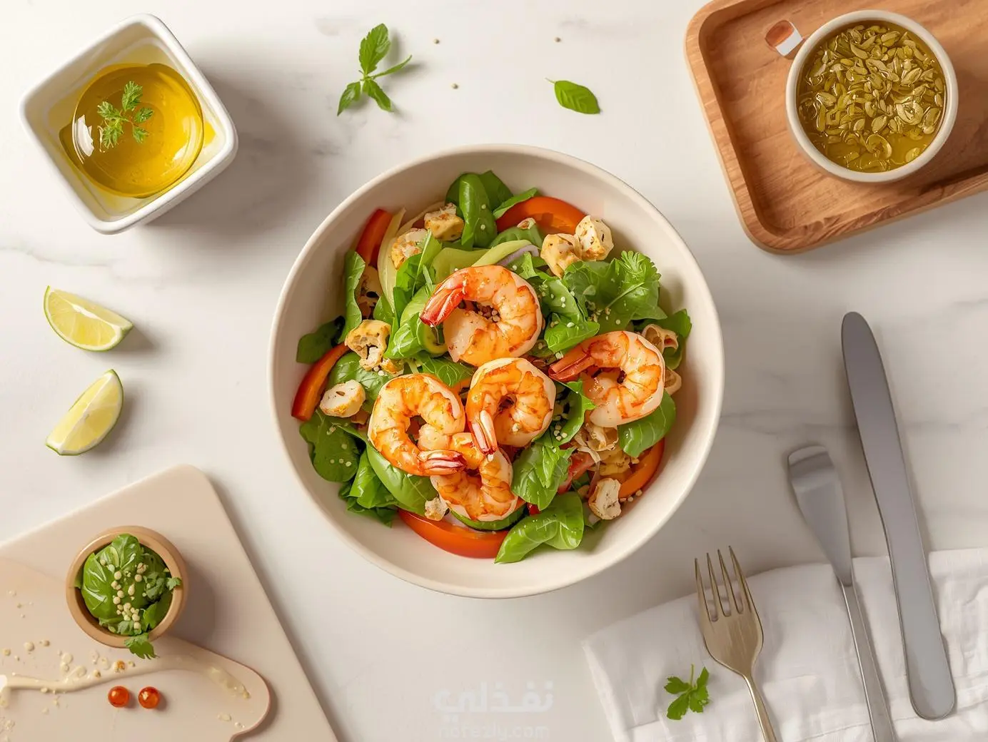 تصميم إعلان احترافي لمطعم يقدم أطباق صحية، يركز على وعاء سلطة طازج غني بالخضروات والجمبري. التصوير من الأعلى لإبراز مكونات الطبق الطازجة، مع عناصر تصميم مسطحة وعصرية حول الوجبة. الخلفية فاتحة لإبراز ألوان الطعام الزاهية، مع تركيز على ترتيب نظيف ومتناسق للصور، ليكون الإعلان جذابًا واحترافيًا على إنستغرام. الهدف من العمل هو جذب العملاء بطريقة مرئية ومشجعة على تجربة الطعام الصحي.