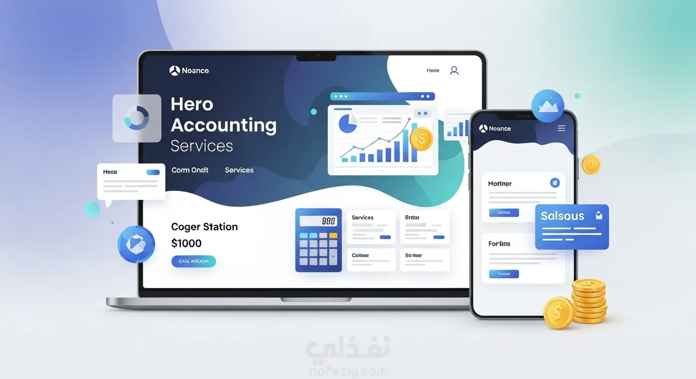 تصميم بسيط وحديث لصفحة هبوط لموقع خدمات محاسبية. يظهر في التصميم لابتوب أو شاشة تعرض رسوم بيانية مالية مثل المخططات الدائرية والخطية، مع أيقونات تعبر عن المحاسبة مثل الآلة الحاسبة، الفواتير، العملات، والملفات المالية. بجانبها يظهر شخص يعمل على تحليل البيانات المالية. الألوان هادئة مثل الأزرق والأبيض لتعطي إحساس بالثقة والاحترافية، مع مساحة على اليسار لعنوان رئيسي مثل: