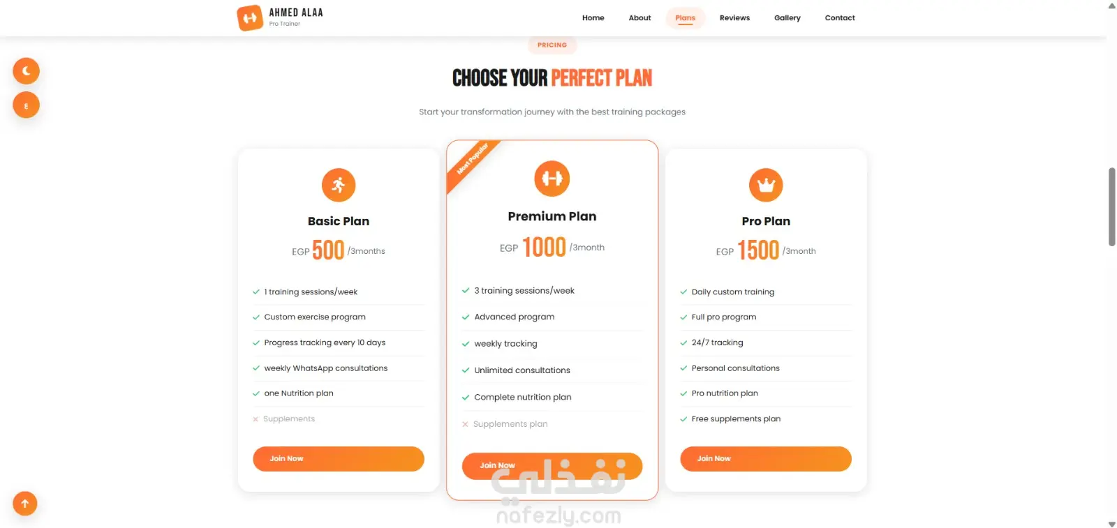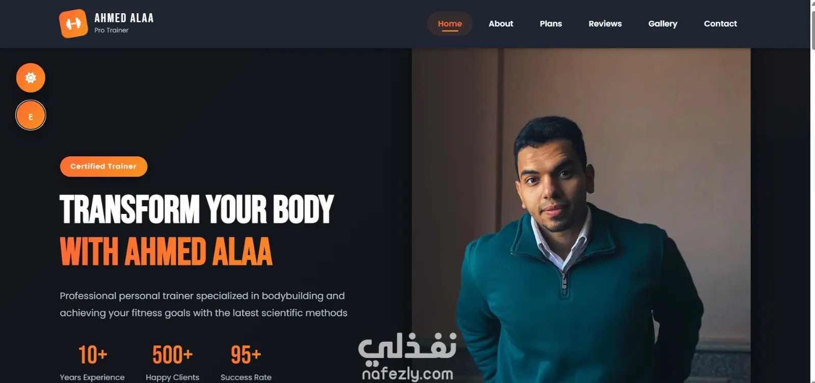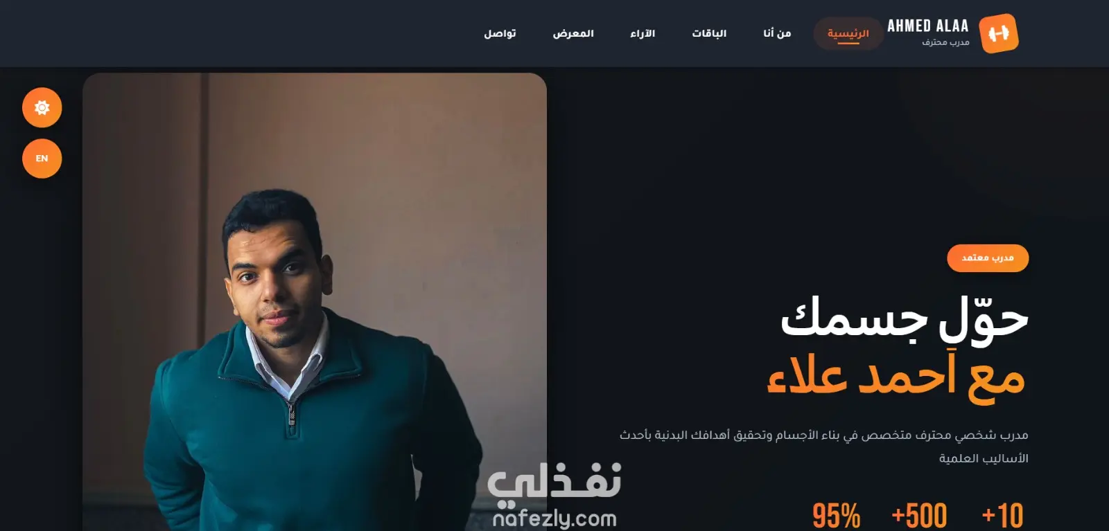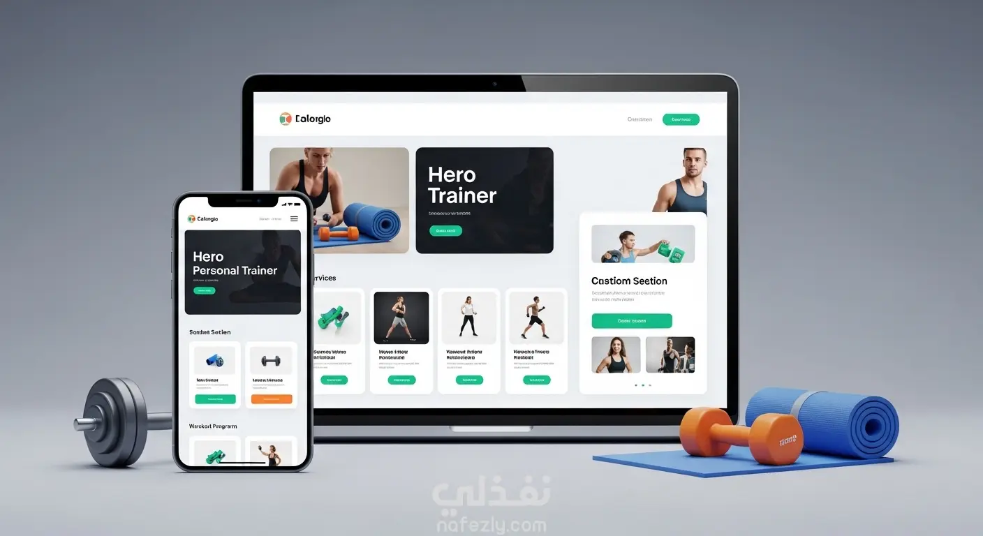 تصميم حديث وبسيط لصفحة هبوط لموقع كابتن جيم شخصي. يظهر في التصميم كابتن لياقة بدنية بملابس رياضية داخل الجيم، مع عناصر رياضية مثل الدمبل، البار، وأجهزة التمرين في الخلفية. التصميم يعطي إحساس بالطاقة والتحفيز باستخدام ألوان قوية مثل الأسود والأحمر أو البرتقالي.