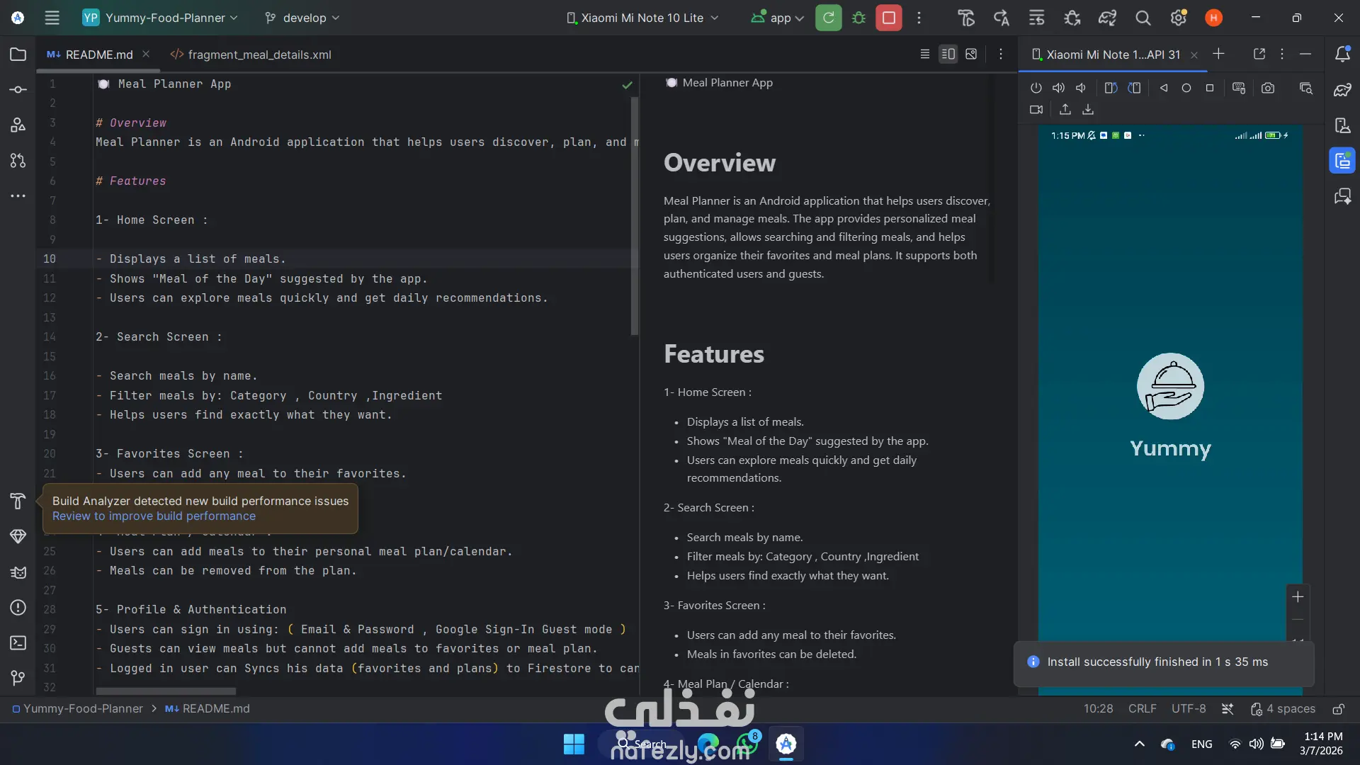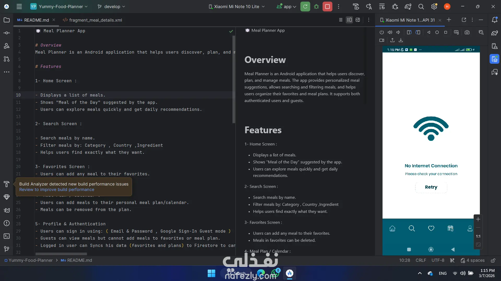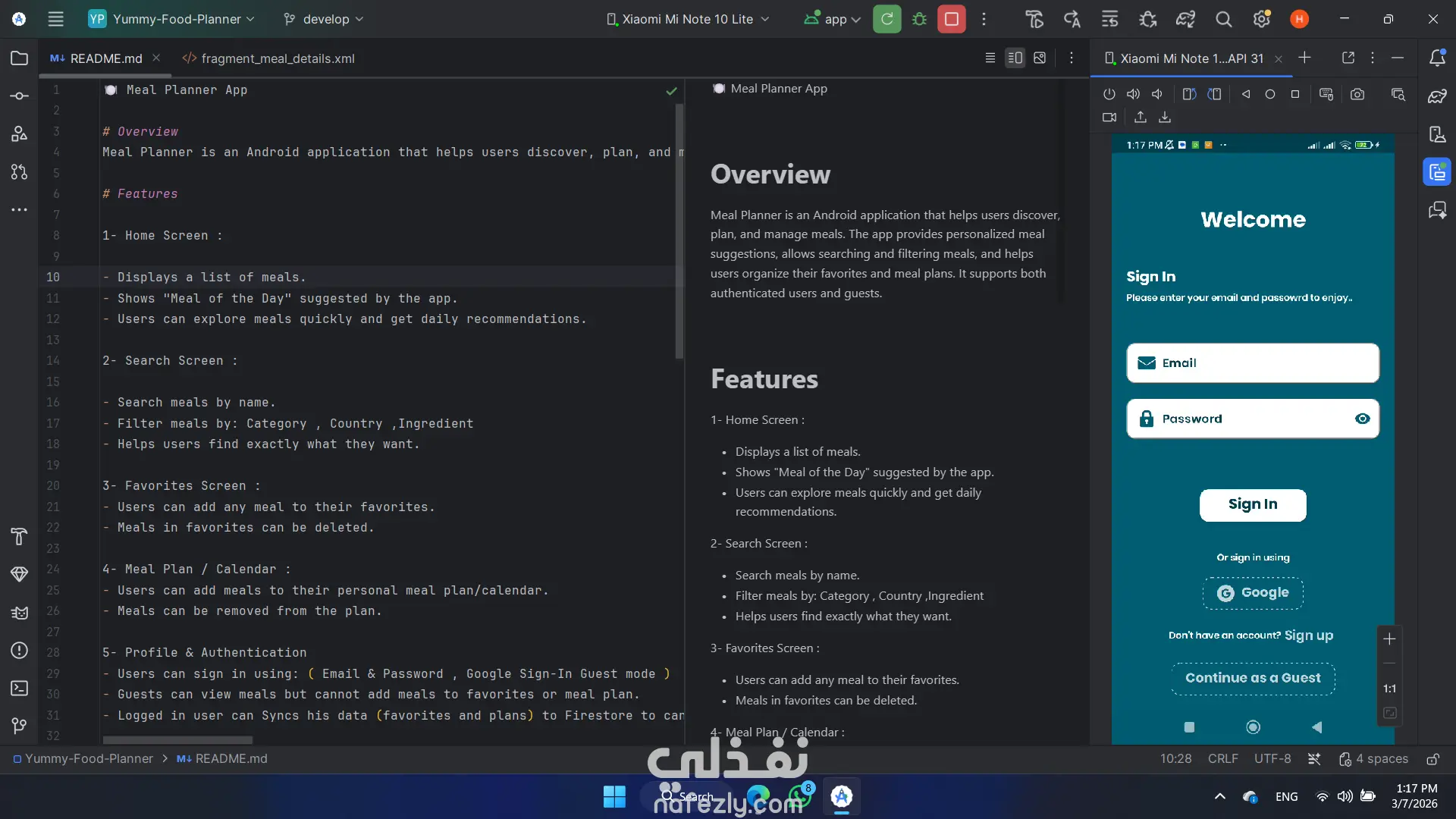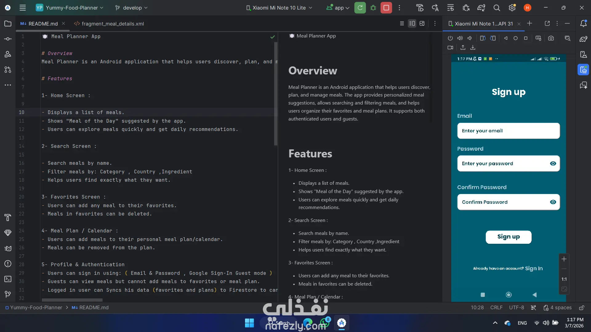 تطبيق Meal Planner يساعد المستخدمين على استكشاف وتنظيم الوجبات اليومية بسهولة، مع إمكانية البحث عن الأطعمة، حفظ المفضلات، وإنشاء خطة وجبات شخصية مزامنة مع الحساب عبر الأجهزة. يحتوى التطبيق على : - الصفحة الرئيسية: عرض قائمة بالوجبات مع اقتراح Meal of the Day يوميًا. - البحث والتصفية: البحث عن الوجبات بالاسم مع إمكانية التصفية حسب الفئة – الدولة – المكونات. - المفضلات: إمكانية إضافة أو حذف الوجبات من قائمة المفضلات. - خطة الوجبات / التقويم: إنشاء خطة وجبات شخصية مع إمكانية التعديل والحذف. التسجيل والمصادقة: -تسجيل باستخدام البريد الإلكتروني وكلمة المرور أو Google Sign-In أو وضع Guest. - المستخدم الضيف يمكنه التصفح فقط. - المستخدم المسجل يمكنه مزامنة بياناته مع Firestore للوصول إليها من أي جهاز.