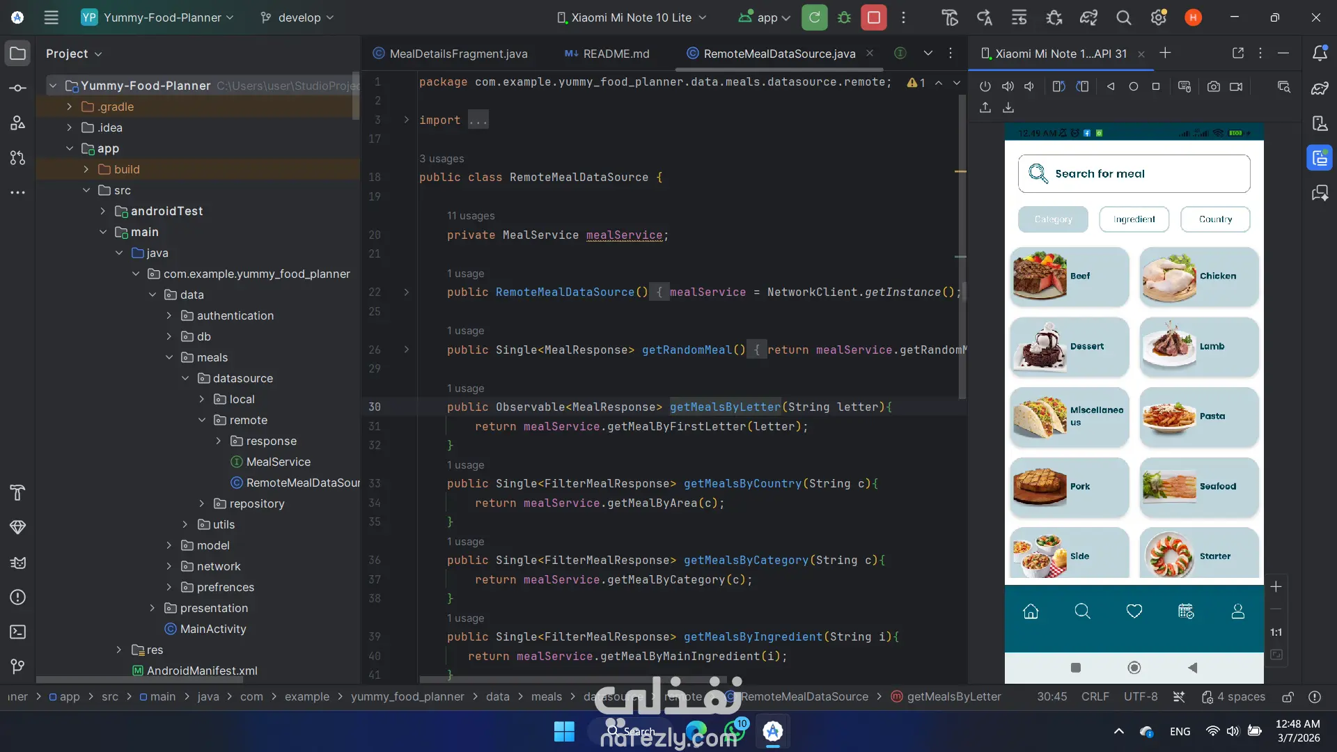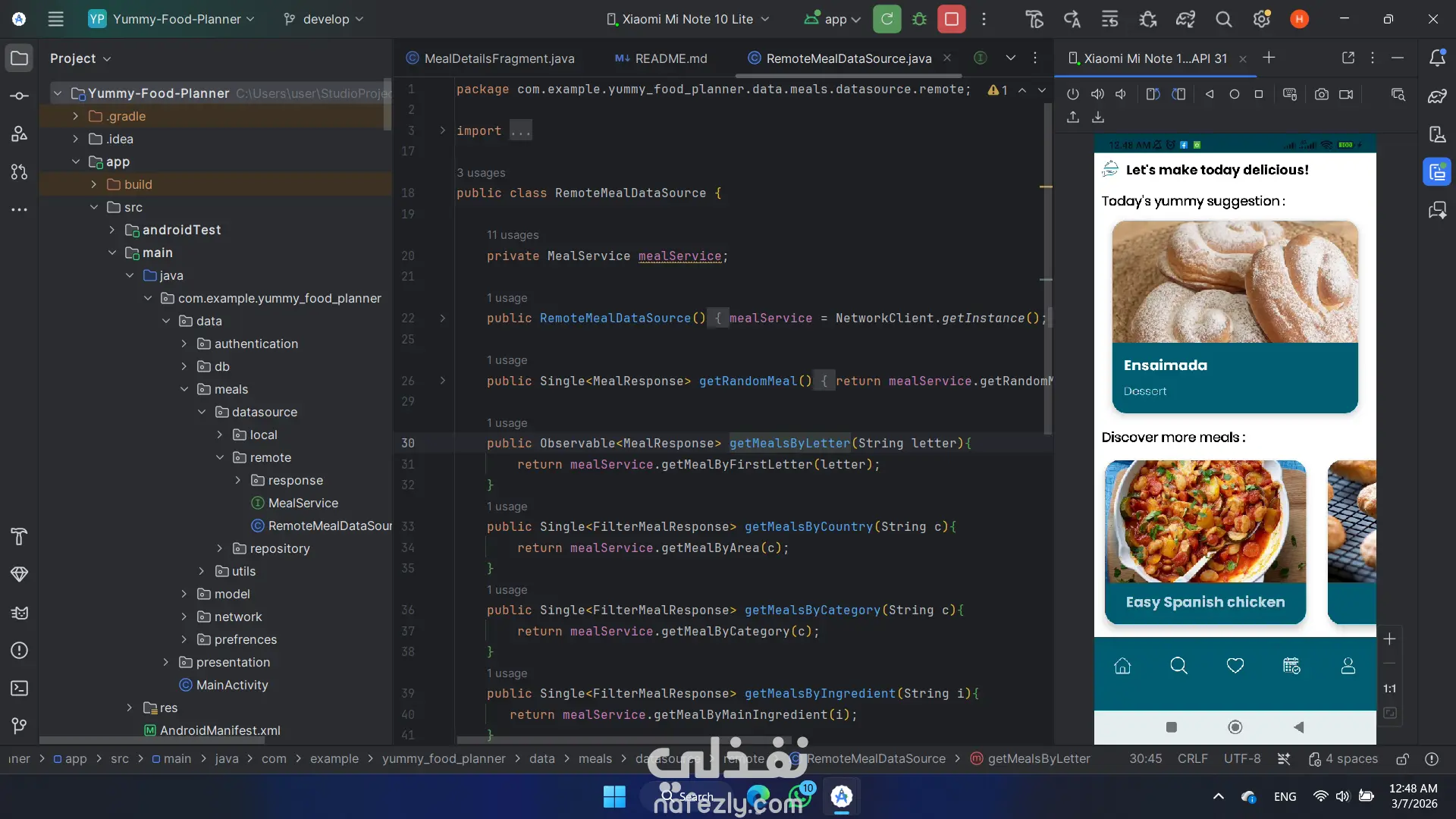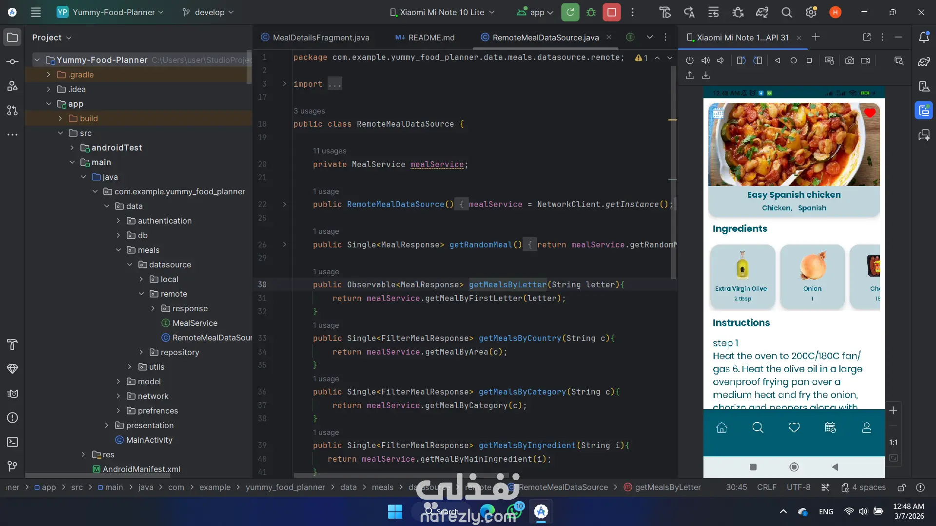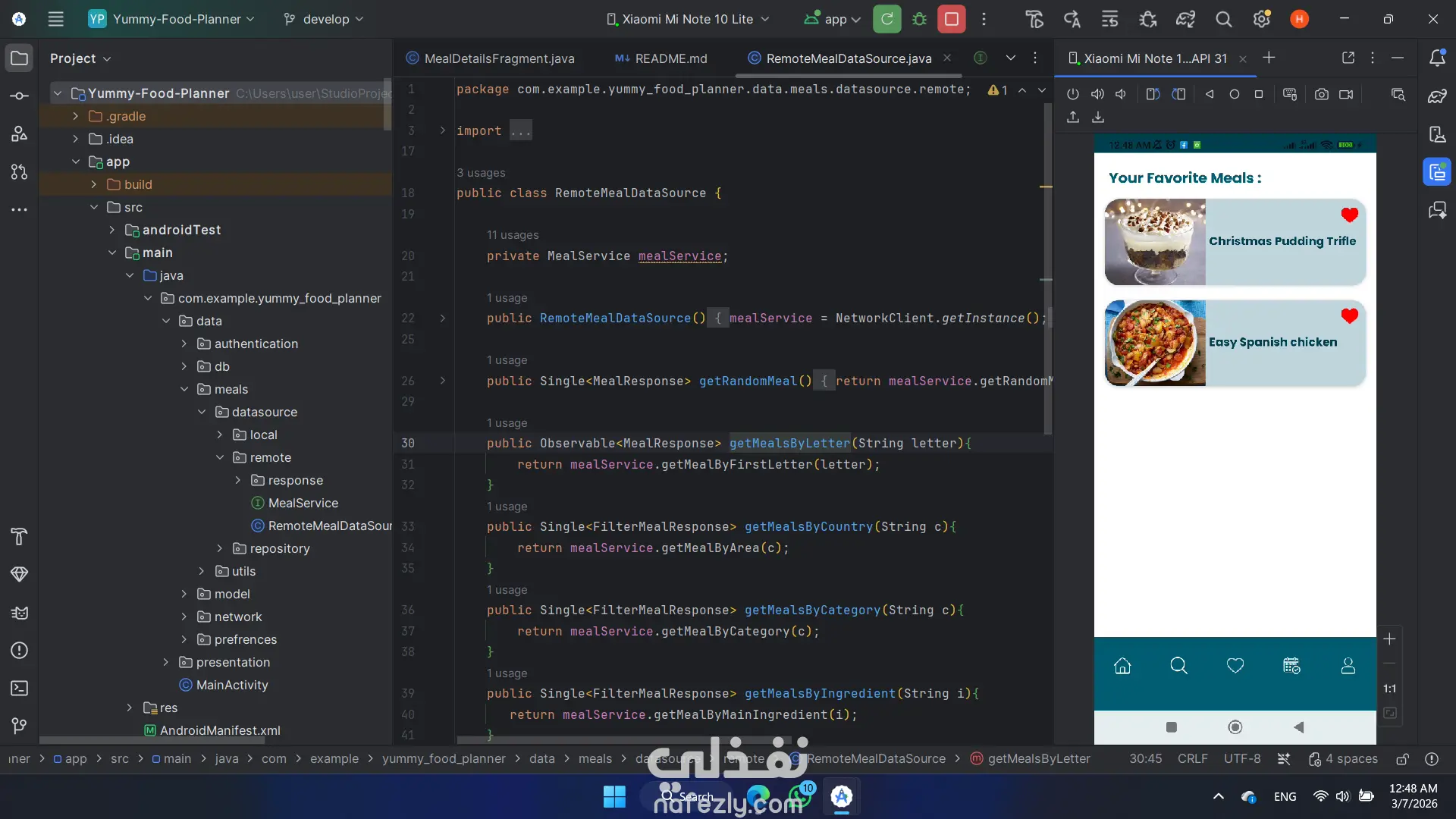 تطبيق Meal Planner يساعد المستخدمين على استكشاف وتنظيم الوجبات اليومية بسهولة، مع إمكانية البحث عن الأطعمة، حفظ المفضلات، وإنشاء خطة وجبات شخصية مزامنة مع الحساب عبر الأجهزة. يحتوى التطبيق على : - الصفحة الرئيسية: عرض قائمة بالوجبات مع اقتراح Meal of the Day يوميًا. - البحث والتصفية: البحث عن الوجبات بالاسم مع إمكانية التصفية حسب الفئة – الدولة – المكونات. - المفضلات: إمكانية إضافة أو حذف الوجبات من قائمة المفضلات. - خطة الوجبات / التقويم: إنشاء خطة وجبات شخصية مع إمكانية التعديل والحذف. التسجيل والمصادقة: -تسجيل باستخدام البريد الإلكتروني وكلمة المرور أو Google Sign-In أو وضع Guest. - المستخدم الضيف يمكنه التصفح فقط. - المستخدم المسجل يمكنه مزامنة بياناته مع Firestore للوصول إليها من أي جهاز.