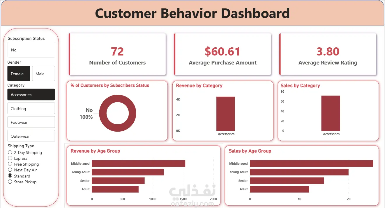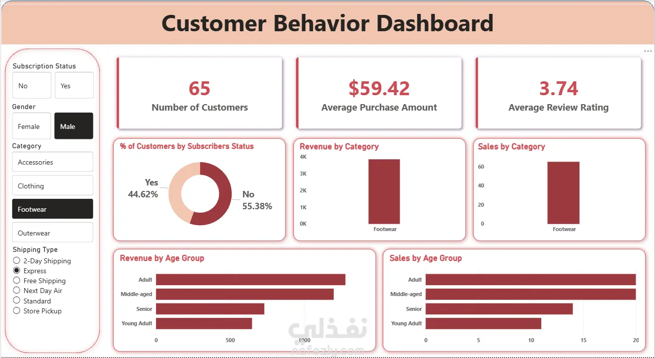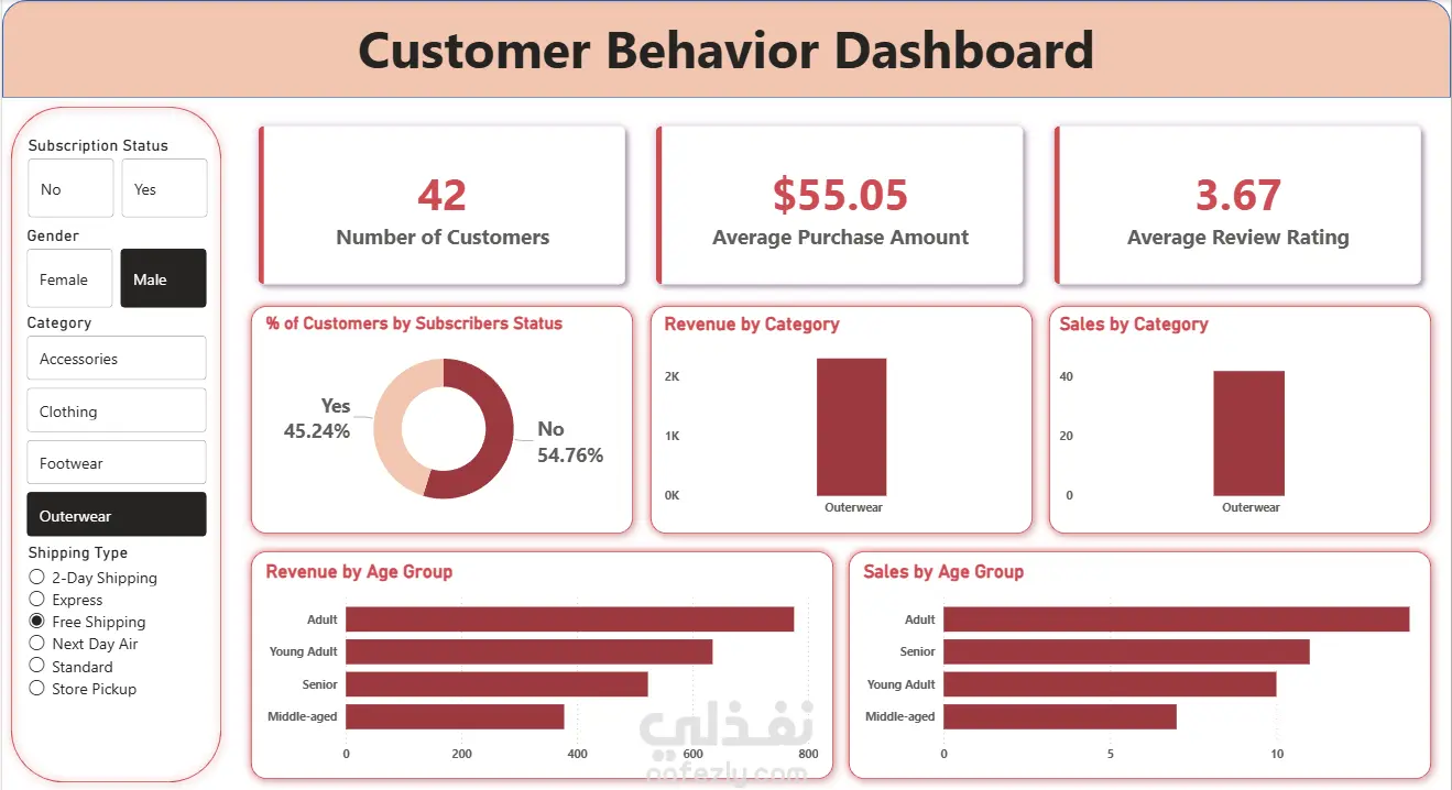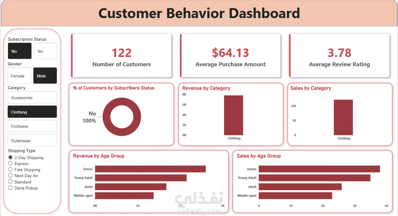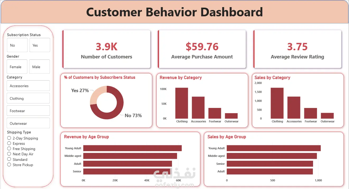 مشروع تحليل سلوك التسوق لدى العملاء (Customer Shopping Behavior Analysis) يهدف إلى تحليل سلوك العملاء وفهم أنماط الشراء باستخدام تقنيات تحليل البيانات وذكاء الأعمال. من خلال هذا المشروع تم تحويل البيانات الخام إلى Dashboard تفاعلية تساعد في استخراج رؤى واضحة تدعم اتخاذ القرار. يعرض المشروع مؤشرات مهمة مثل: - إجمالي عدد العملاء - متوسط قيمة المشتريات - متوسط تقييم العملاء - نسبة العملاء المشتركين وغير المشتركين كما يتضمن تحليلات تفصيلية مثل: - الإيرادات حسب الفئة (Clothing, Accessories, Footwear, Outerwear) - عدد المبيعات حسب الفئة - الإيرادات حسب الفئة العمرية - المبيعات حسب الفئة العمرية بالإضافة إلى ذلك، تحتوي لوحة التحكم على فلاتر تفاعلية تسمح بتخصيص التحليل حسب: - حالة الاشتراك (Subscription Status) - النوع (Gender) - الفئة (Category) - نوع الشحن (Shipping Type) يساعد هذا التحليل الشركات على: - فهم سلوك العملاء بشكل أعمق - تحديد الفئات الأكثر تحقيقًا للإيرادات - تحسين استراتيجيات التسويق والمبيعات - اتخاذ قرارات مبنية على البيانات تم تصميم الـ Dashboard بشكل واضح وسهل الاستخدام لتمكين المستخدم من استكشاف البيانات بسرعة واستخراج Insights قيمة.