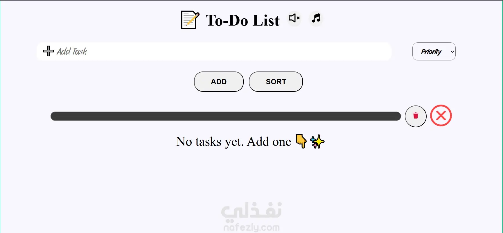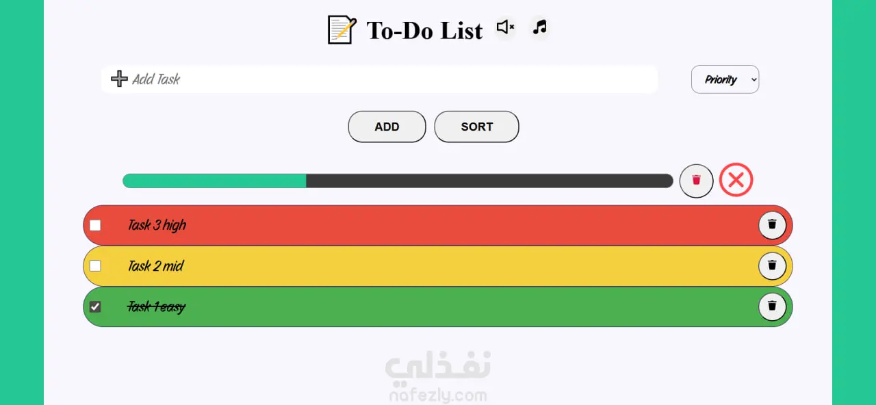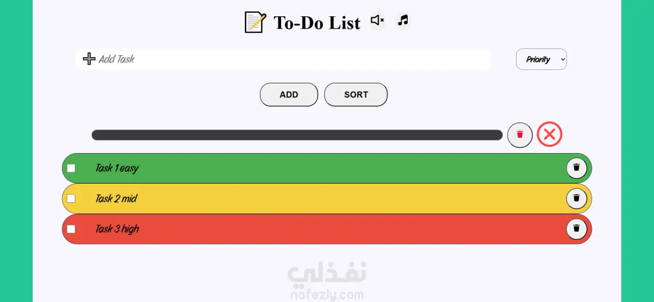 تطبيق ويب لإدارة المهام اليومية يتيح إضافة المهام مع تحديد مستوى الأولوية (Low / Medium / High)، حيث يتم تغيير لون المهمة و امكانية ترتيبها بناءً على مستوى الأهمية لتحسين تنظيم الوقت وزيادة الإنتاجية.