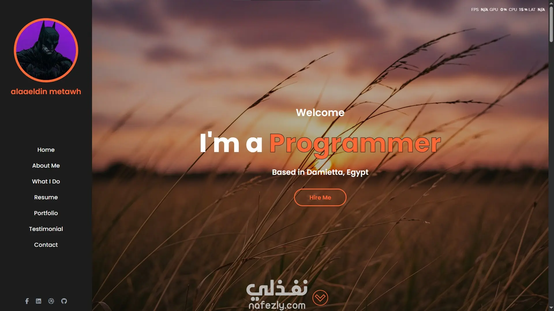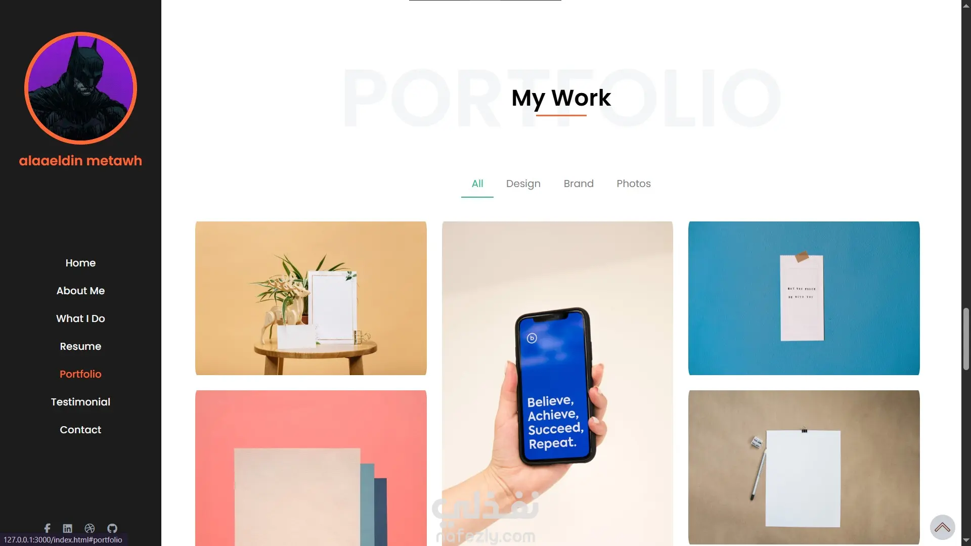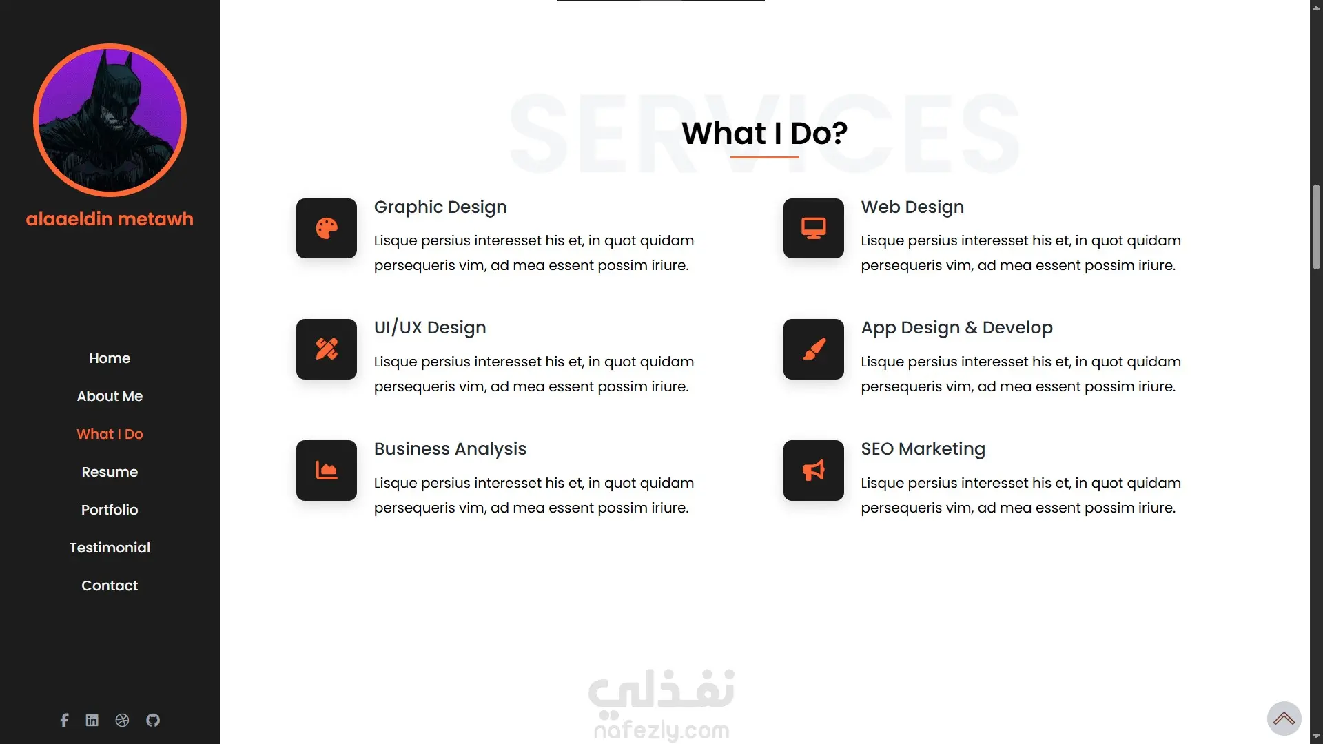 Home – About Me – What I Do – Resume – Portfolio – Testimonial – Contact