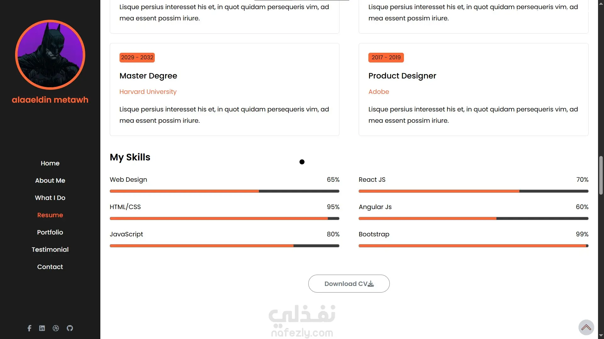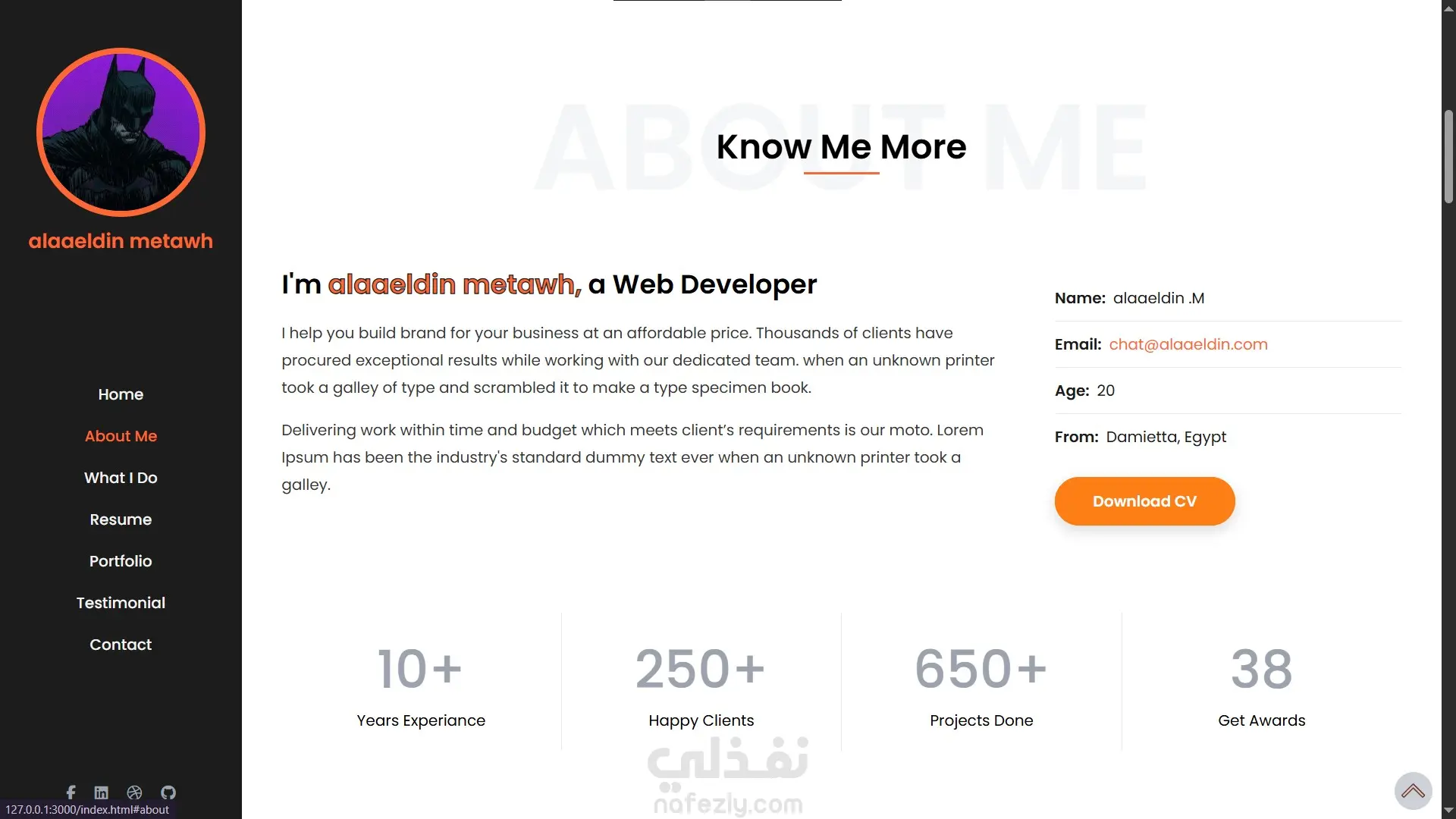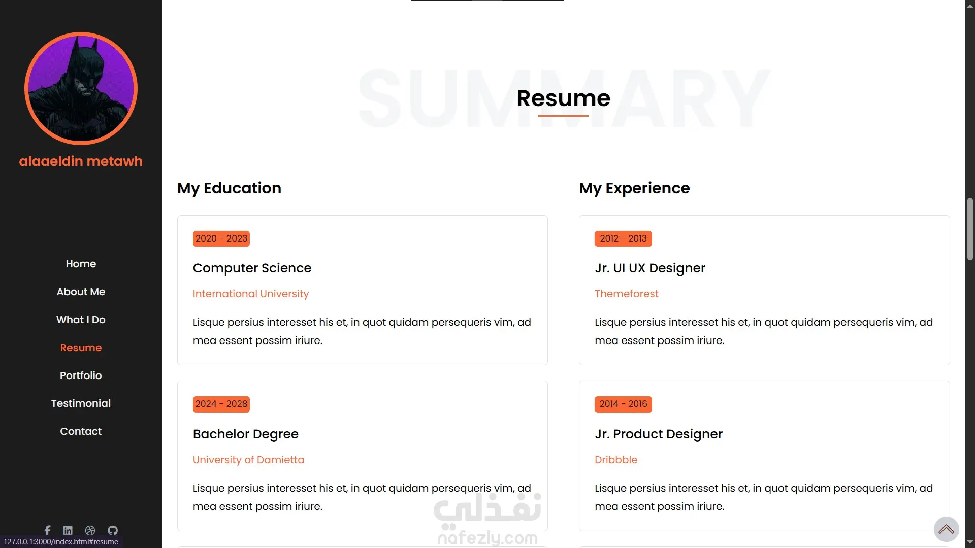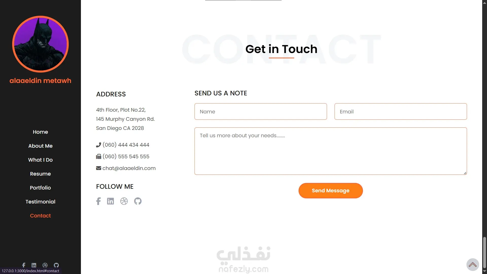 Home – About Me – What I Do – Resume – Portfolio – Testimonial – Contact