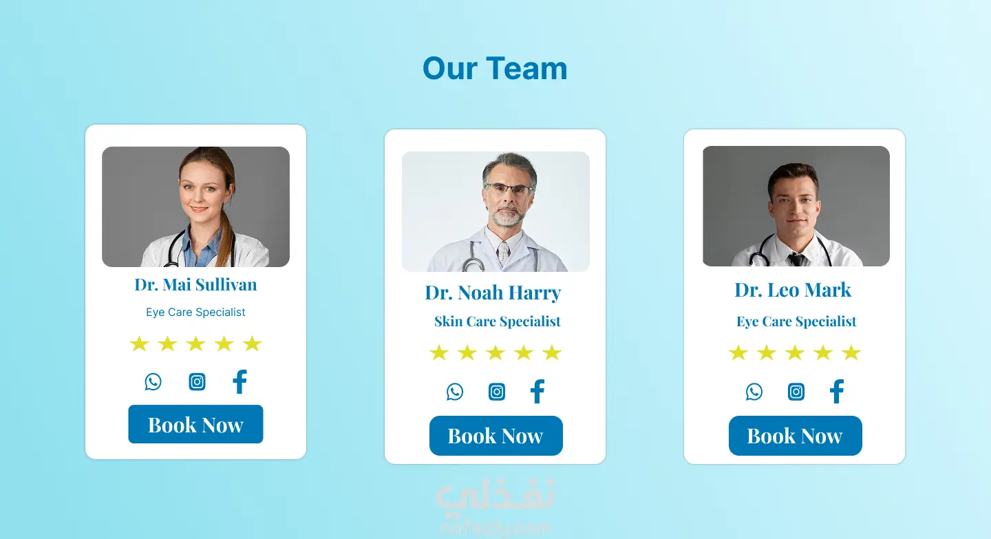 يركز التصميم على تقديم تجربة مستخدم واضحة وبسيطة تساعد الزائر على الوصول إلى المعلومات الطبية وحجز الموعد بسهولة. كما تم استخدام ألوان هادئة مرتبطة بالمجال الطبي مع تصميم نظيف يعزز الثقة لدى المستخدم.