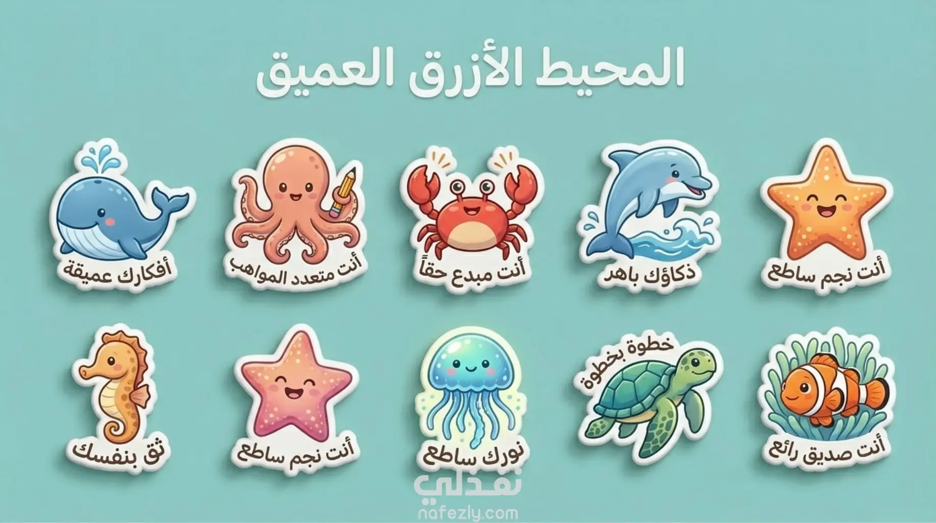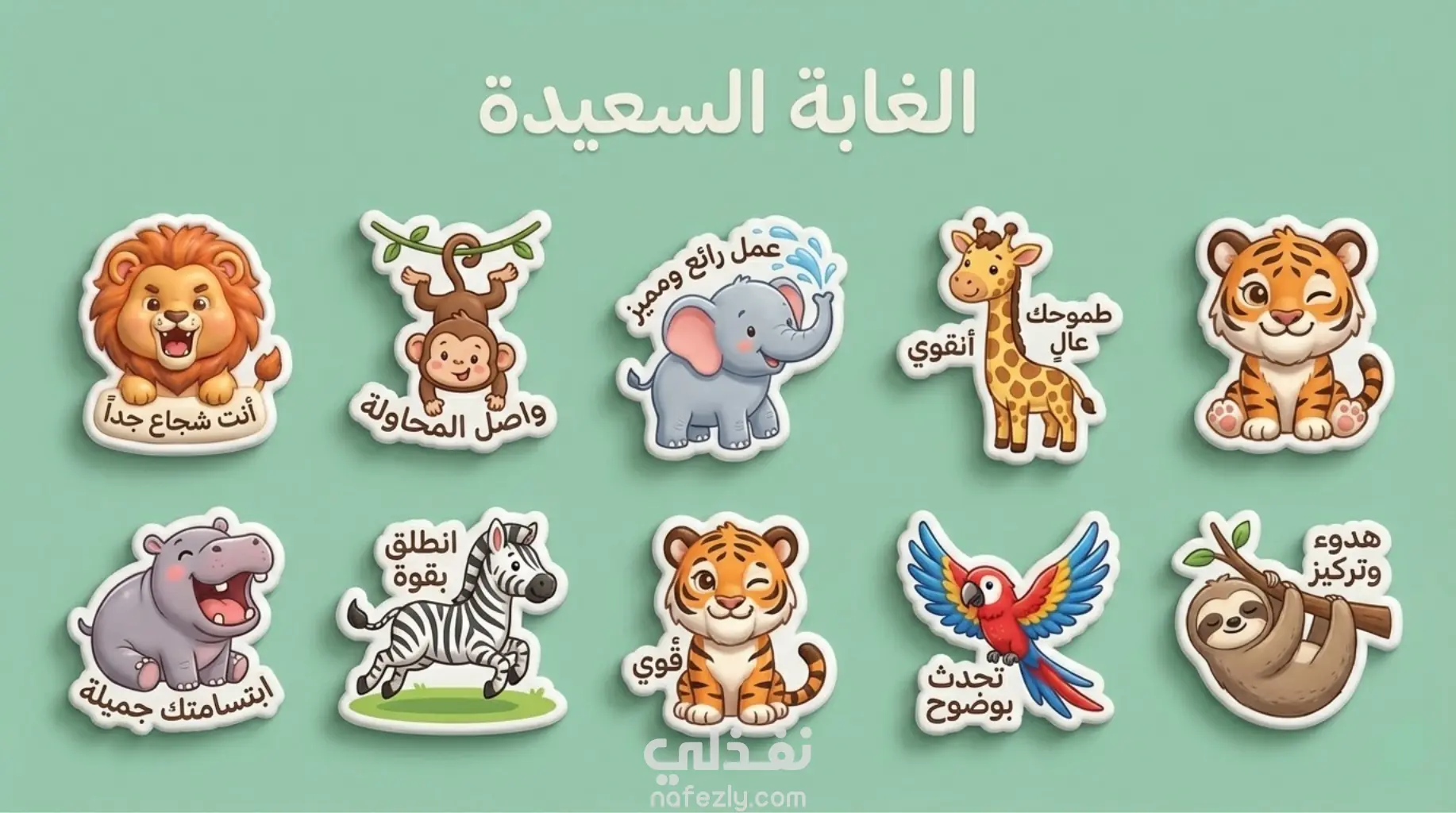 مجموعة ملصقات أطفال متنوعة وملونة تضم شخصيات حيوانات لطيفة مع عبارات تحفيزية إيجابية تساعد على تشجيع الأطفال وتعزيز ثقتهم بأنفسهم بطريقة ممتعة وجذابة.