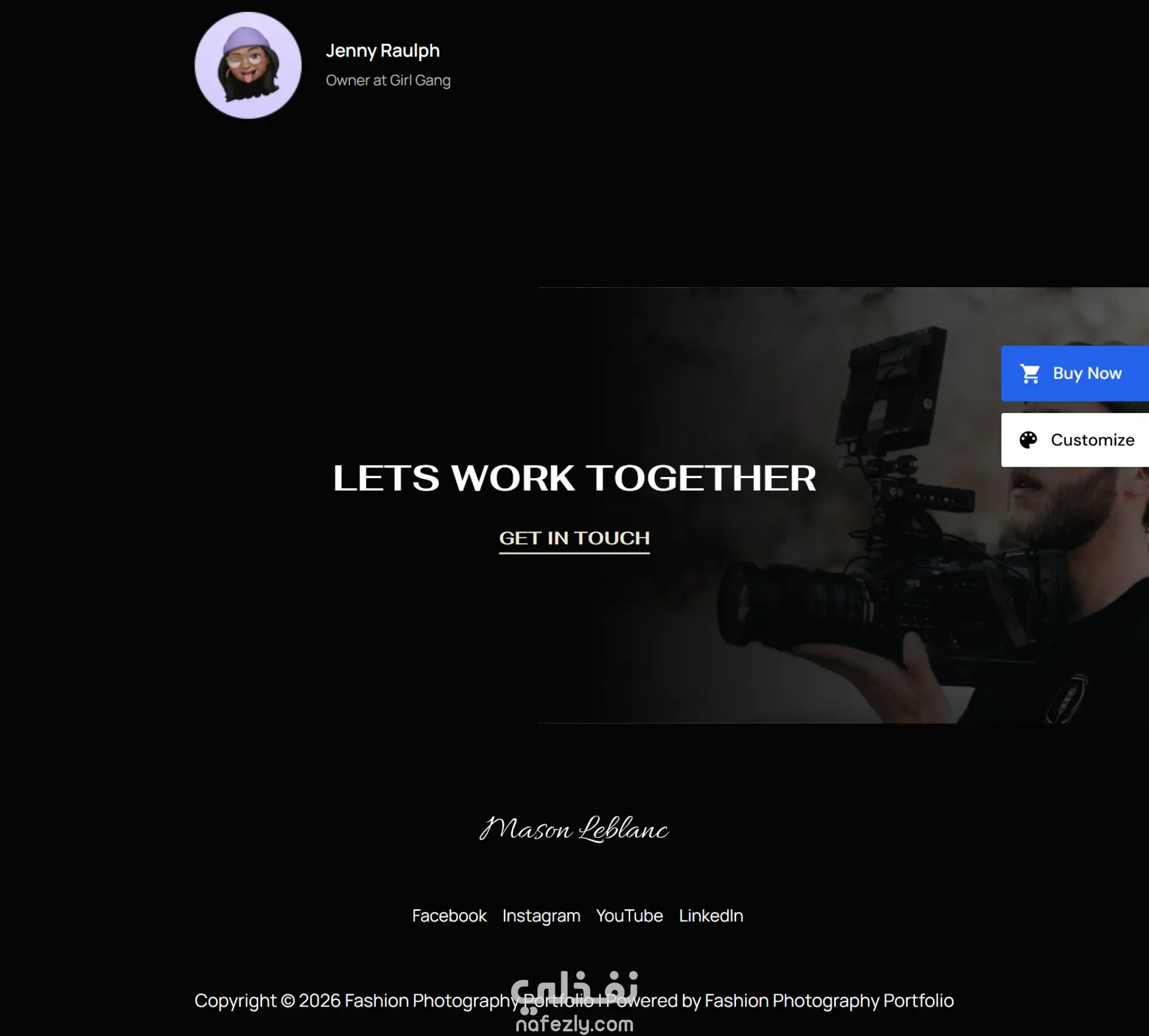 موقع بورتفوليو احترافي لعرض أعمال التصوير الفوتوغرافي الخاصة بالأزياء. تم تصميم الموقع بأسلوب بصري أنيق يركز على إبراز الصور بجودة عالية مع تصميم بسيط وجذاب يسلط الضوء على الأعمال الفنية. يتضمن الموقع معرض صور وتنقّل سهل وتصميم متجاوب يعمل على مختلف الأجهزة.