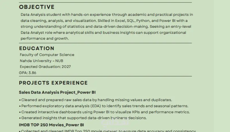 هل قدمت على وظائف كتير ومفيش رد؟ غالبًا المشكلة مش في خبرتك… المشكلة في الـ CV. أنا هساعدك تحوّل سيرتك الذاتية لنسخة احترافية: ✔ منظمة ✔ واضحة ✔ جذابة ✔ ومتوافقة مع أنظمة ATS اللي بتفلتر السير الذاتية قبل ما توصل للـ HR أنا بهتم إني أفهم خبرتك كويس الأول، وبعدين أعيد صياغتها بطريقة قوية تخلي صاحب العمل يلاحظك من أول نظرة. الخدمة تشمل: إعادة كتابة المحتوى باحتراف تنسيق وتصميم عصري وأنيق تحسين الكلمات المفتاحية نسخة جاهزة PDF تعديل لحد ما تكون راضي/ة 100% لو عايز CV يفتح لك باب مقابلات أكتر، أنا جاهزة أساعدك