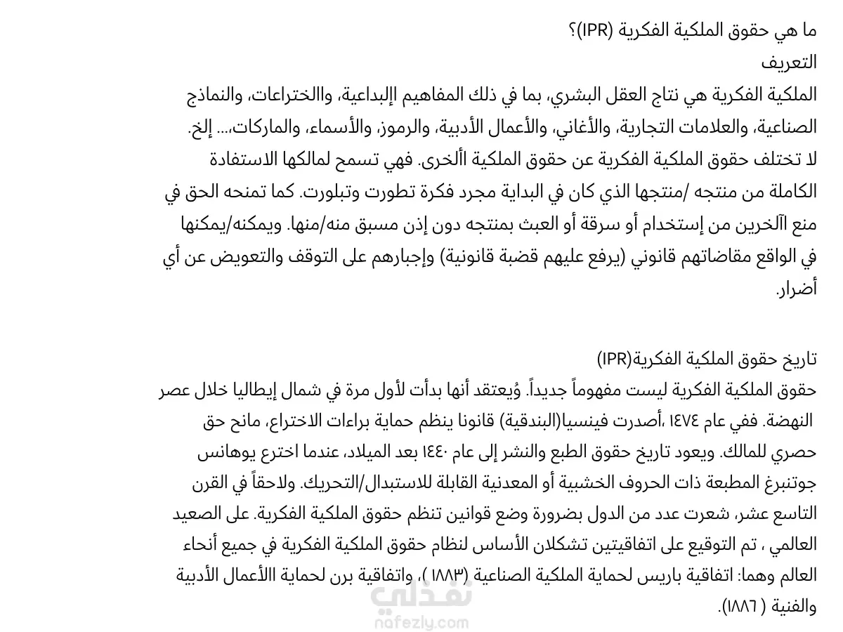 تمت ترجمة هذا المقال المتخصص في قانون الملكية الفكرية من اللغة الإنجليزية إلى العربية، مع التركيز على تقديم صياغة قانونية رصينة تتناسب مع الأنظمة التشريعية العربية. أبرز نقاط العمل: دقة المصطلحات: ترجمة دقيقة لمفاهيم مثل (Intellectual Property Rights)، (Work Product)، و (Moral Rights). التدقيق اللغوي: ضمان خلو النص من الركاكة الآلية وتقديم محتوى مترجم بروح النص الأصلي. التنسيق الاحترافي: تنظيم الفقرات والعناوين الفرعية باستخدام برنامج Word لضمان سهولة الرجوع للمواد القانونية المذكورة.