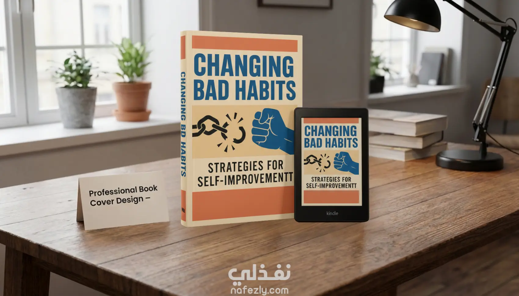 الغلاف يعكس موضوع الكتاب: تغيير العادات السيئة واستراتيجيات تحسين الذات، باستخدام عناصر بصرية قوية مثل صورة كسر القيود للتعبير عن التحرر والتطور الشخصي.
