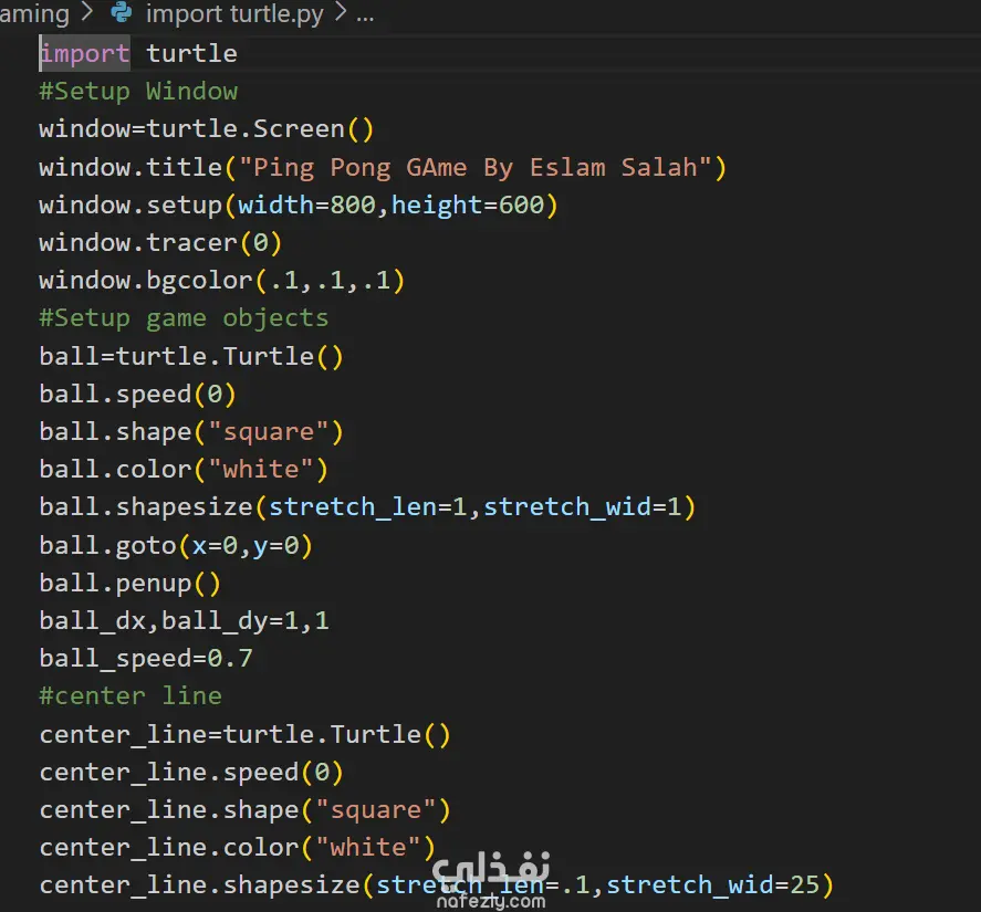 قمت بتطوير لعبة Ping Pong ثنائية اللاعبين باستخدام لغة Python بالاعتماد على مكتبة turtle لإنشاء واجهة رسومية تفاعلية بالكامل.