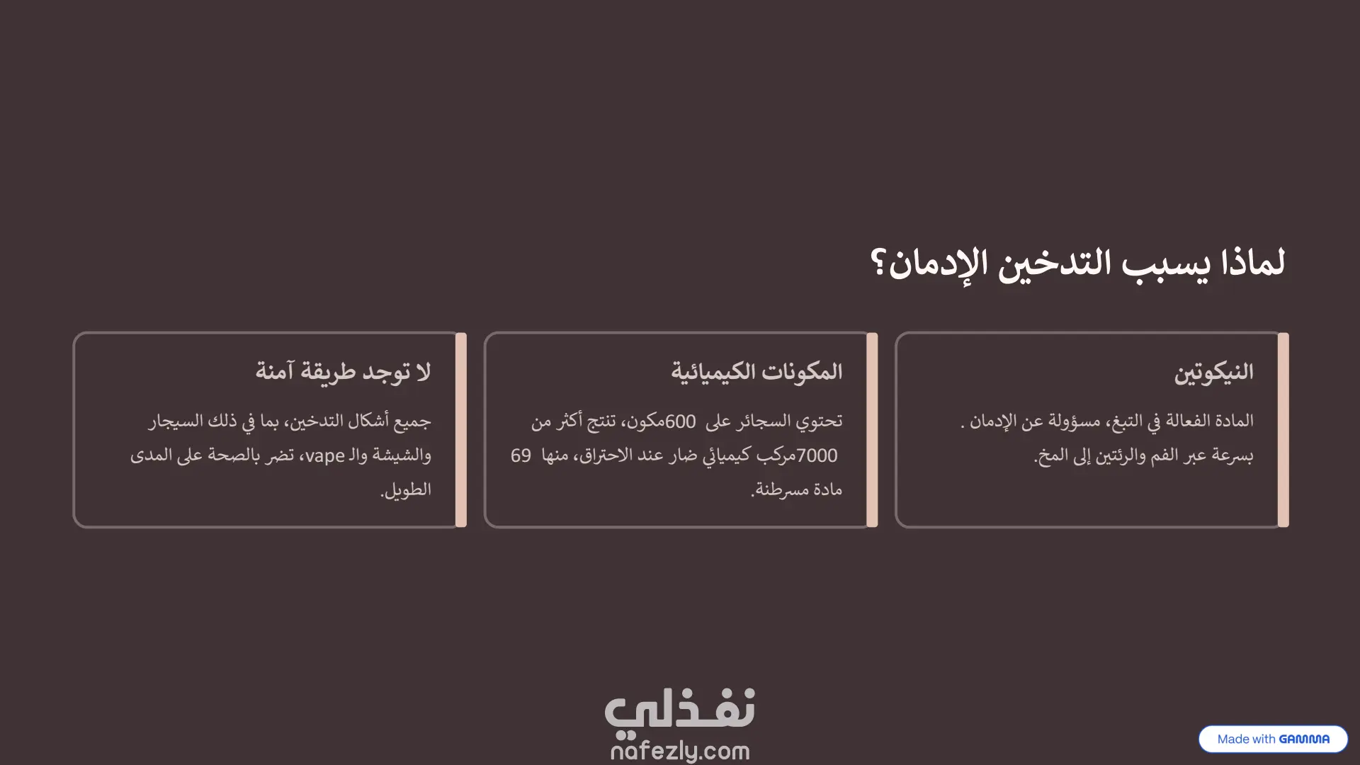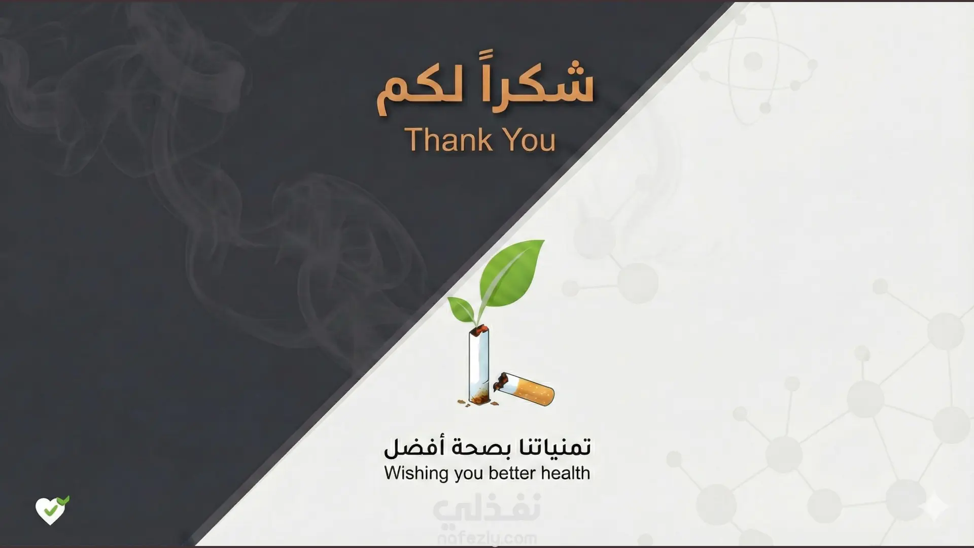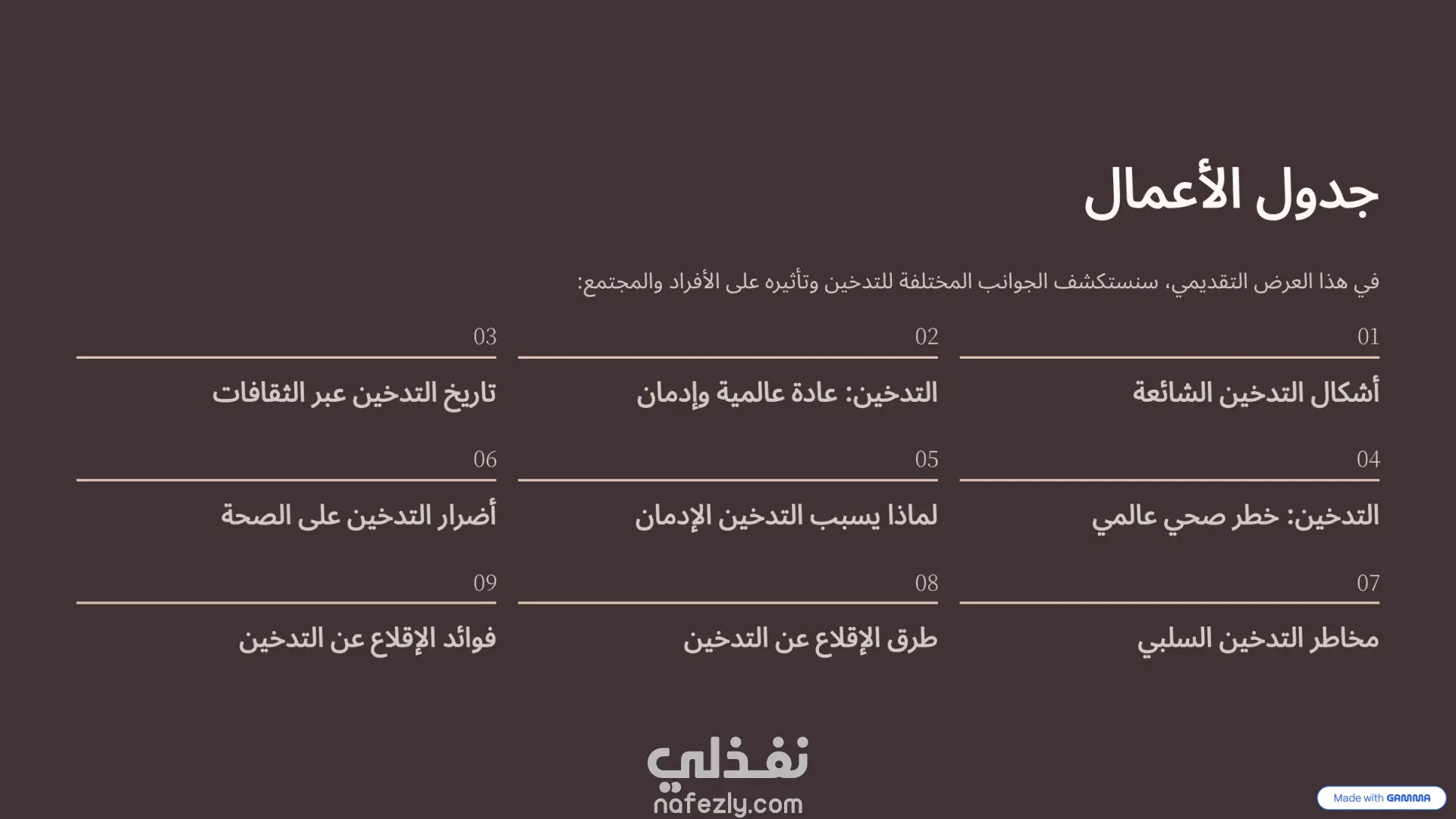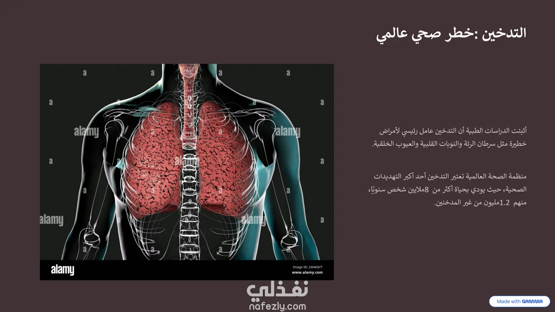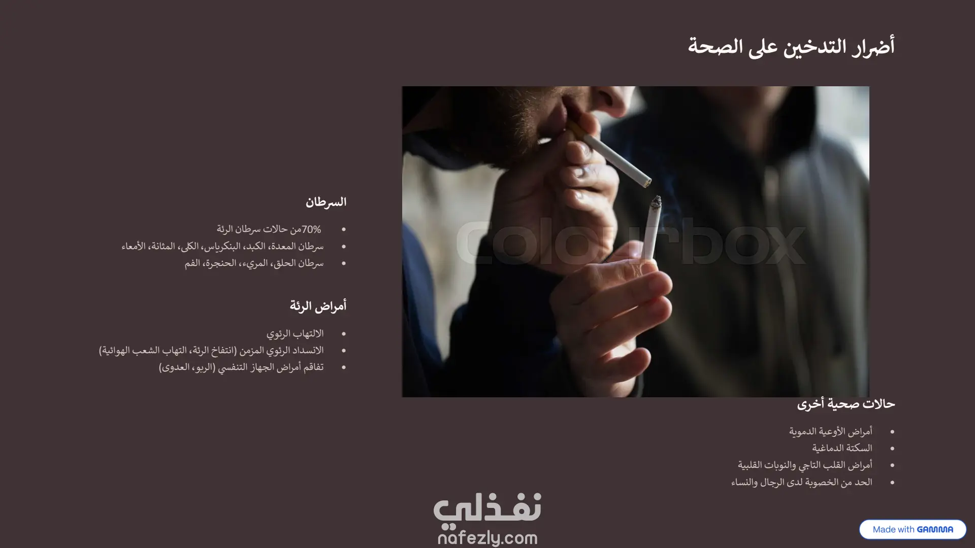 هذا العرض التقديمي هو نموذج ممتاز لكيفية دمج أدوات الذكاء الاصطناعي مع التعديل البشري لإنشاء محتوى بصري جذاب. طريقة الإنشاء (الذكاء الاصطناعي + التعديل اليدوي): تم بناء الأساس والهيكل التصميمي الأولي لهذا العرض باستخدام أداة الذكاء الاصطناعي "Gamma" ، وهو ما يتضح من العلامات المائية في أسفل الشرائح. بعد توليد المحتوى والتصميم المبدئي، تم تصدير العرض وتحسينه وتعديله يدوياً بالكامل داخل برنامج Microsoft PowerPoint. سمح هذا التعديل اليدوي بضبط النصوص، وتخصيص تدفق المعلومات، وإضافة اللمسات النهائية الدقيقة التي لا يمكن للذكاء الاصطناعي إتقانها بمفرده، مما يجعله خلفية بصرية مثالية ومجهزة بعناية التصميم والهوية البصرية: لوحة الألوان (Color Palette): يعتمد العرض على استخدام ديناميكي للألوان لخدمة السياق النفسي لكل شريحة: يبدأ بألوان هادئة ومحايدة مثل الأزرق الفاتح في المقدمة.ينتقل إلى ألوان ترابية دافئة (درجات البني والبيج المتدرج) عند استعراض الجانب التاريخي للتدخين .يعتمد على خلفيات داكنة جداً (الأسود والرمادي الغامق) عند الحديث عن الأضرار الصحية الجسيمة والسرطانات ، مما يضفي طابعاً من الجدية والتحذير البصري. التخطيط (Layout): التصميم عصري ونظيف جداً (Clean UI)، يعتمد على مساحات فارغة (White Space) مريحة للعين لتجنب تشتت الانتباه. يستخدم شبكات تنظيمية (Grids) وترقيماً متسلسلاً واضحاً (من 01 إلى 09 في جدول الأعمال والخطوات) العناصر البصرية: يبتعد العرض عن النصوص الكثيفة، ويستبدلها بصور فوتوغرافية عالية الجودة ، وأيقونات بسيطة، وعناصر إنفوجرافيك متقدمة (مثل خريطة التوزيع العالمي بنظام النقاط الملونة) ، مما يسهل استيعاب الإحصائيات المعقدة بسرعة.